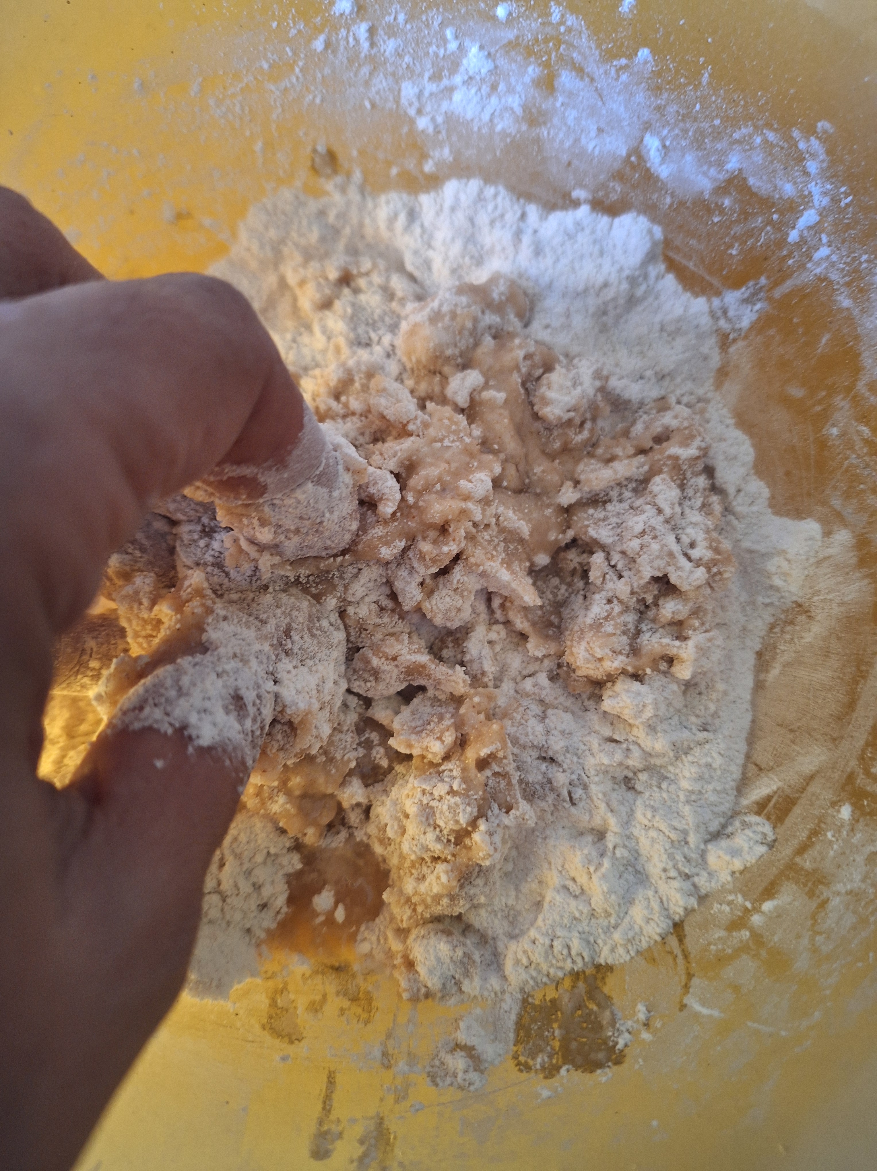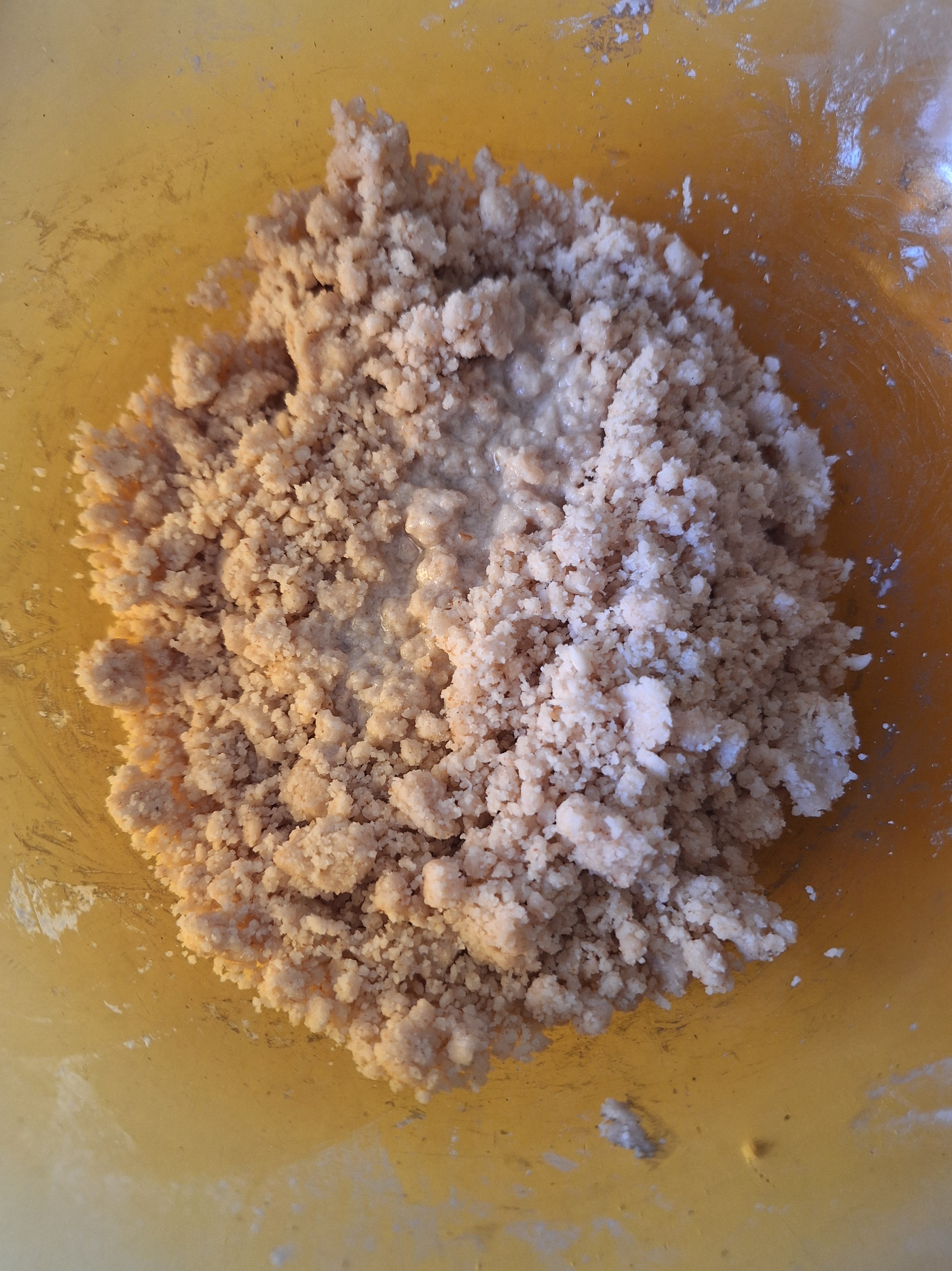 Añade el aceite de coco (mejor si está un poco sólido) y mezcla con la harina pellizcando con los dedos. Agrega el gel de linaza y el agua fría y amasa un poco para integrar todos los ingredientes. Haz una bola, envuelve en film y lleva al frigo 30 minutos.