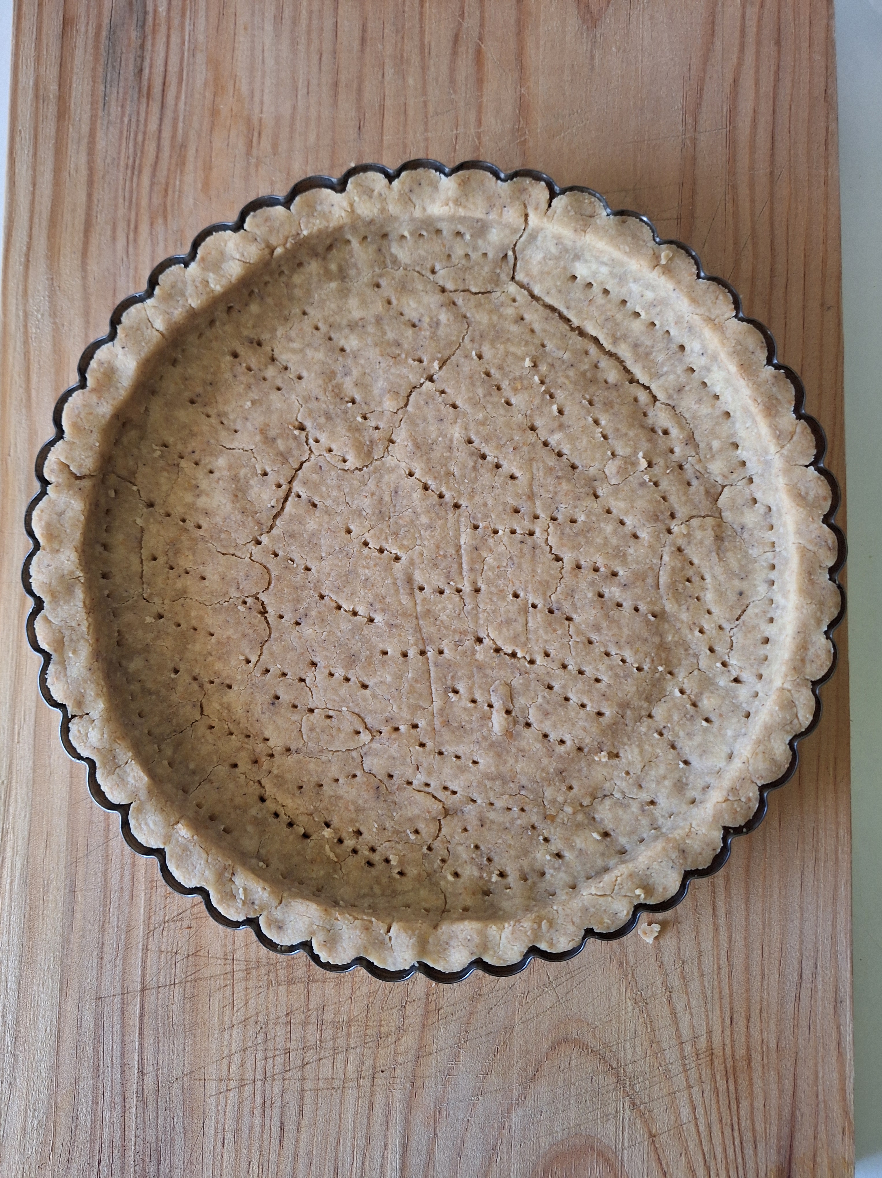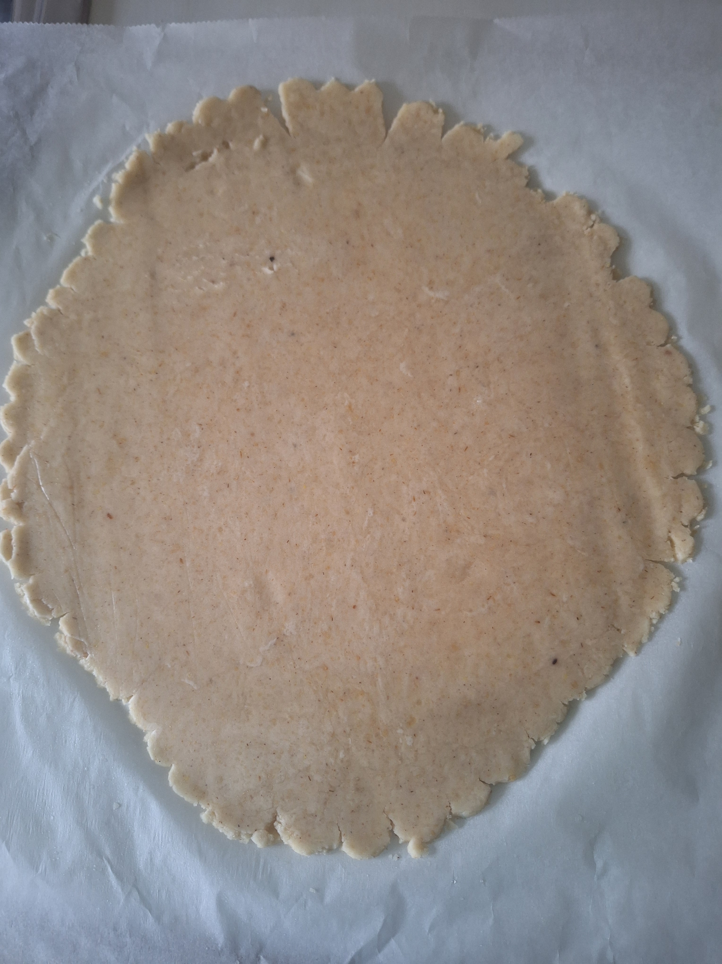 Coloca entre dos láminas de papel vegetal y extiende con el rodillo hasta tener un grosor de unos 3mm. Esta masa se rompe bastante, así que puedes colocarla en la base del molde y extender con las manos (yo lo hago así y queda estupenda). Pincha la base con un tenedor para que no hinche en el horno.
