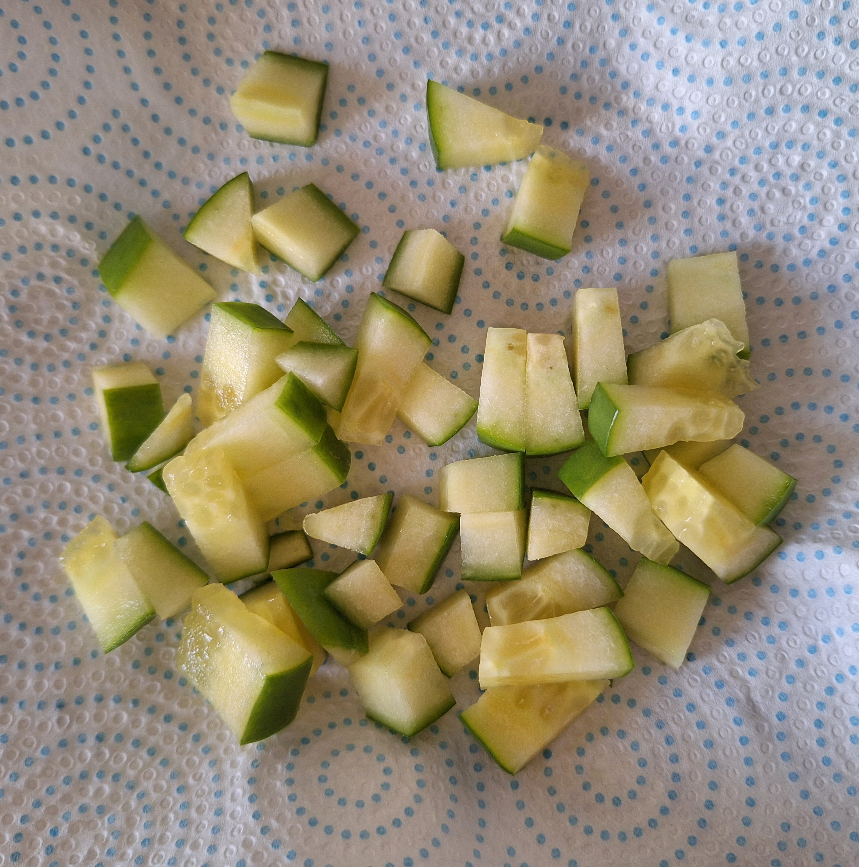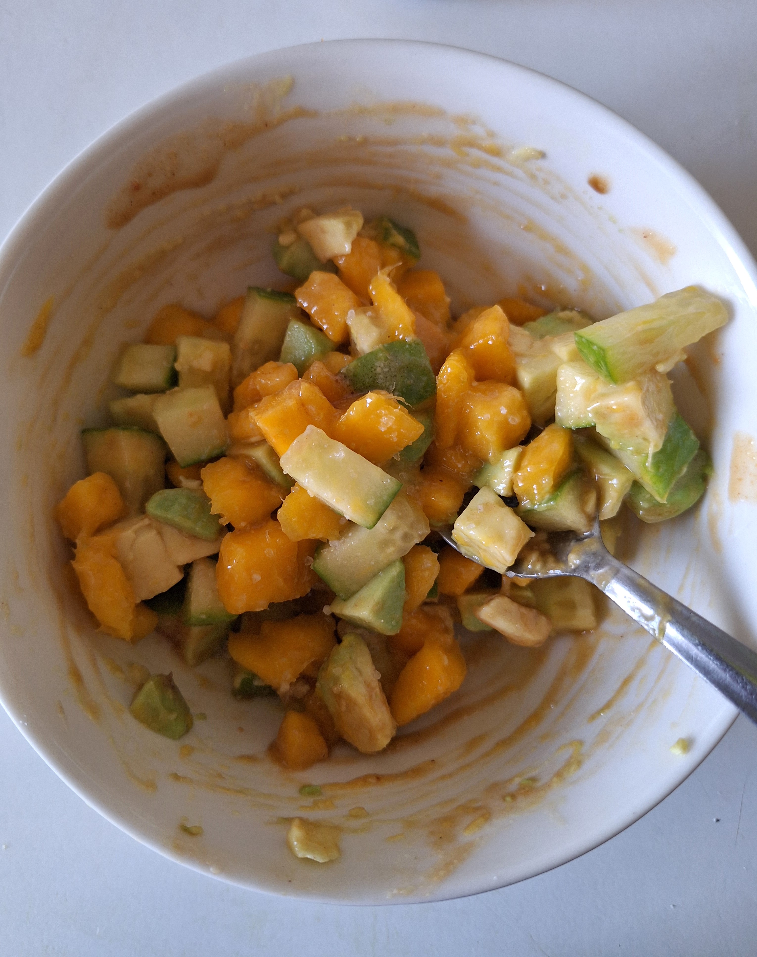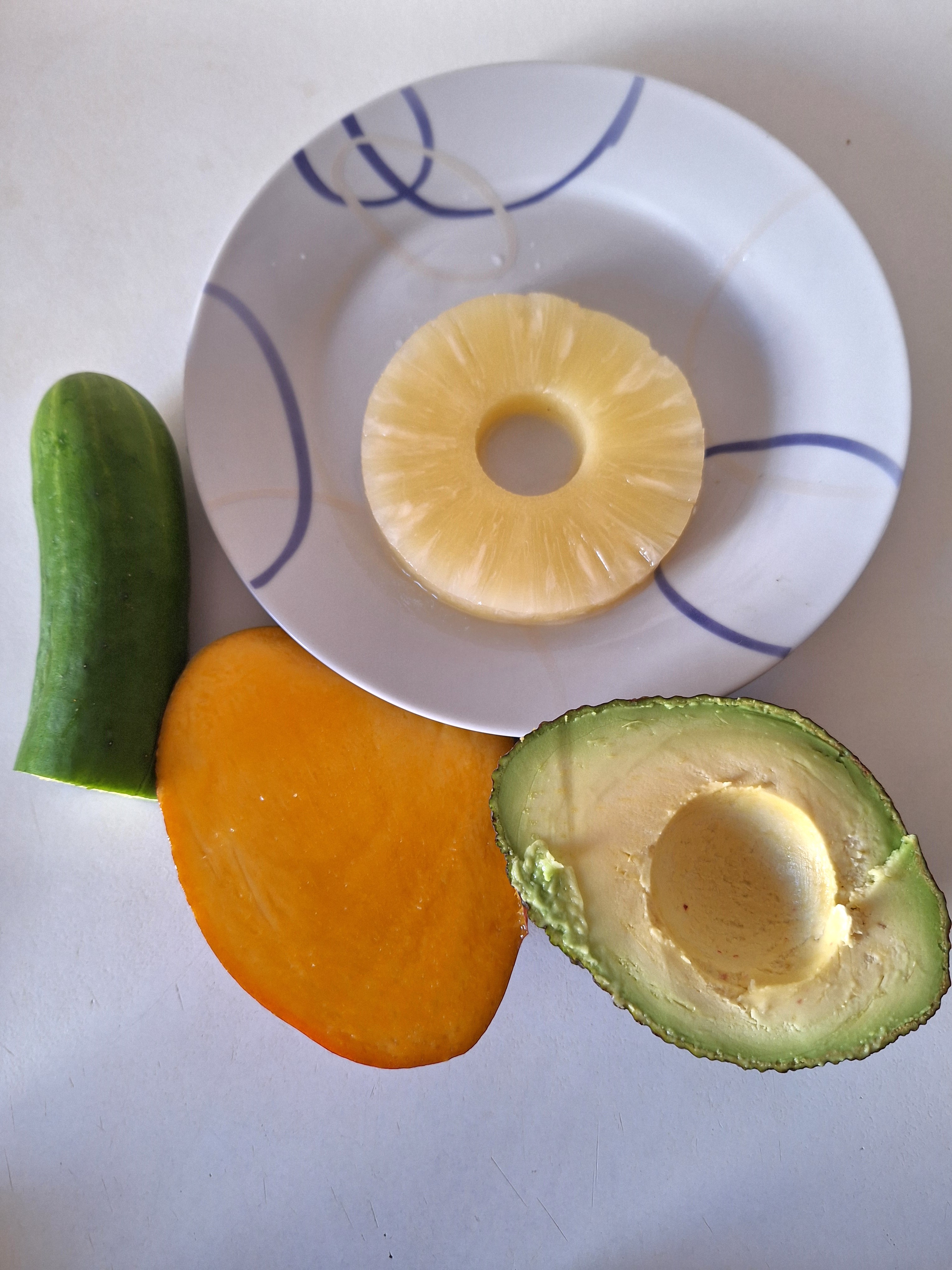 Coloca la piña entre papel absorbente para reducir la humedad. Corta el aguacate, el pepino y el mango en cubos. Coloca el pepino y el mango sobre papel absorbente.