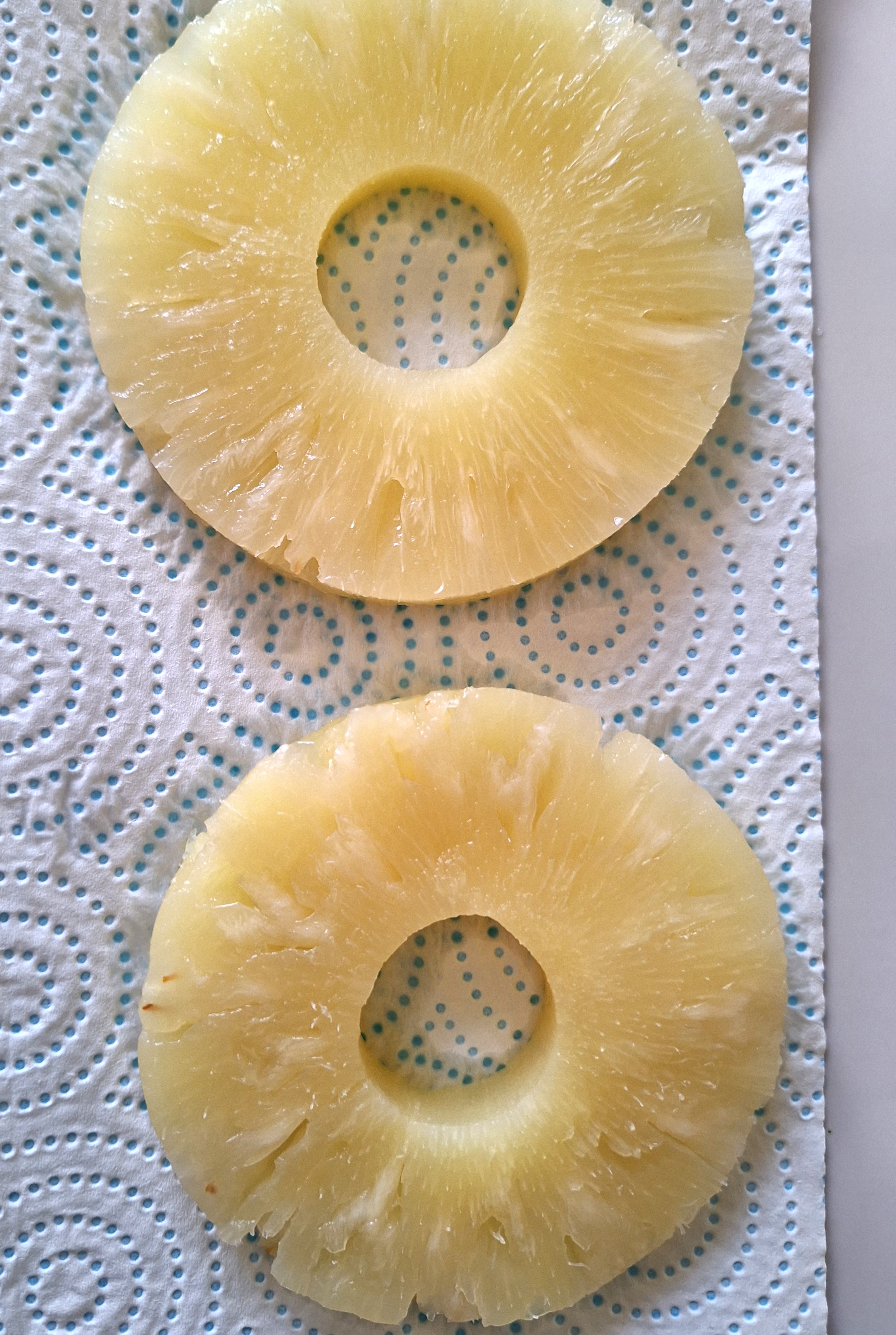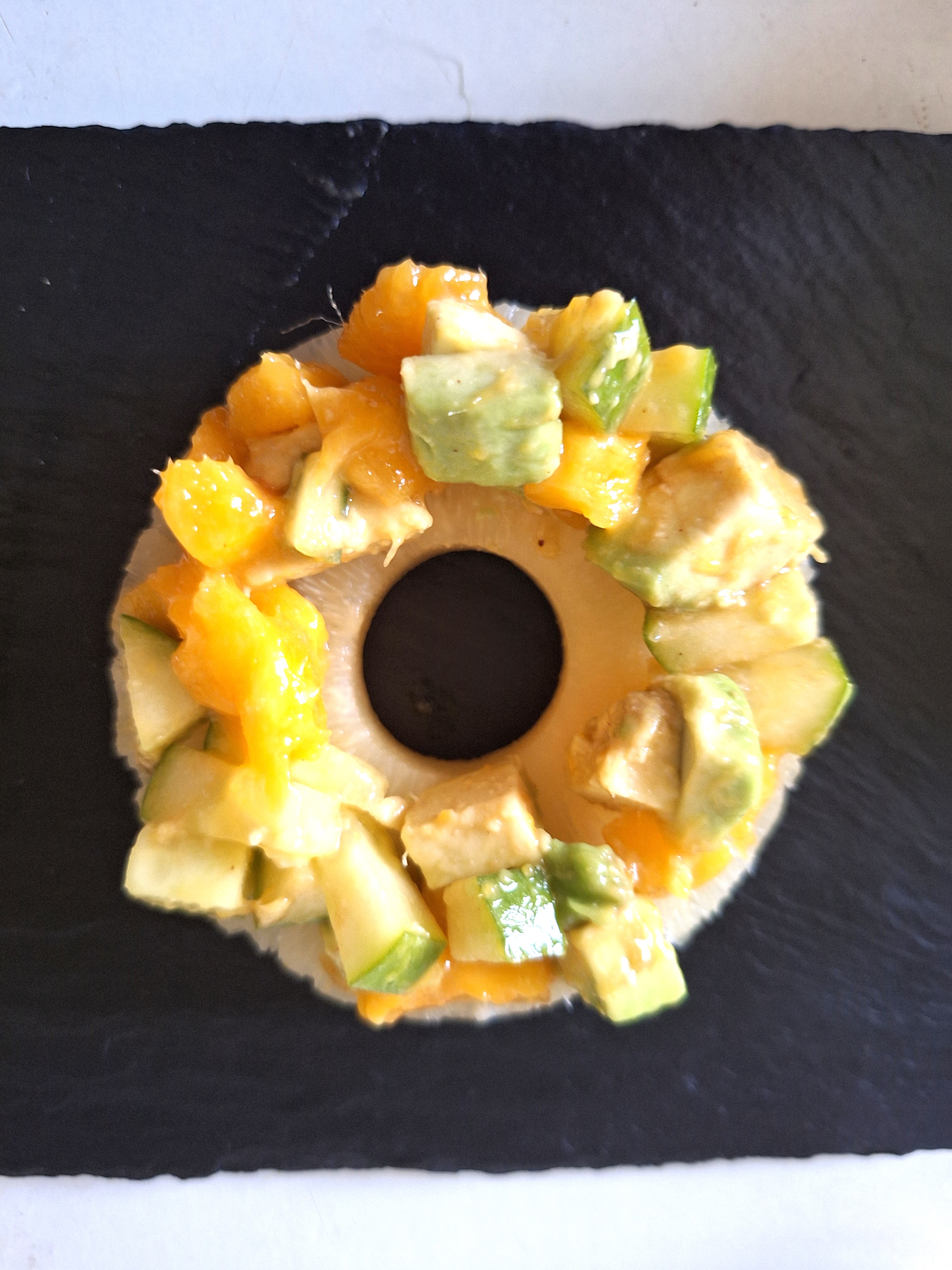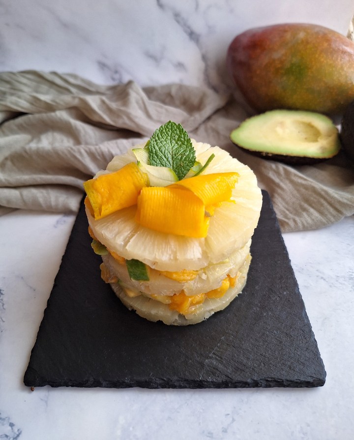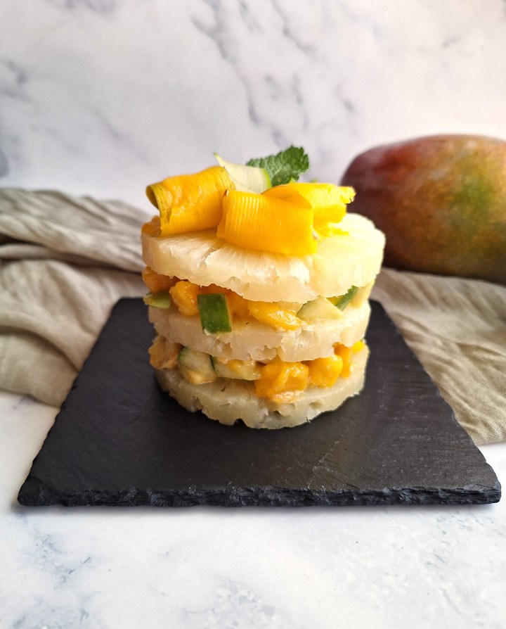 Entonces caí en que los cacahuetes son una legumbre, que siempre se me olvida… Y se me ocurrió la idea de hacer un timbal con todo el sabor del verano: piña, mango, aguacate y pepino y hacer el aliño con crema de cacahuete. La verdad es que el resultado me ha gustado mucho. Podéis hacer el timbal utilizando las rodajas de piña como he hecho yo (que queda más sofisticado), o cortar todos los ingredientes en dados y mezclarlos. Eso es a vuestro gusto. Espero que os guste.