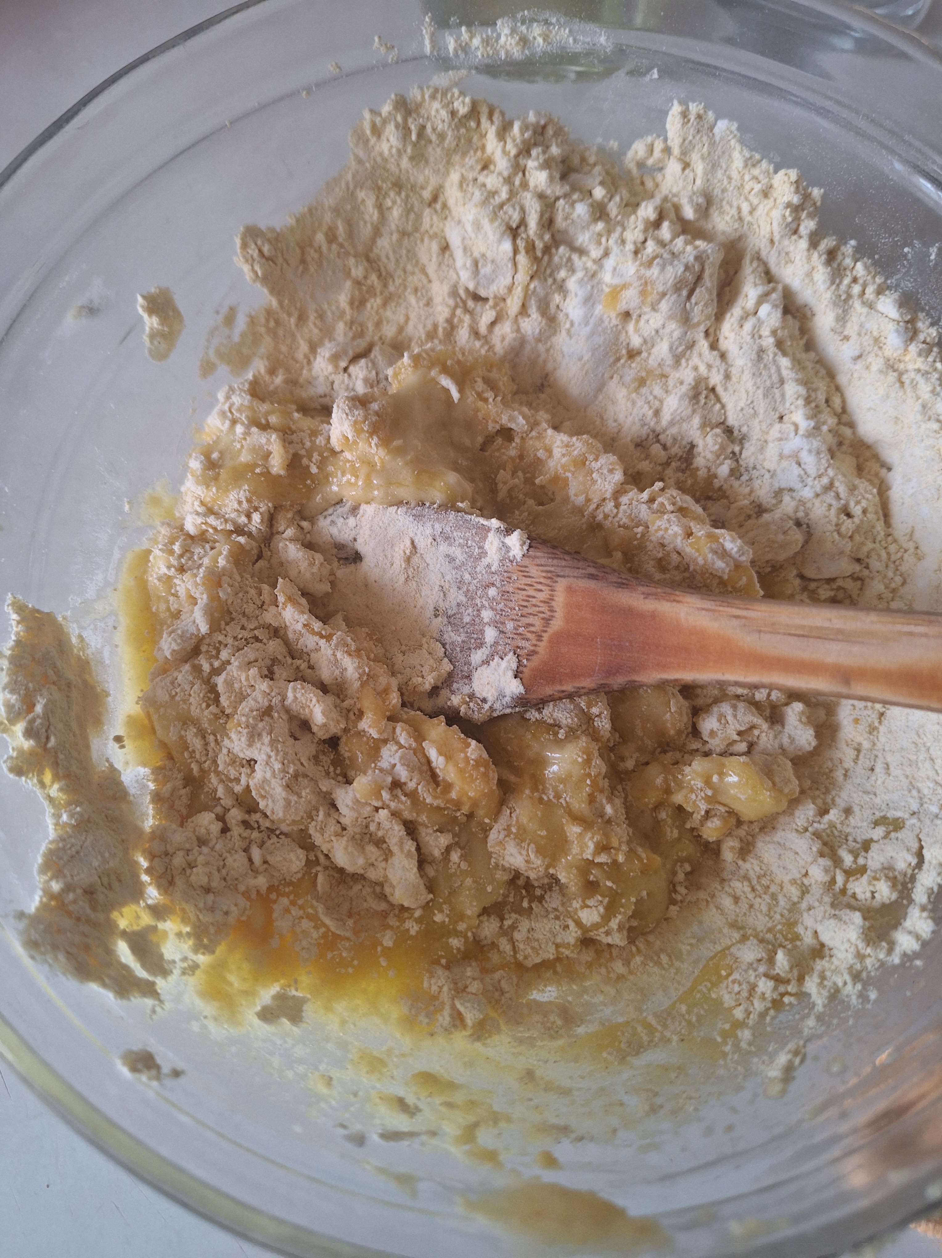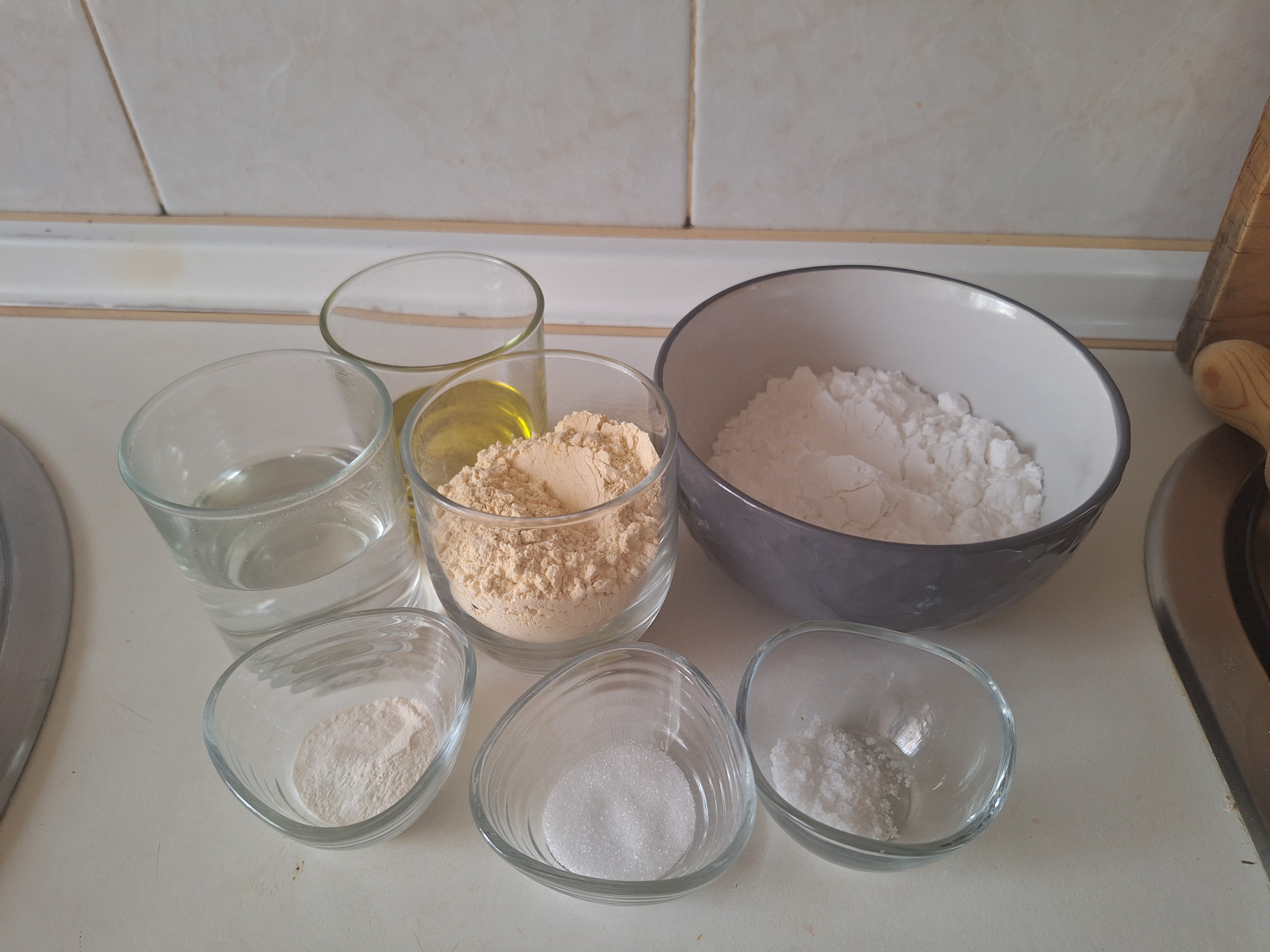 Tamiza los ingredientes secos y mezcla. Agrega el agua y el aceite, mezcla con una cuchara hasta que todo se hidrate. Coloca sobre la mesa y amasa un par de minutos hasta conseguir una masa lisa y bolea.