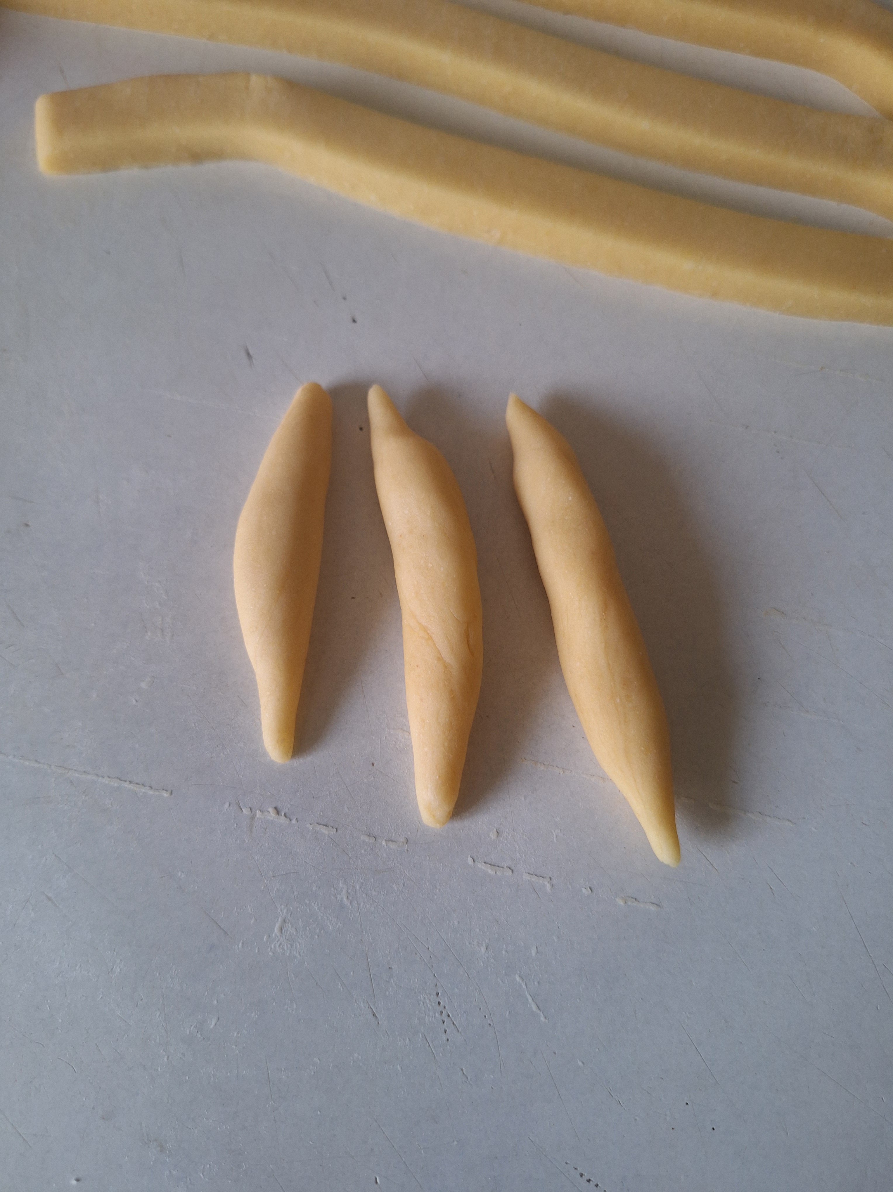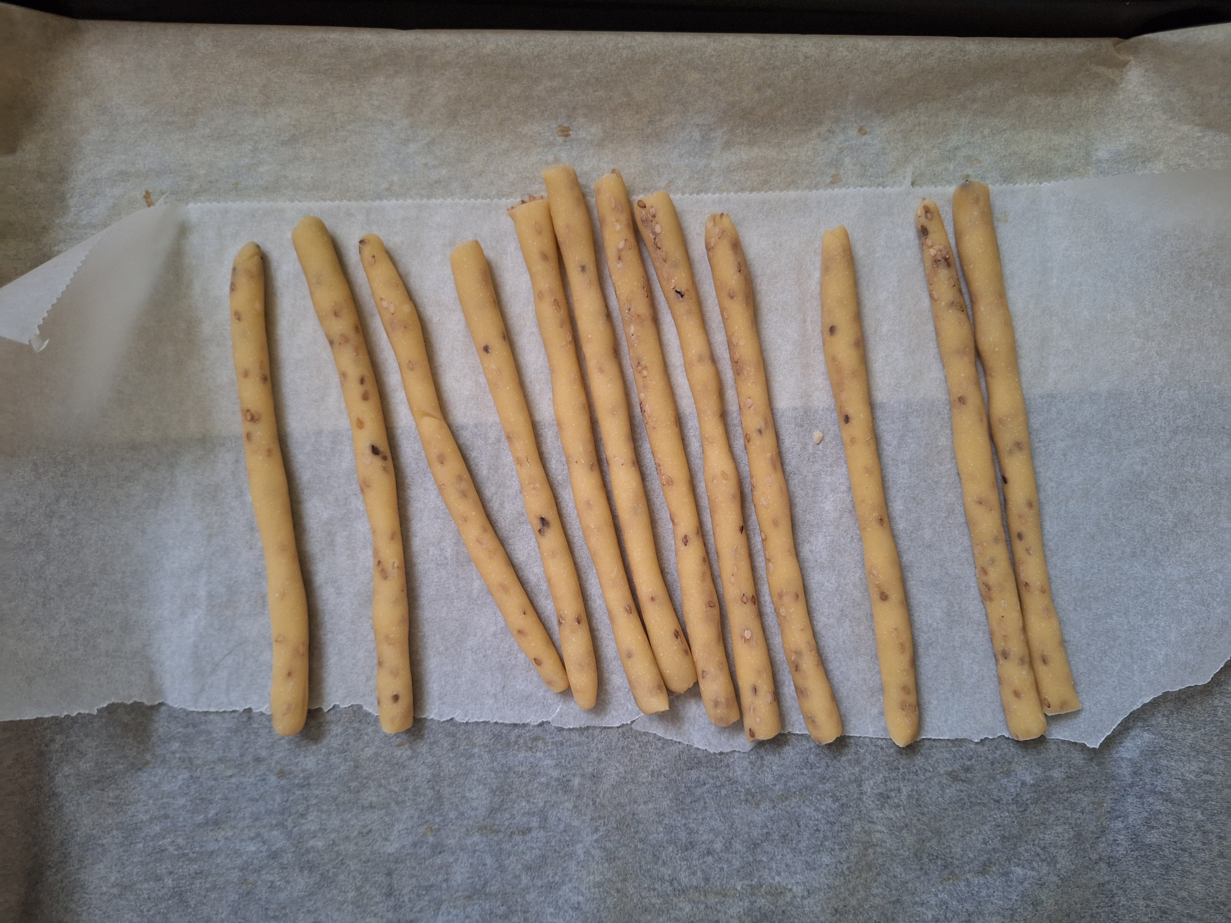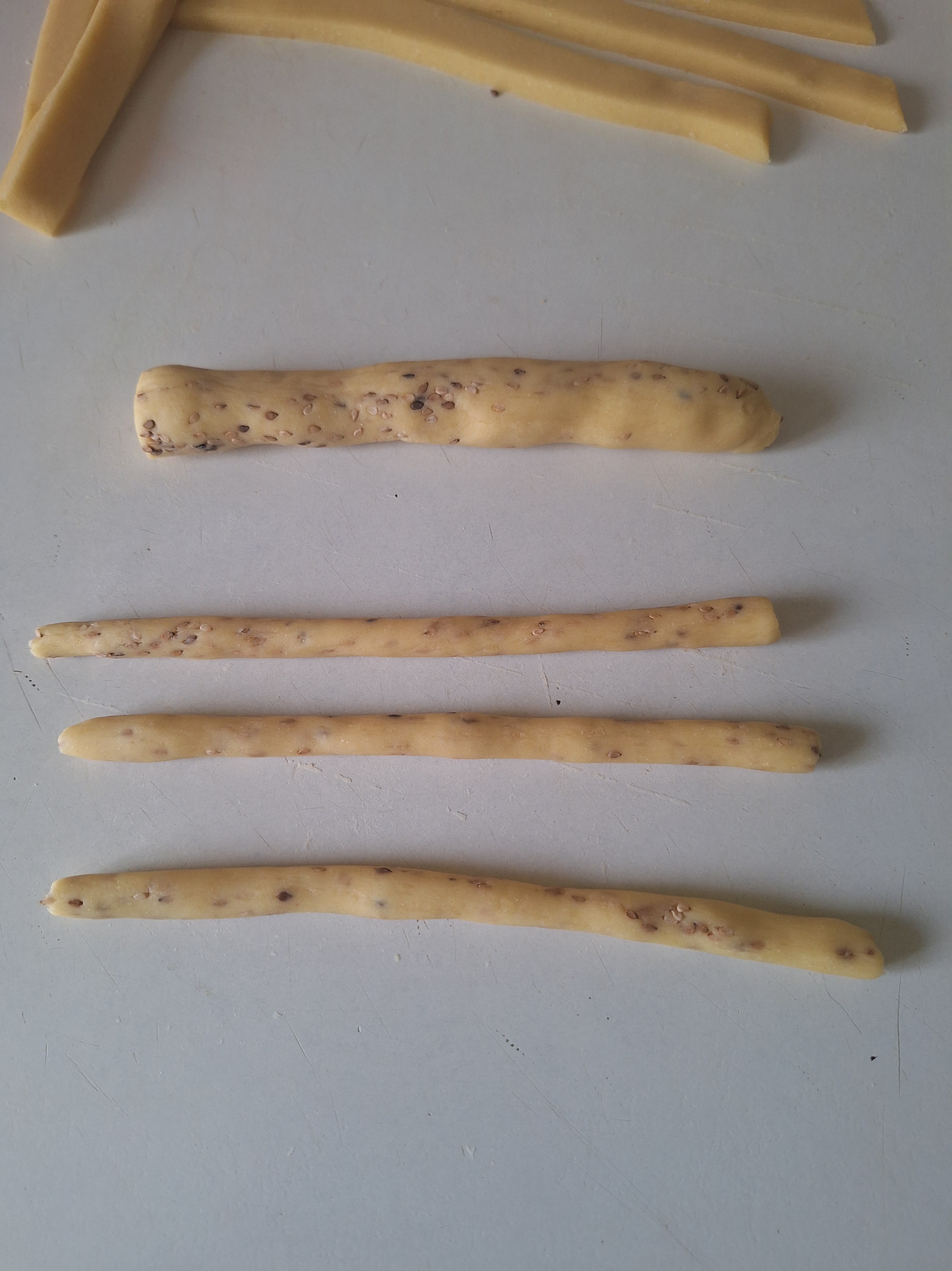 Engrasa ligeramente la mesa y aplana la masa, dándole forma de rectángulo y un grosor de 1 cm Corta en tiras y haz churritos con cada una. Da la forma a los churros de picos y roscos. Para los colines, reboza en semillas de sésamo.