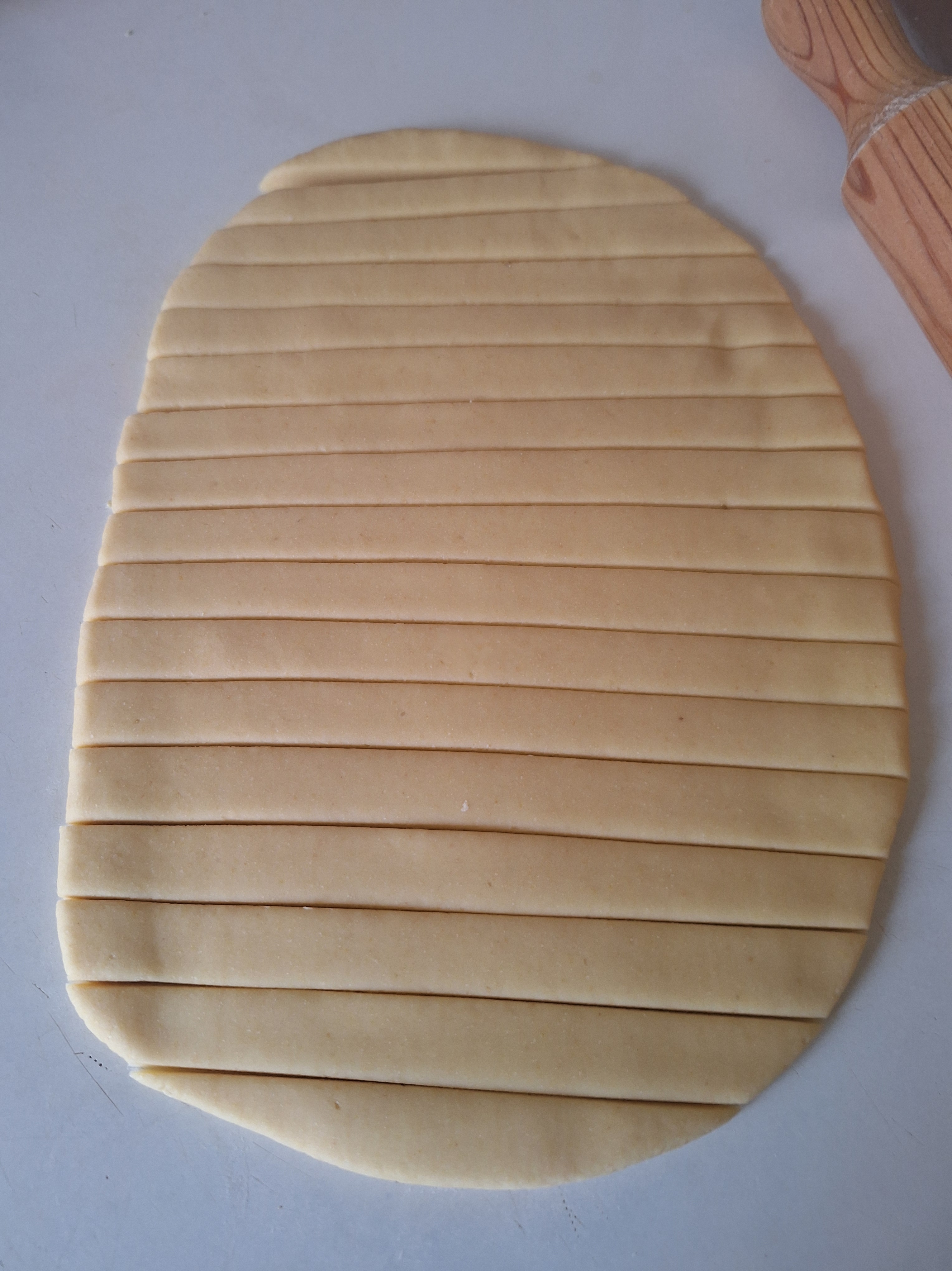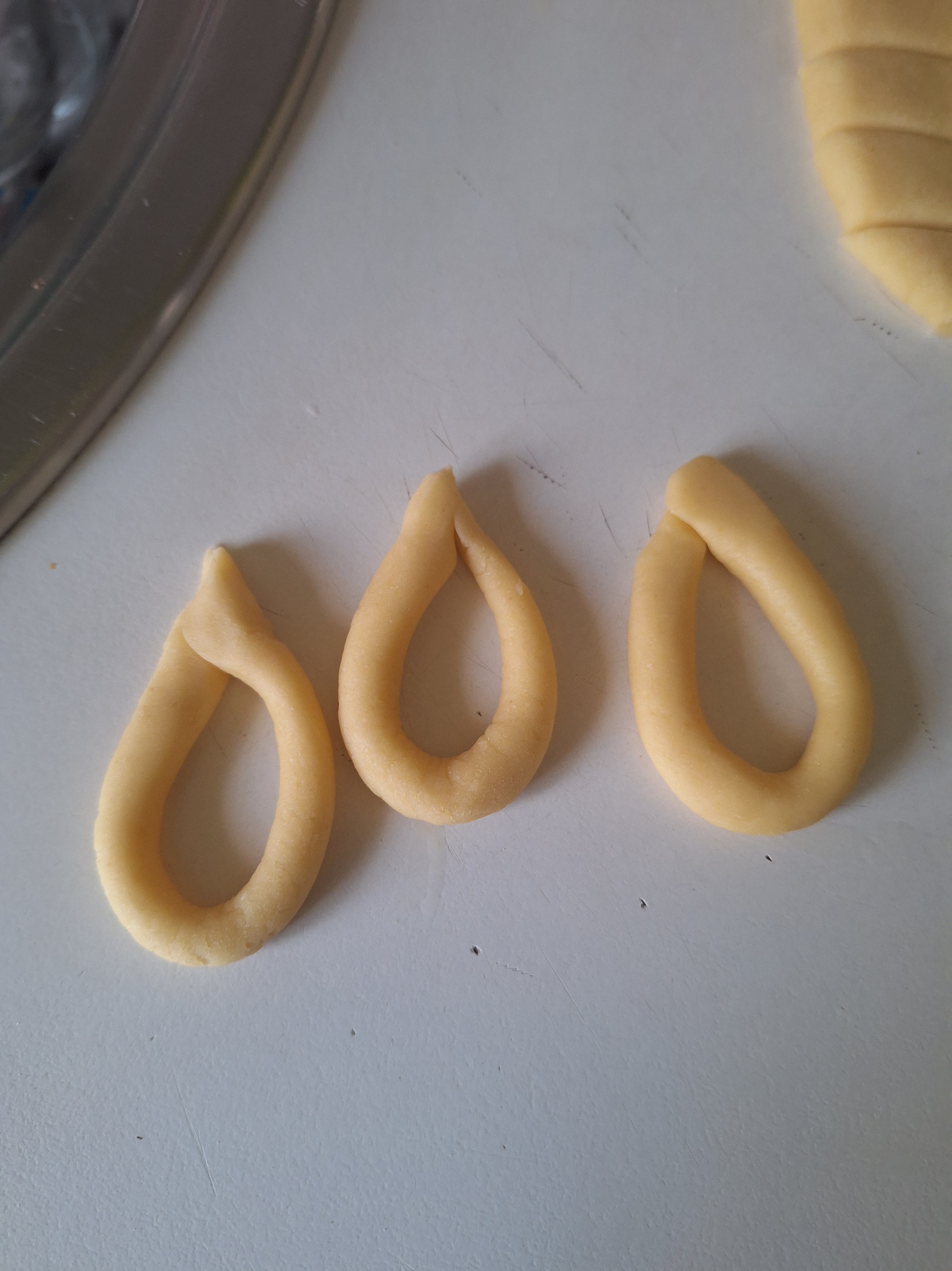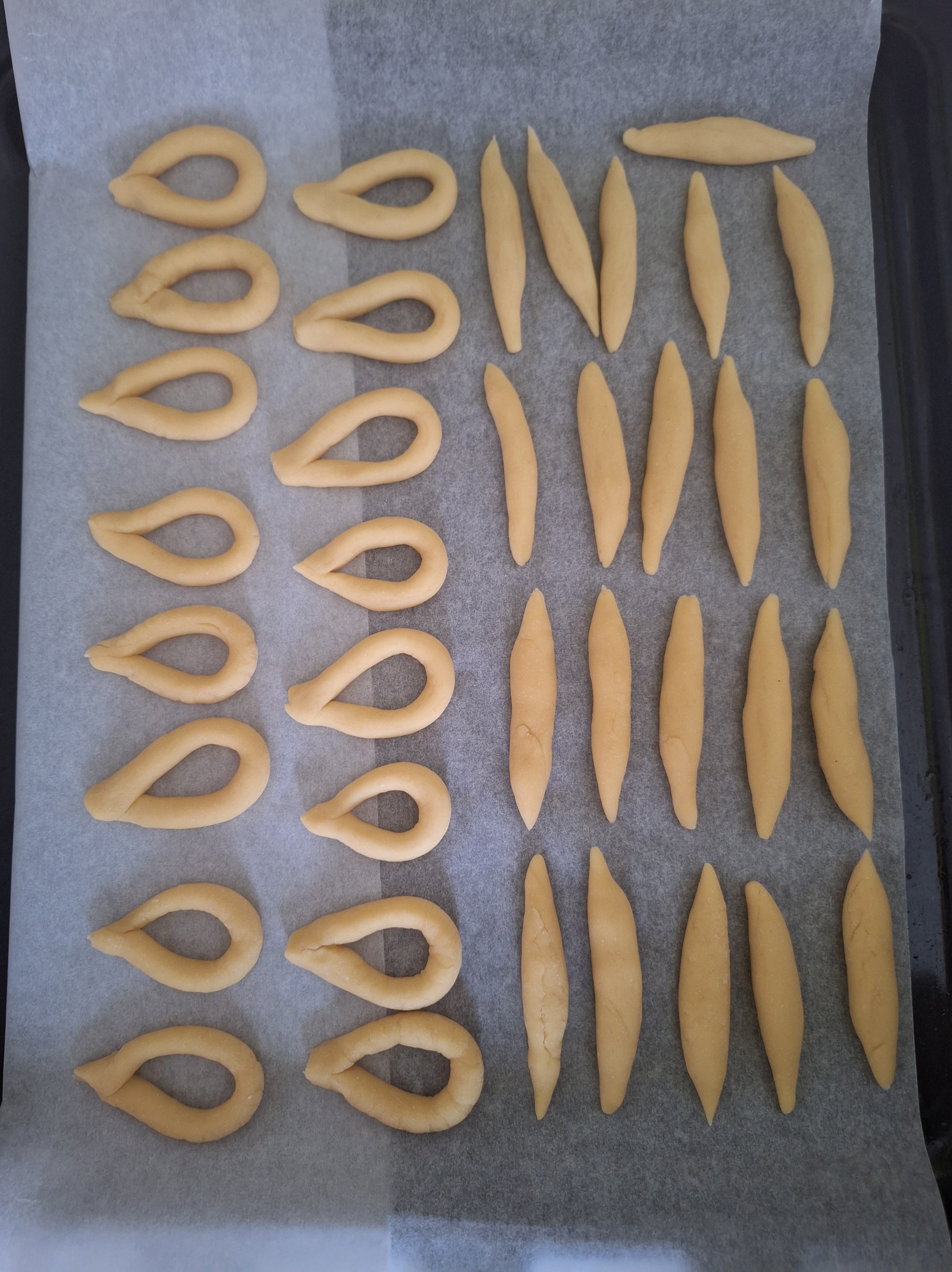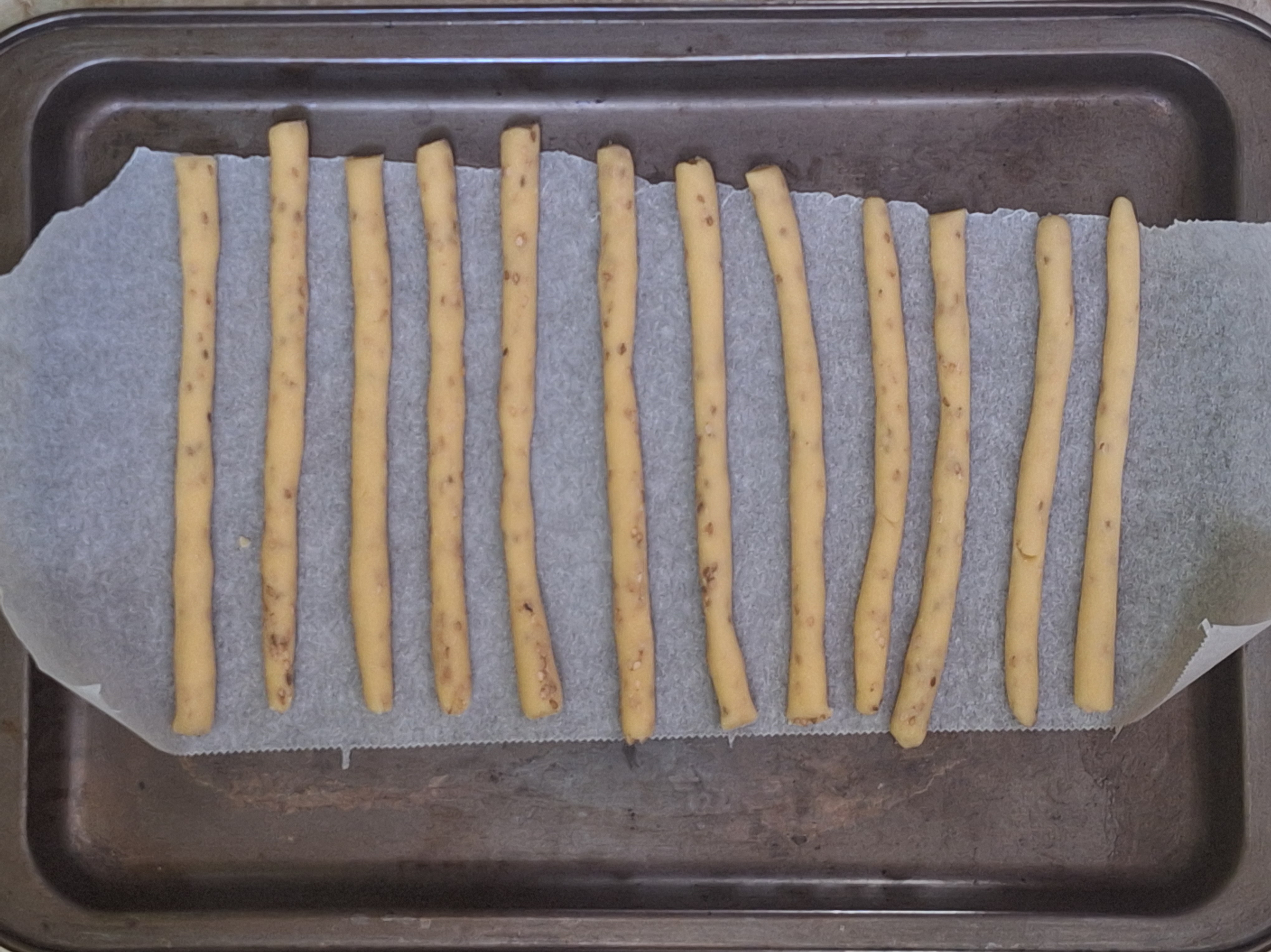 Engrasa ligeramente la mesa y aplana la masa, dándole forma de rectángulo y un grosor de 1 cm Corta en tiras y haz churritos con cada una. Da la forma a los churros de picos y roscos. Para los colines, reboza en semillas de sésamo.