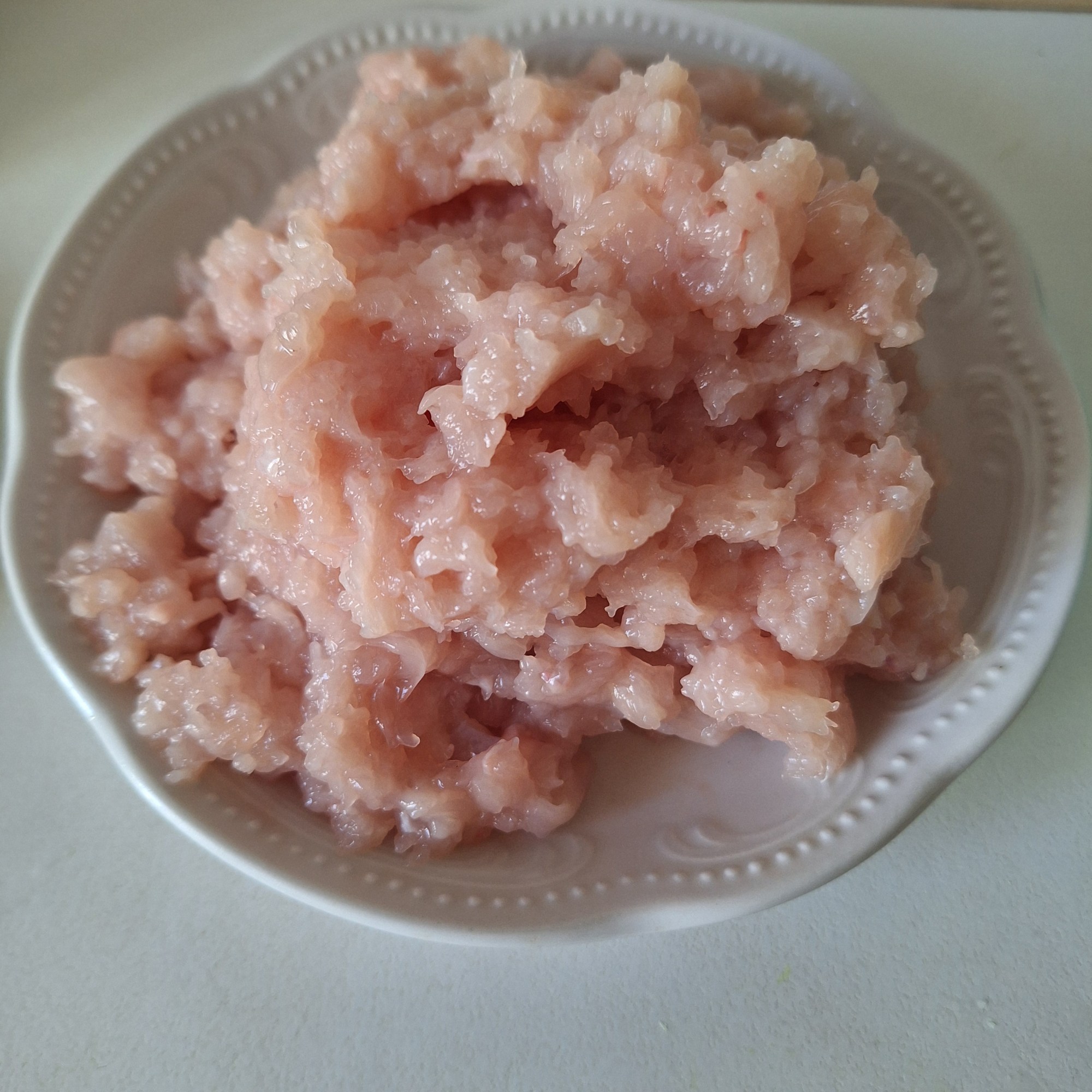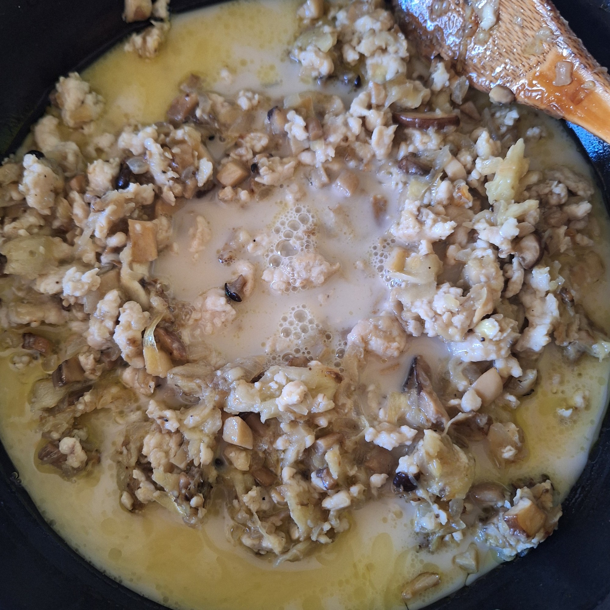 Podéis cortar la pechuga en cubos, pero yo prefiero picar la carne porque me resulta más fácil de manipular y no se me cae por todas partes. También ayuda añadir un poquito de maicena, que da un resultado muy, muy cremoso. Os lo muestro y me decís.