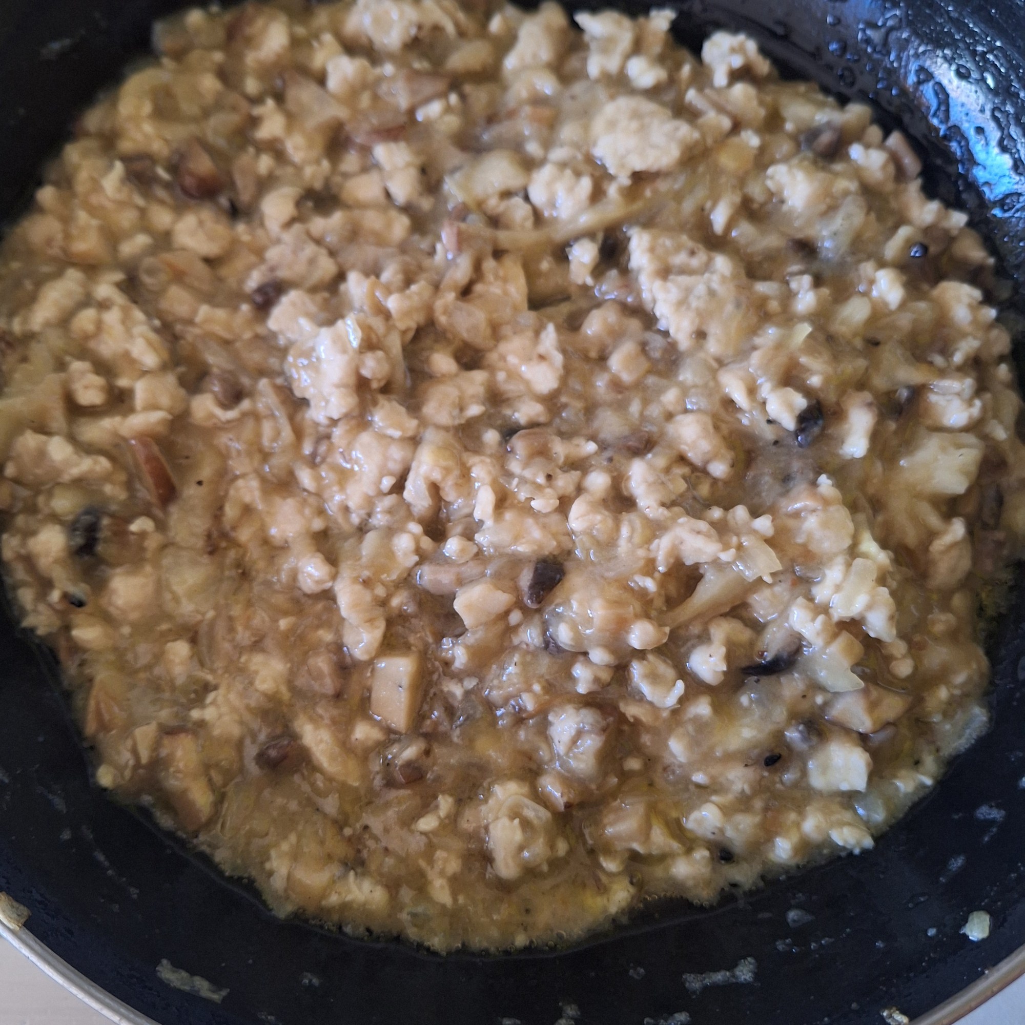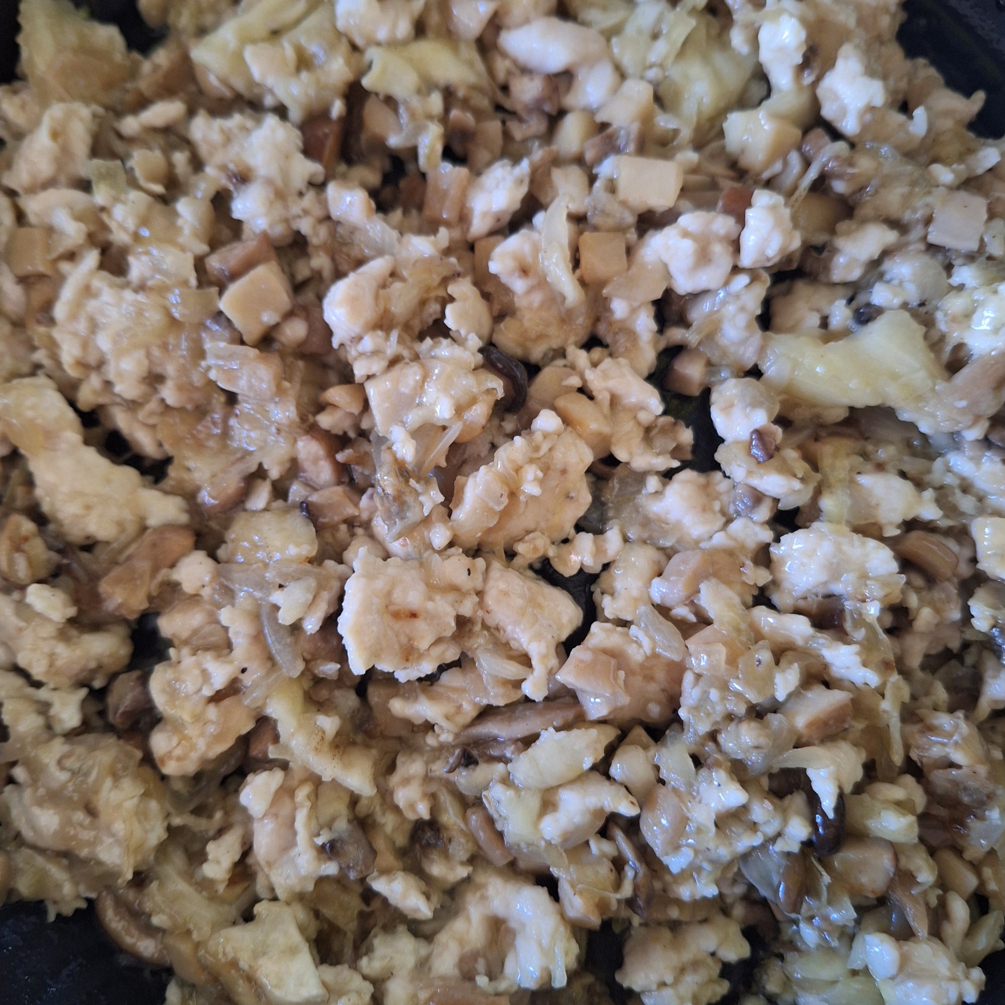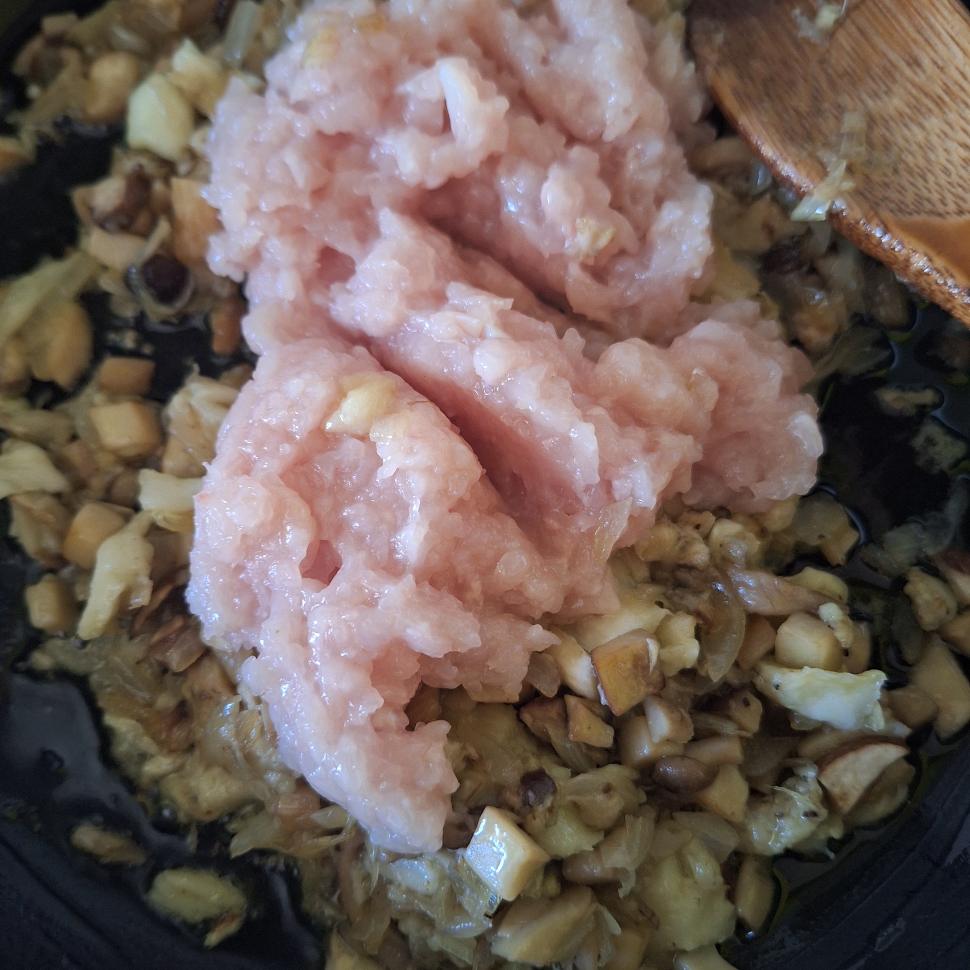 Tritura la pechuga como si fuera carne picada. Corta la cebolla y las setas en brunoise.