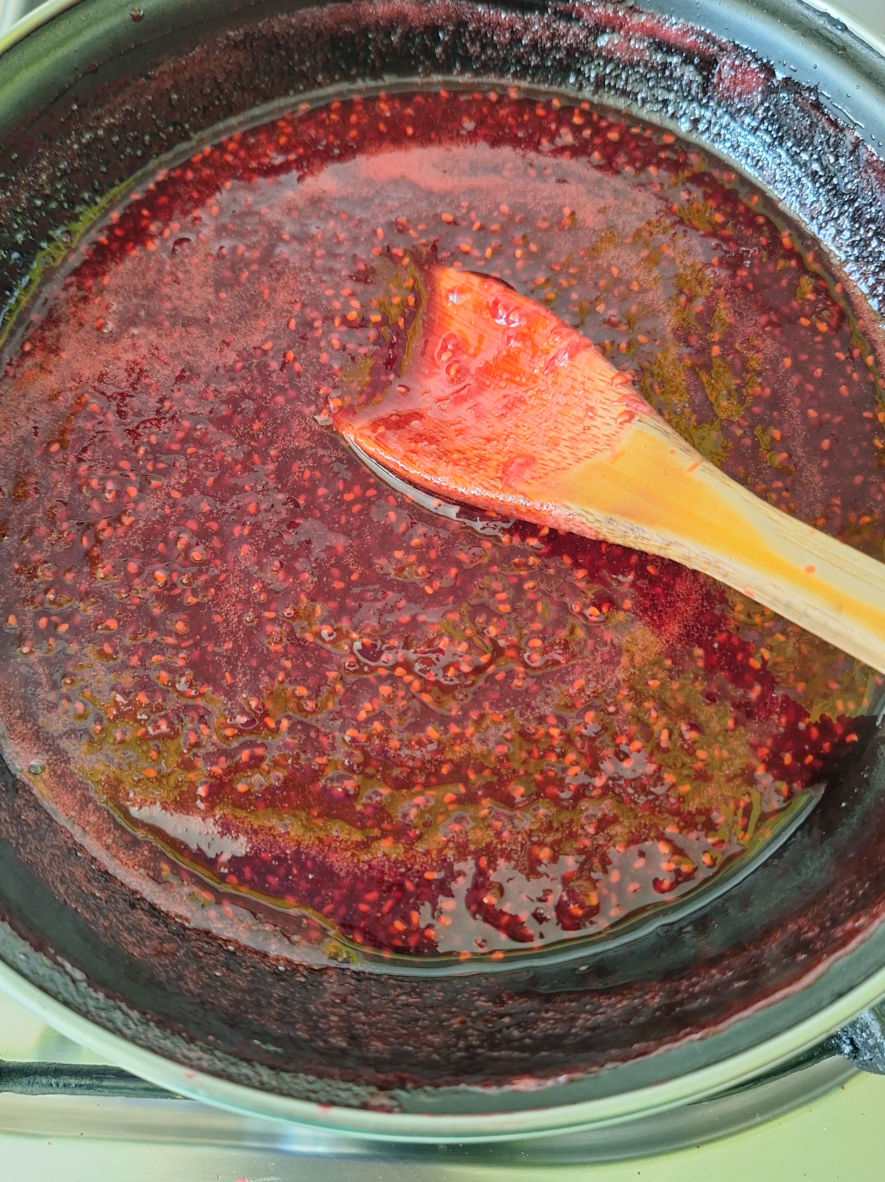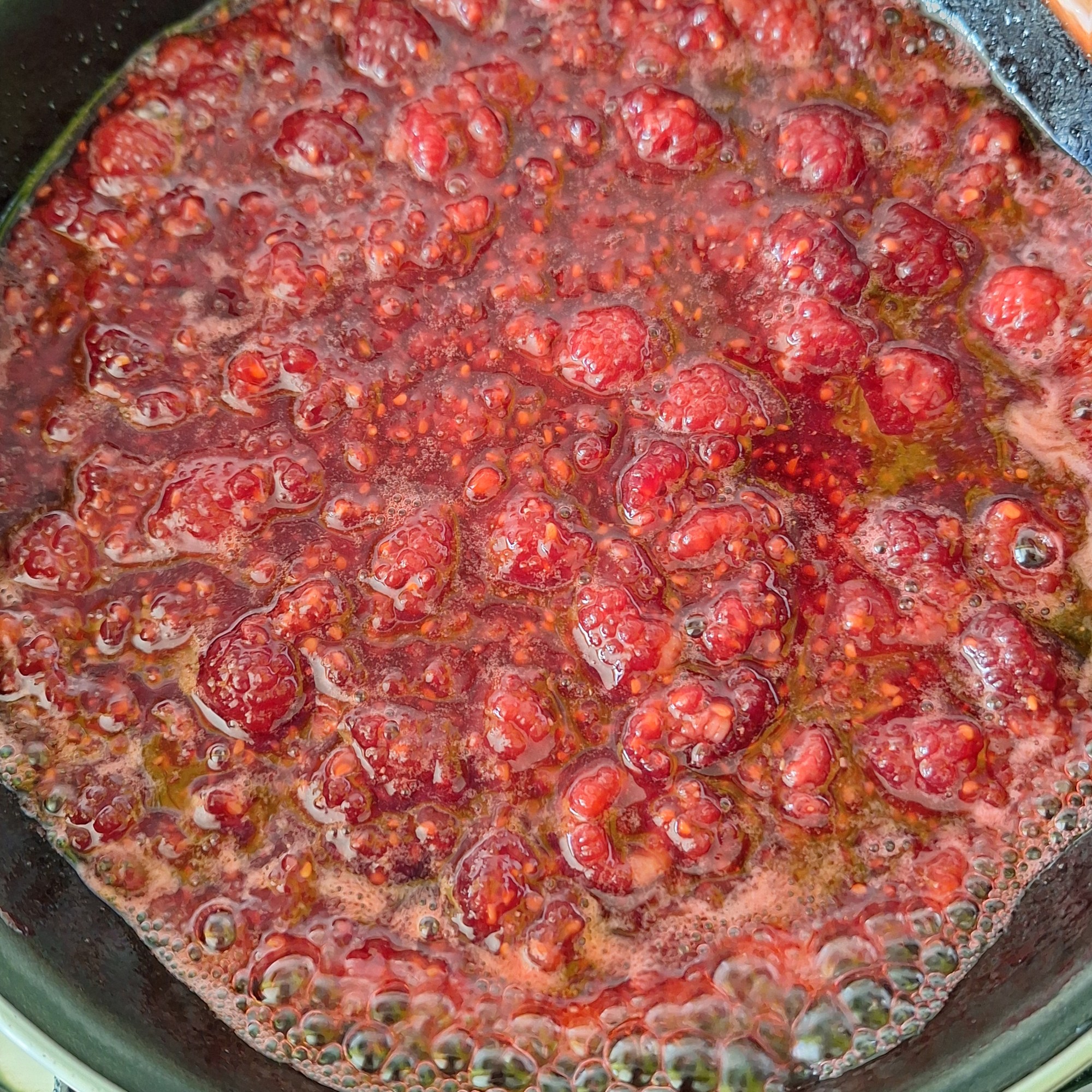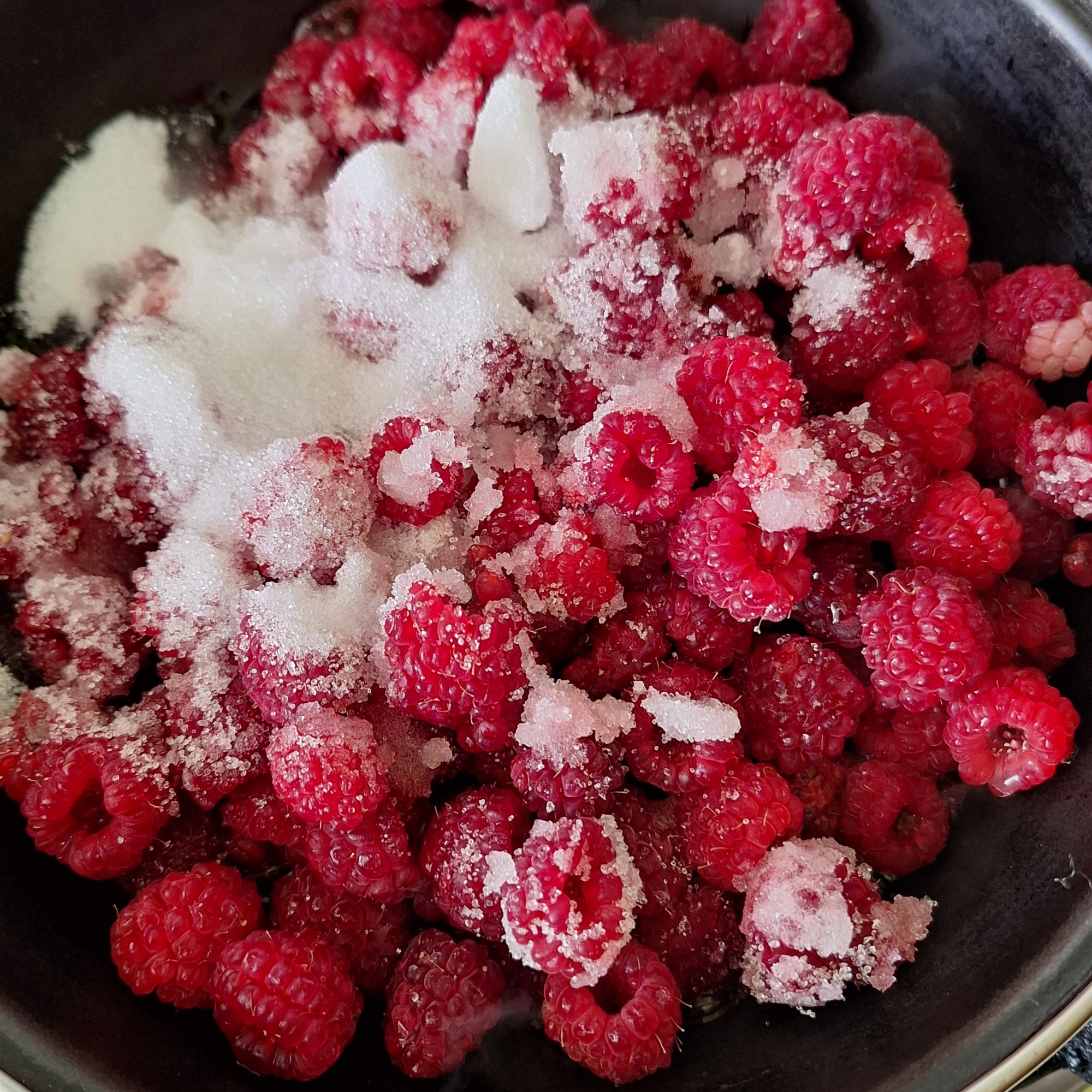 Vierte las frambuesas en una cazuela junto con el eritritol y el zumo de limón y lleva a ebullición.