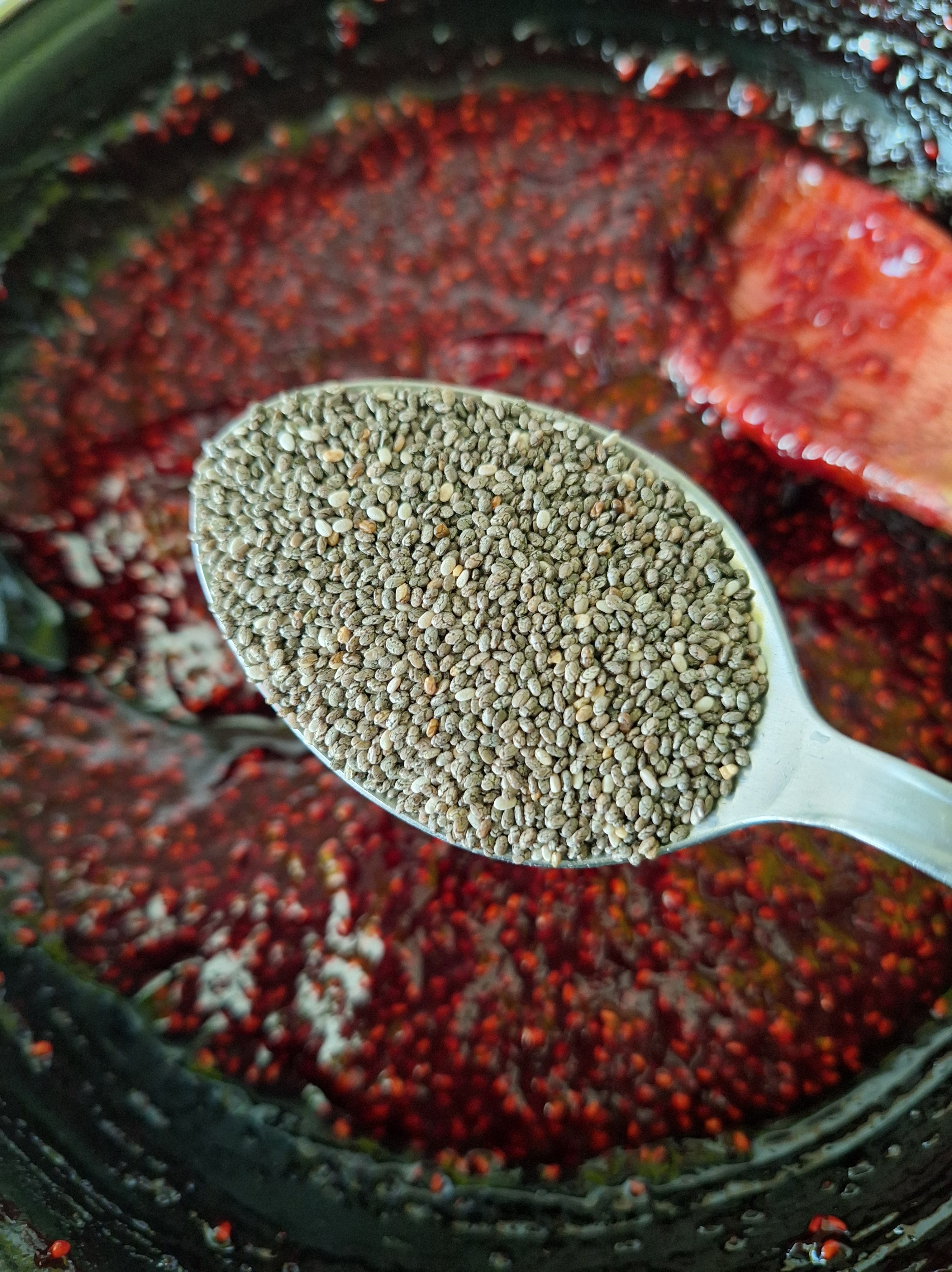 Agrega la chía, baja el fuego y cocina hasta que reduzca y al pasar la cuchara por el fondo se haga un caminito.