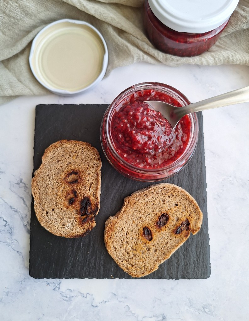 El otro día mi madre me dijo que tenía un montón de frambuesas que había recogido del huerto esa misma mañana. La verdad es que soy la única que las come y, claro, no me da la vida. Así que siempre le digo que me las vaya congelando porque me vienen de maravilla para hacer postres, batidos y helados. En lugar de traerme las frescas me traje una bolsita que tenía en el congelador y decidí utilizarlas para hacer una mermelada con chía.