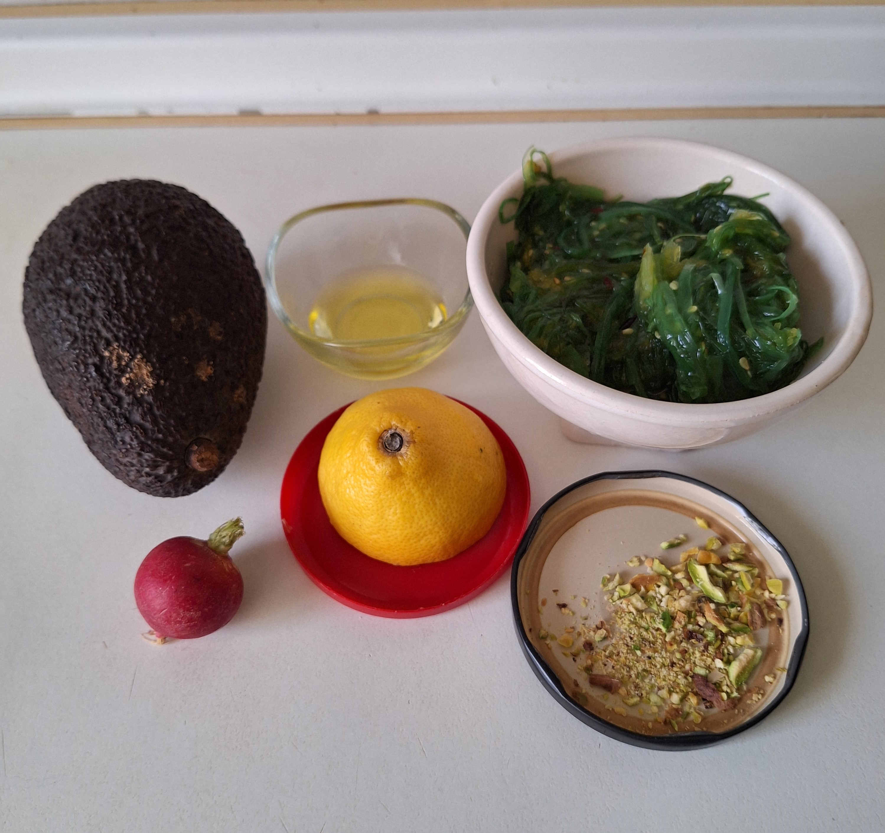 Lava los rabanitos, corta en rodajas finas e interponlas entre las láminas de aguacate. Añade unas algas wakame y el aliño. Por último, espolvorea unos pistachos picados.