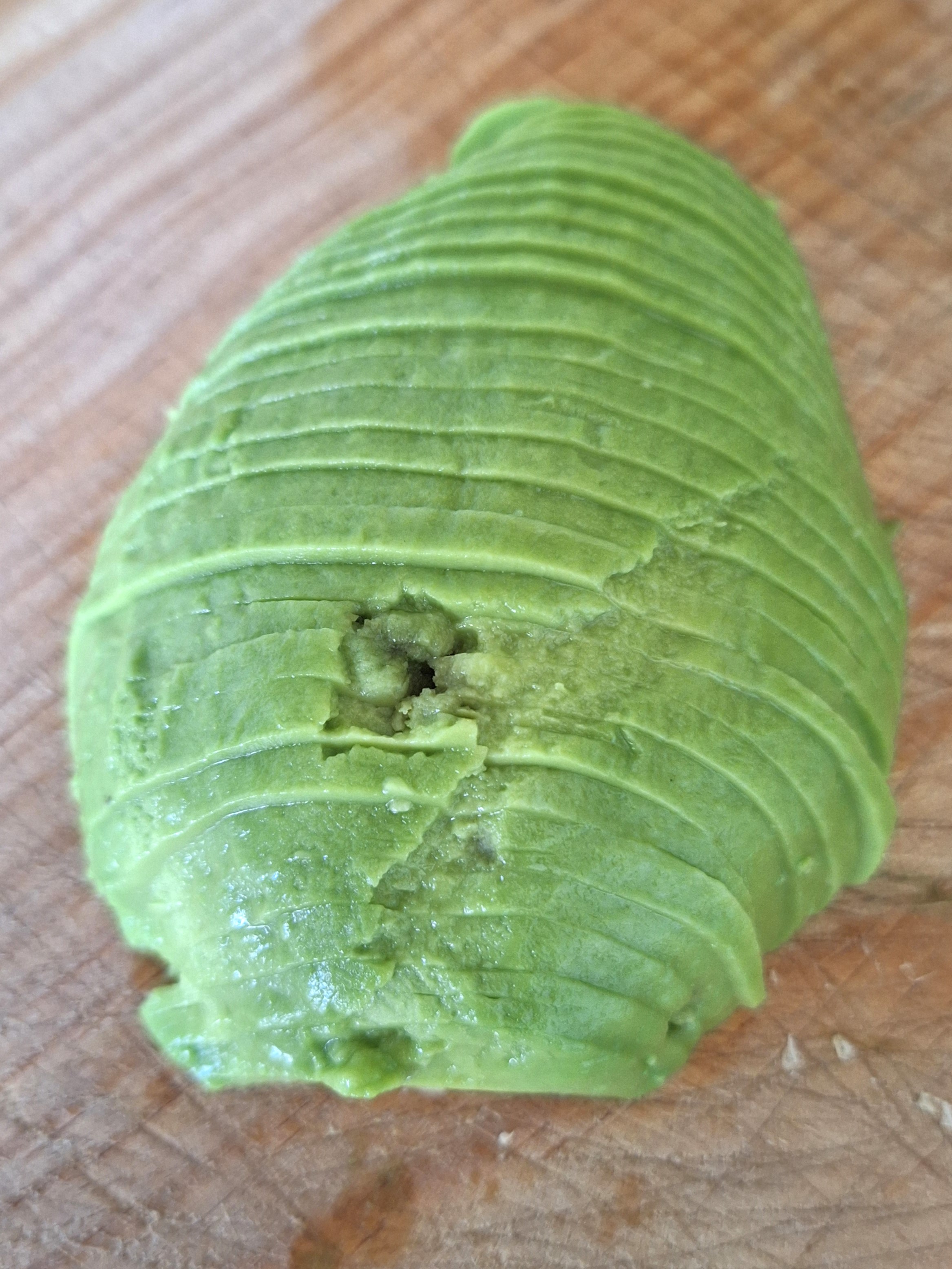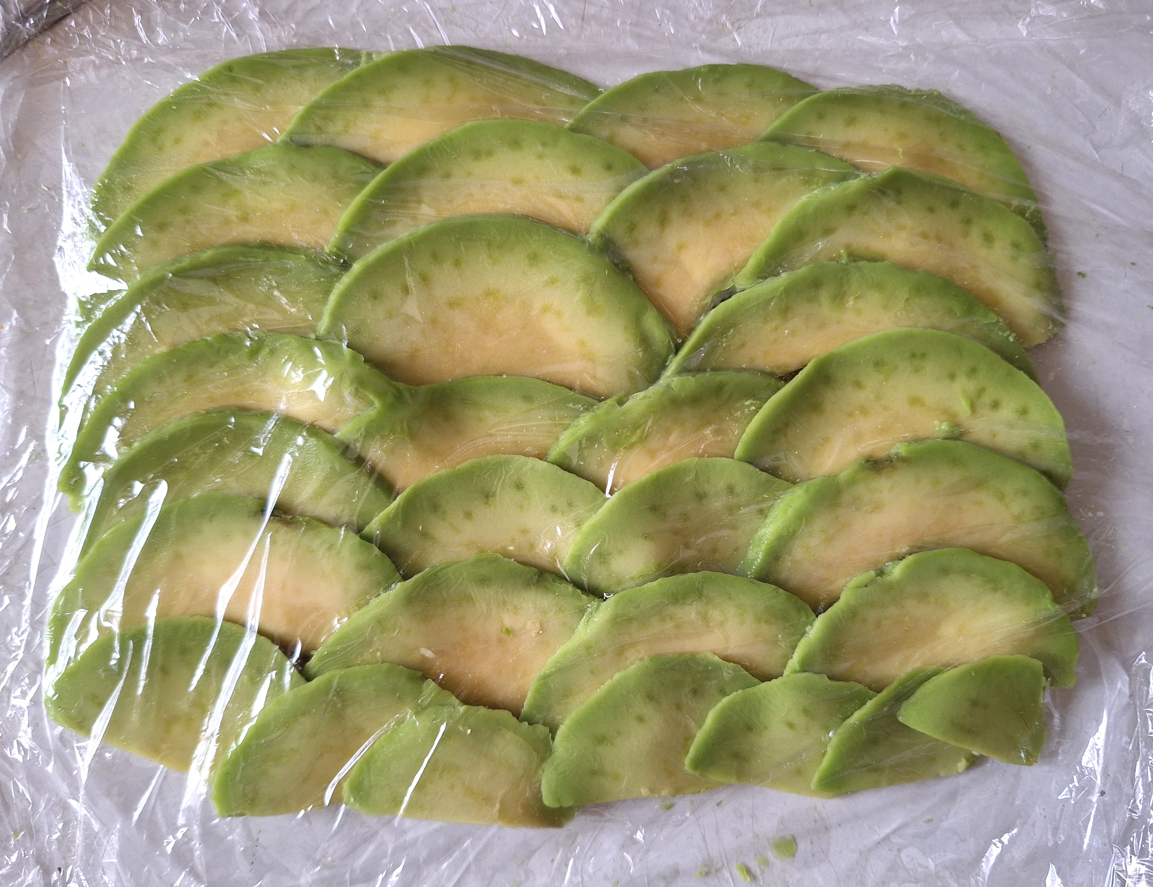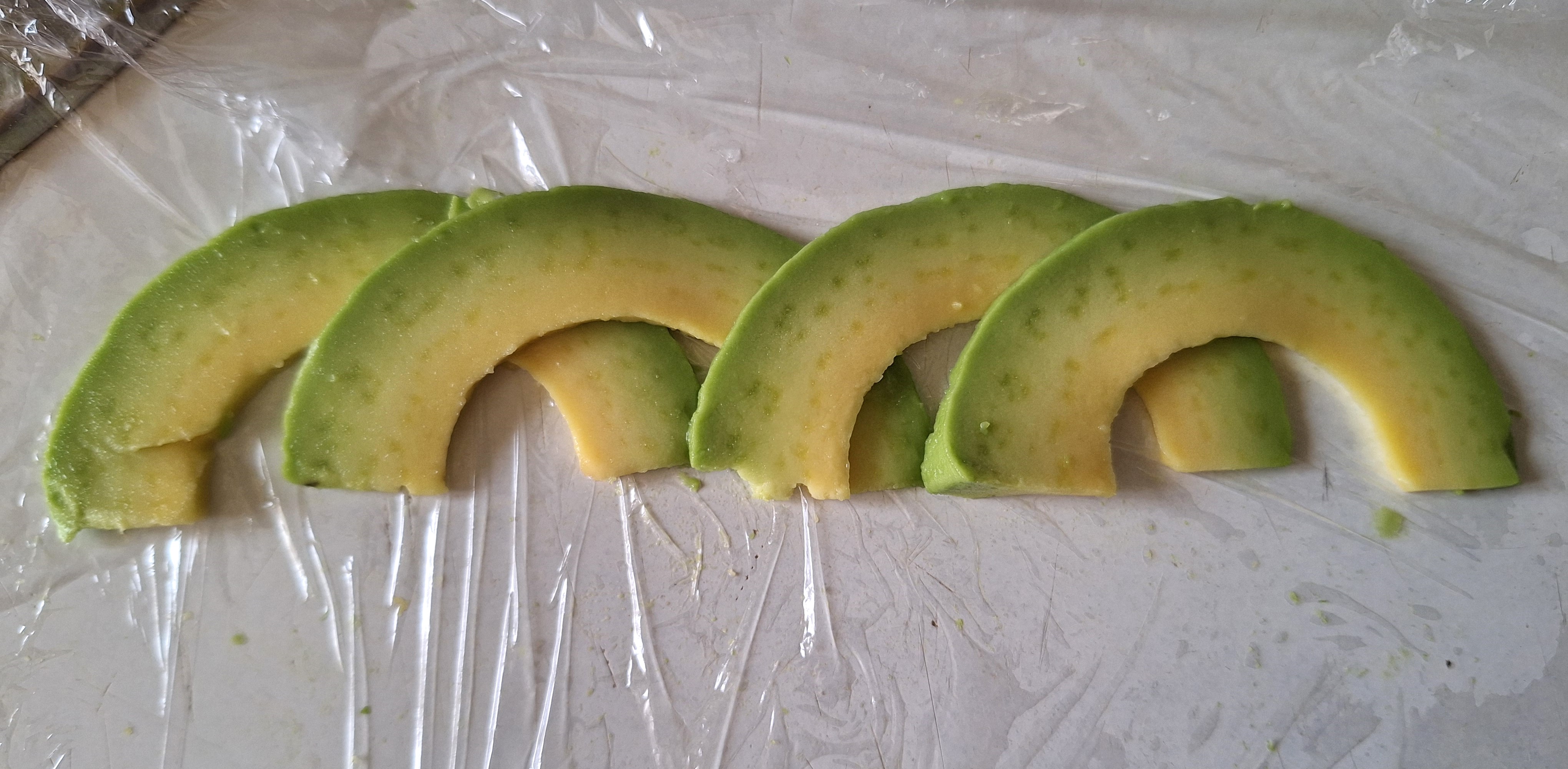 Toma una de las mitades del aguacate y, sobre un trozo de papel film, coloca las láminas superpuestas, primero en horizontal y después en capas verticales (como ves en la foto). Coloca otra capa de film por encima y presiona un poquito para asentarlo.