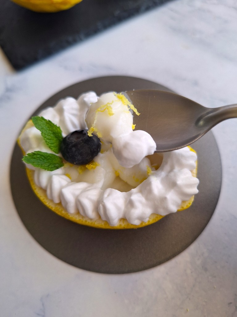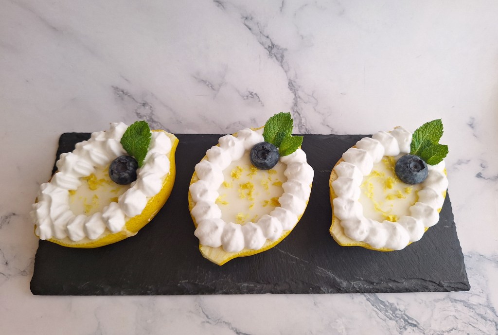 Monta el resto de la nata, junto con una cucharada de eritritol glass. Coloca en una manga pastelera y decora los limones. Añade un poco de ralladura, arándanos y hierbabuena.
