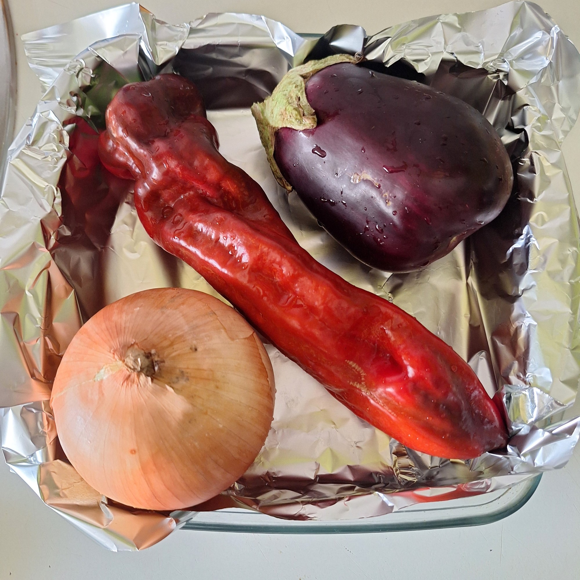 Precalienta el horno a 180ºC. Pincha la berenjena para que no reviente en el horno y lava el pimiento. Coloca las verduras en la bandeja del horno y hornea durante unos 60-90 minutos y deja enfriar.