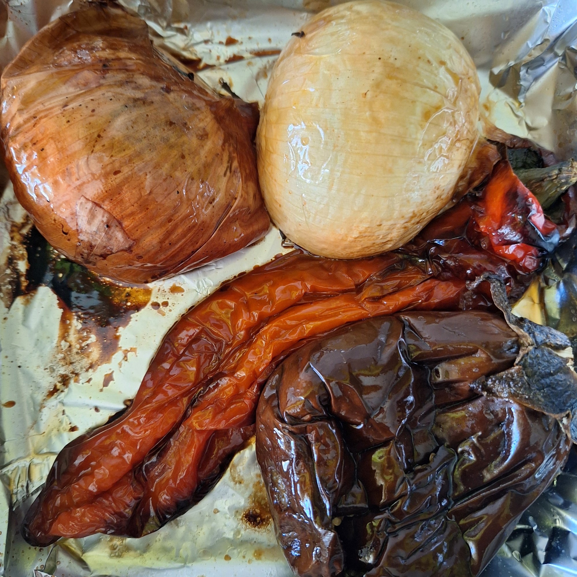 Retira la piel del pimiento y la berenjena y la capa externa de la cebolla y corta en tiras. Aliña con el jugo que han soltado en el horno, pimienta negra, sal y aceite y disfruta.