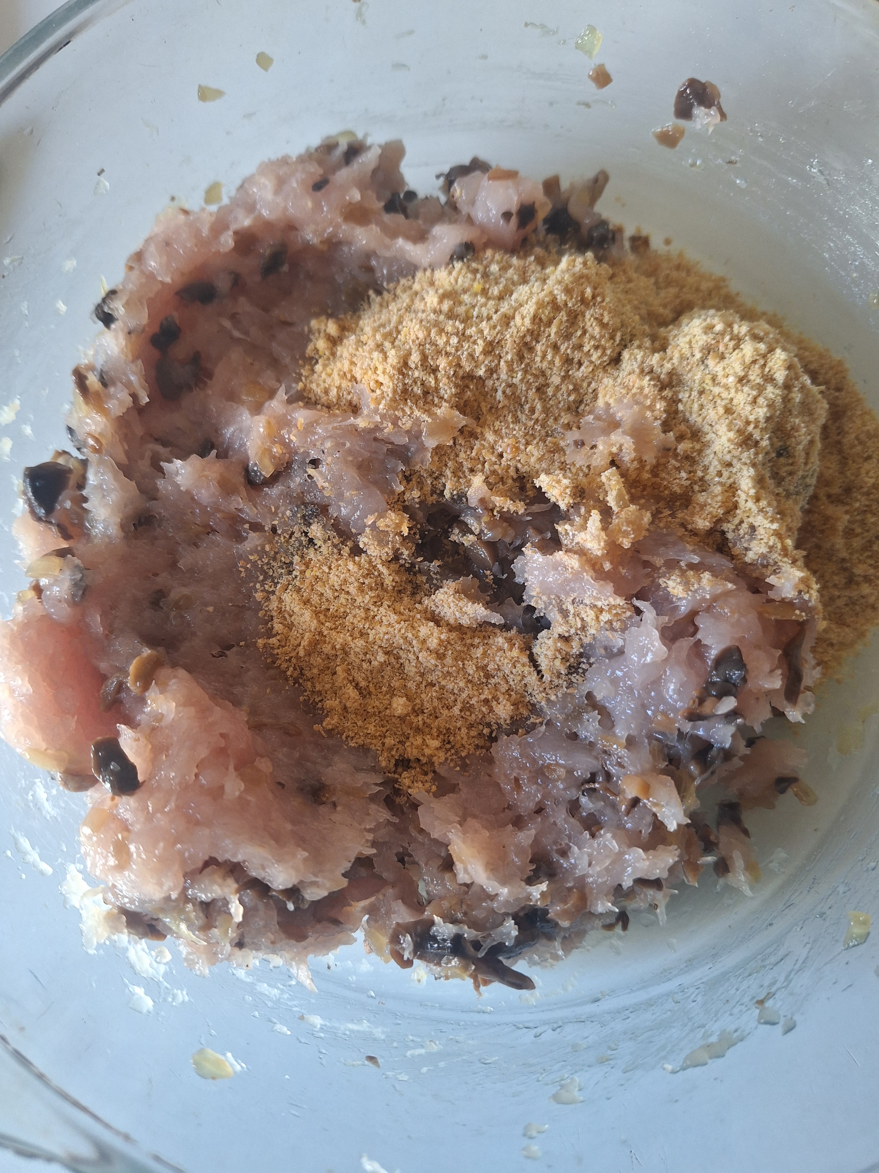 Mezcla con el pollo picado (puedes hacerlo con un procesador de alimentos) y el lino molido. Salpimenta y deja reposar unos 10 minutos.