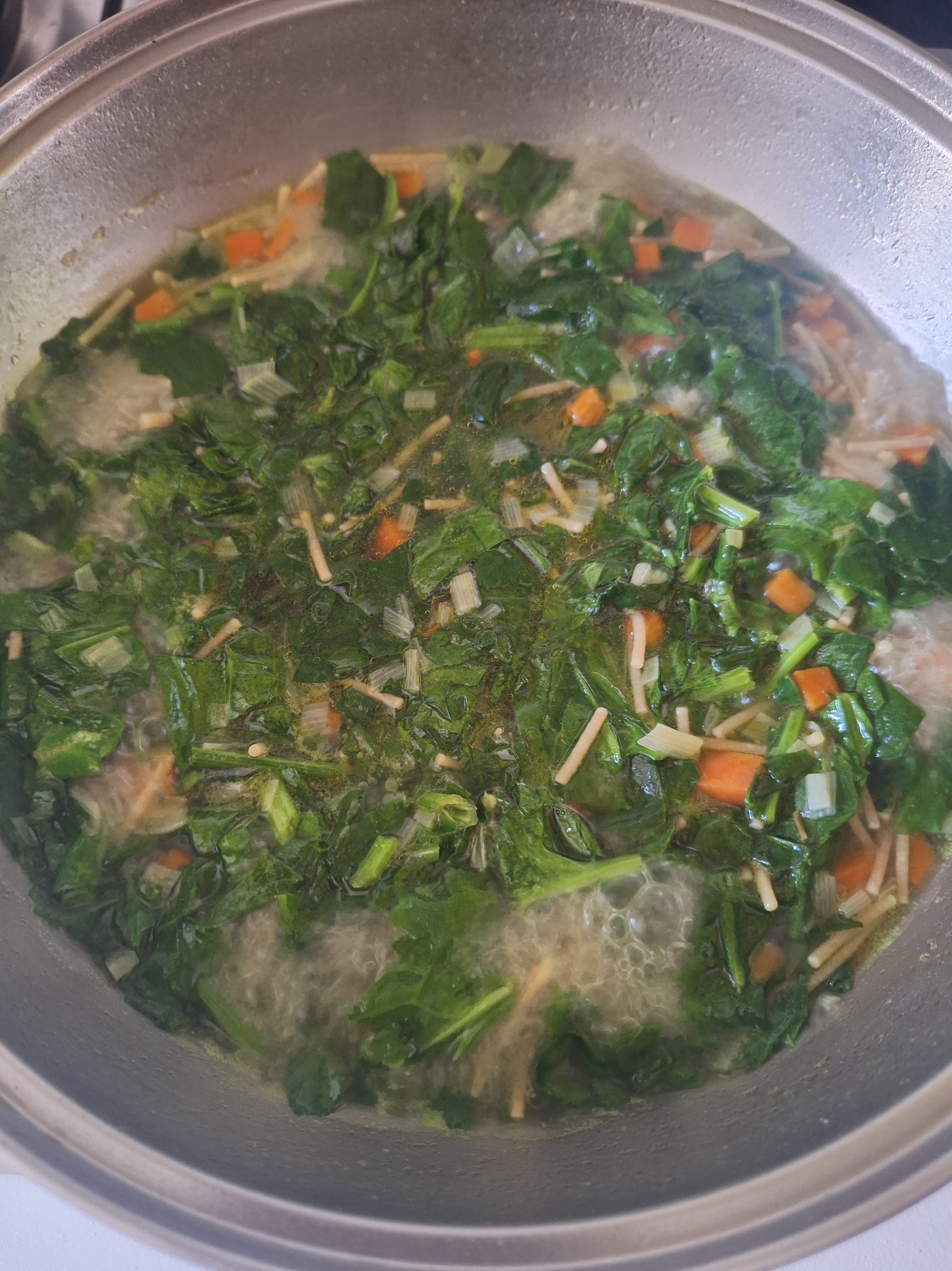 Lava las espinacas y corta en trozos pequeños. Añade a cazuela y cocina unos 5 minutos. Comprueba el punto de cocción de los fideos y, cuando estén casi listos, agrega las albóndigas.