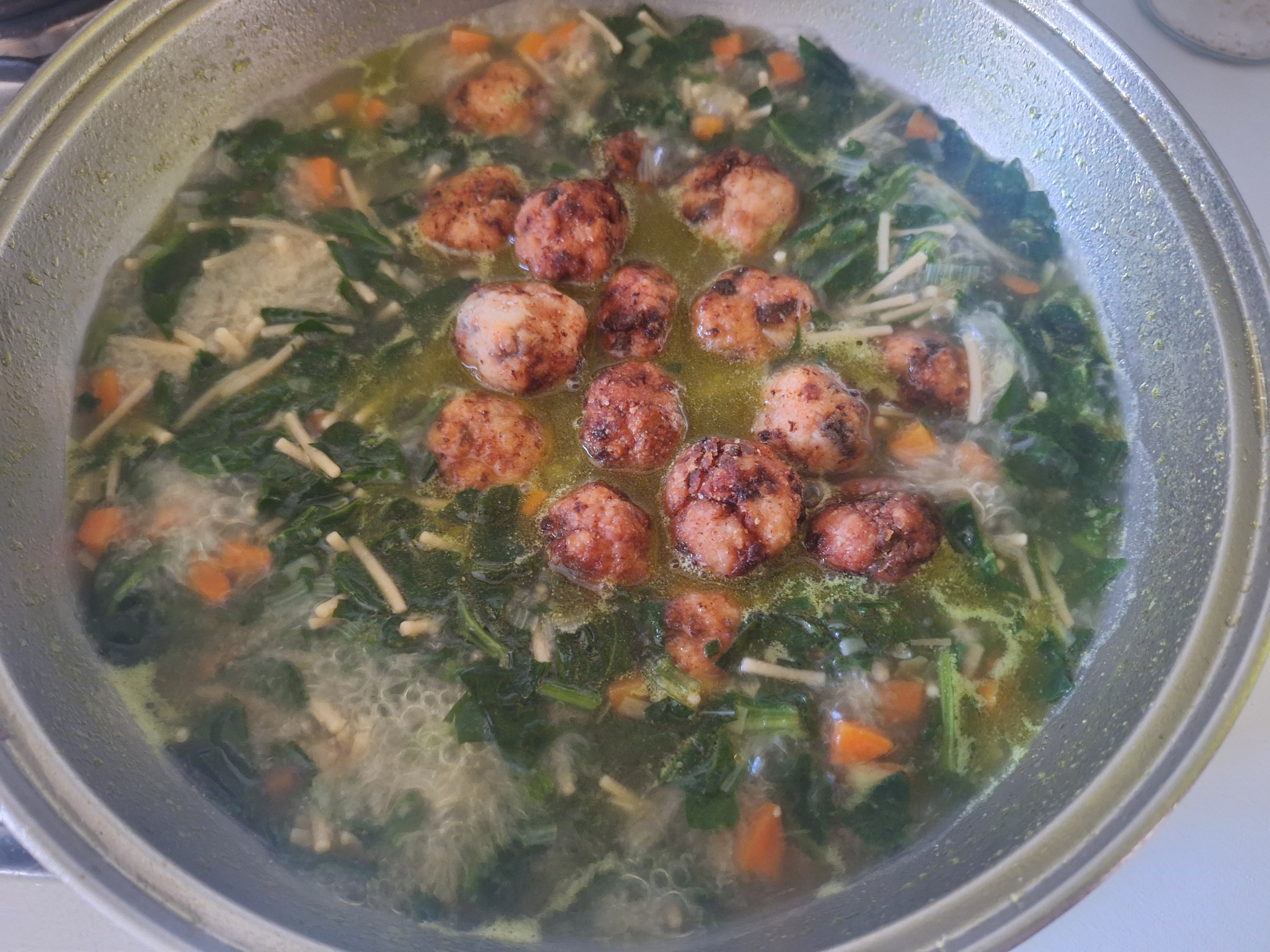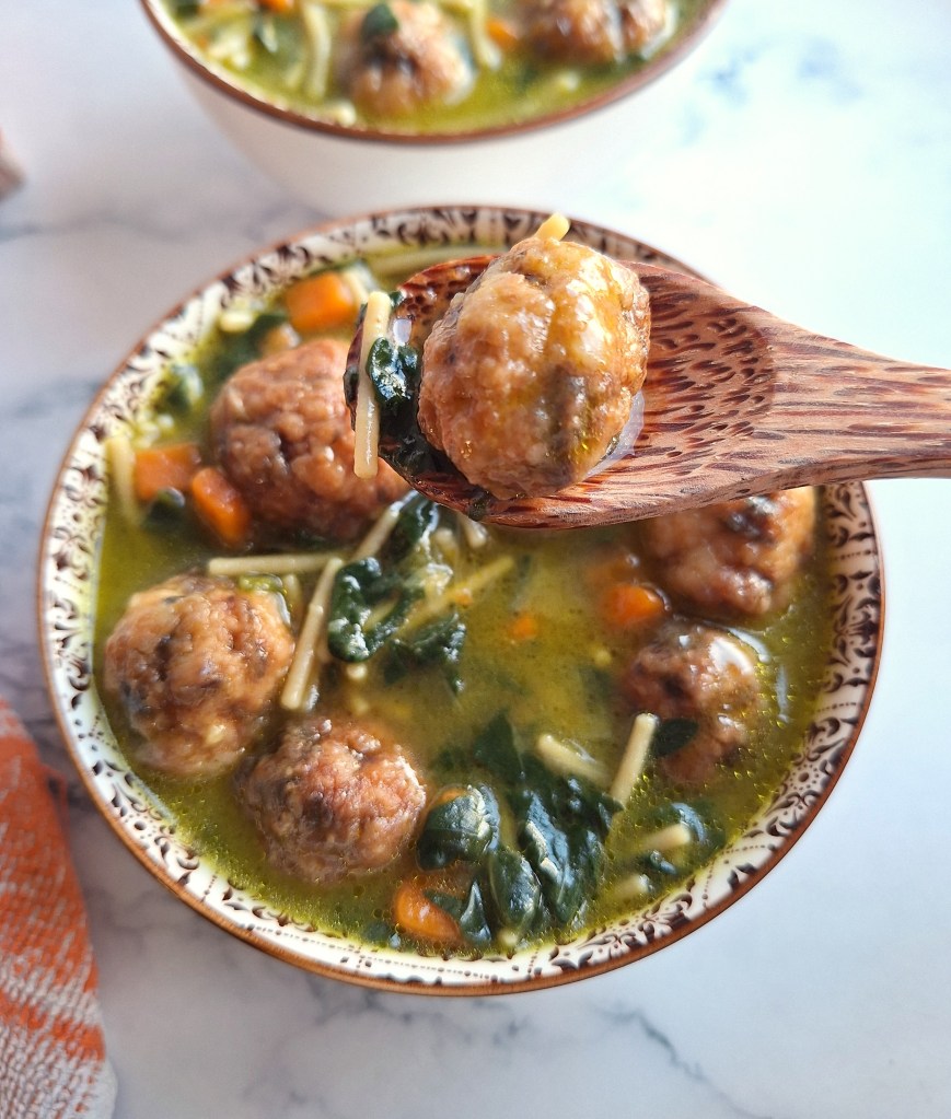 La «sopa de bodas italiana», también conocida como «minestra maritata», es una sopa que combina verduras, albóndigas y pasta. La receta original lleva apio, pero como no tenía, utilicé puerro en su lugar, junto con zanahoria y espinacas. Las albóndigas, en este caso, llevan pollo y champiñones y son libres de gluten. Un detalle a tener en cuenta es que deben ser pequeñitas, tamaño bocado, así que armaos de paciencia o buscad ayudantes. En cuanto a la pasta, he utilizado fideos de garbanzo (aunque en otra ocasión la hice con fideos sin gluten).