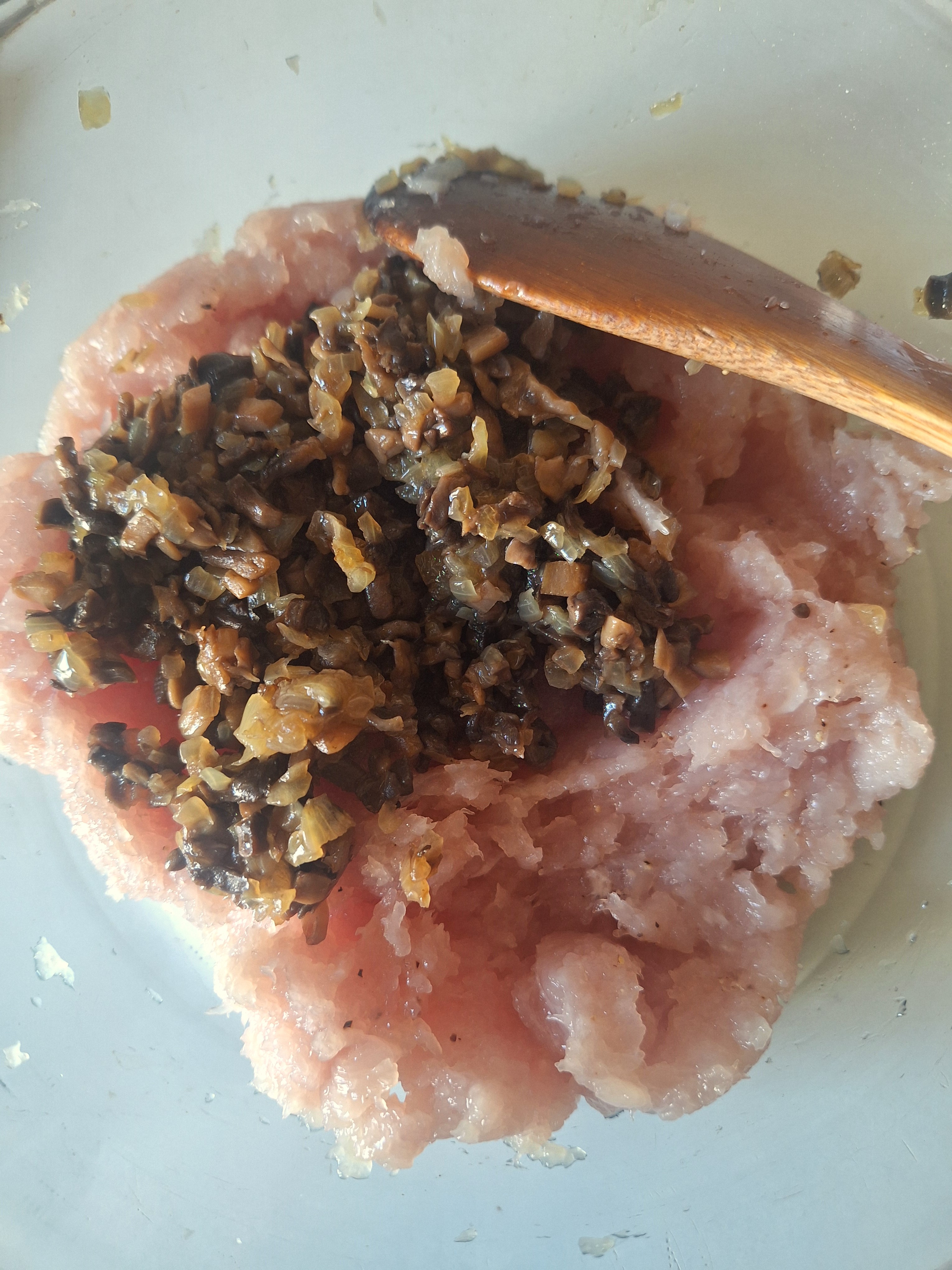 Prepara las albóndigas: corta el puerro y los champis finamente y pocha en un poco de aceite. cuando estén blanditos escurre el aceite sobrante lo máximo posible.