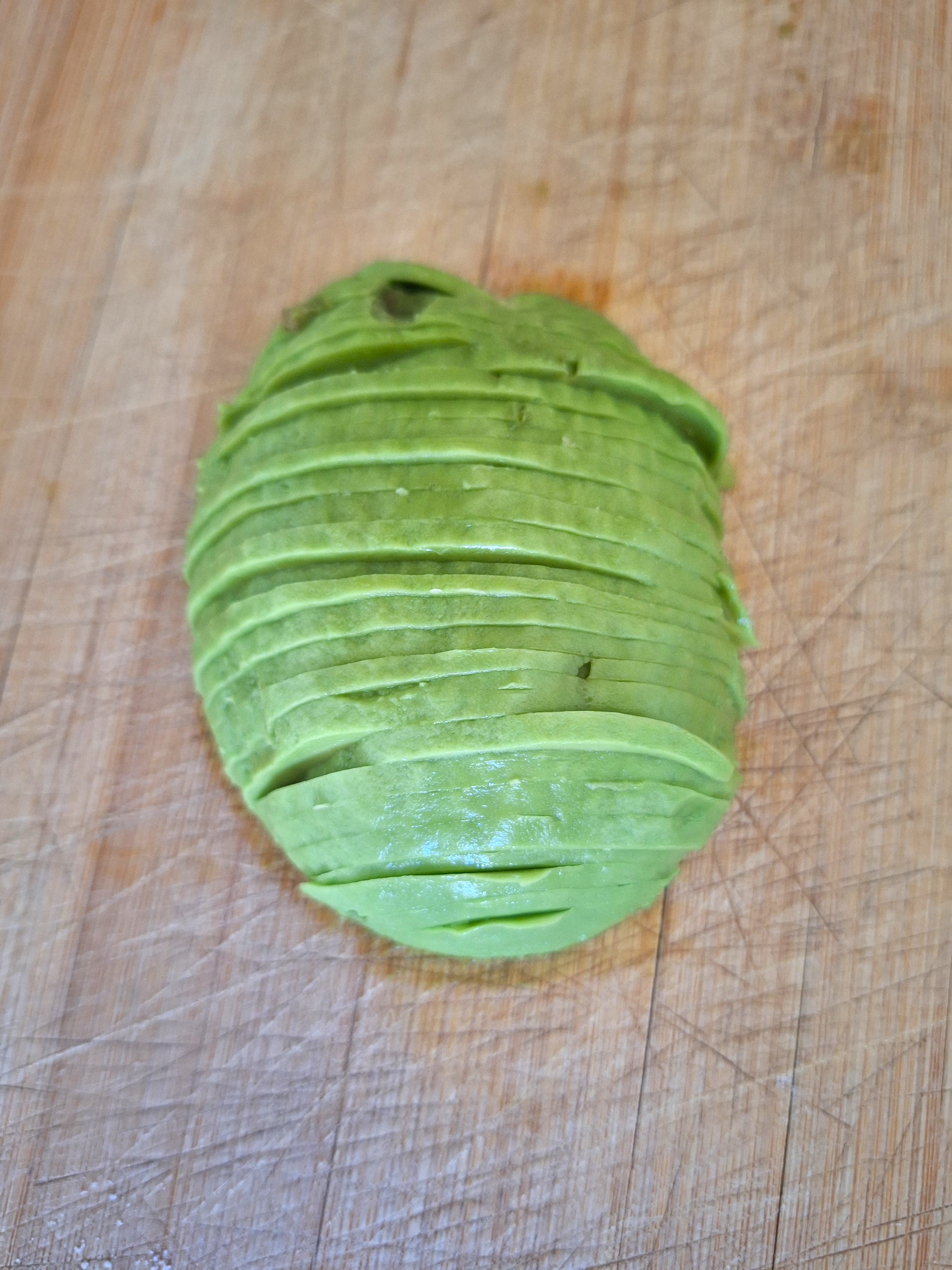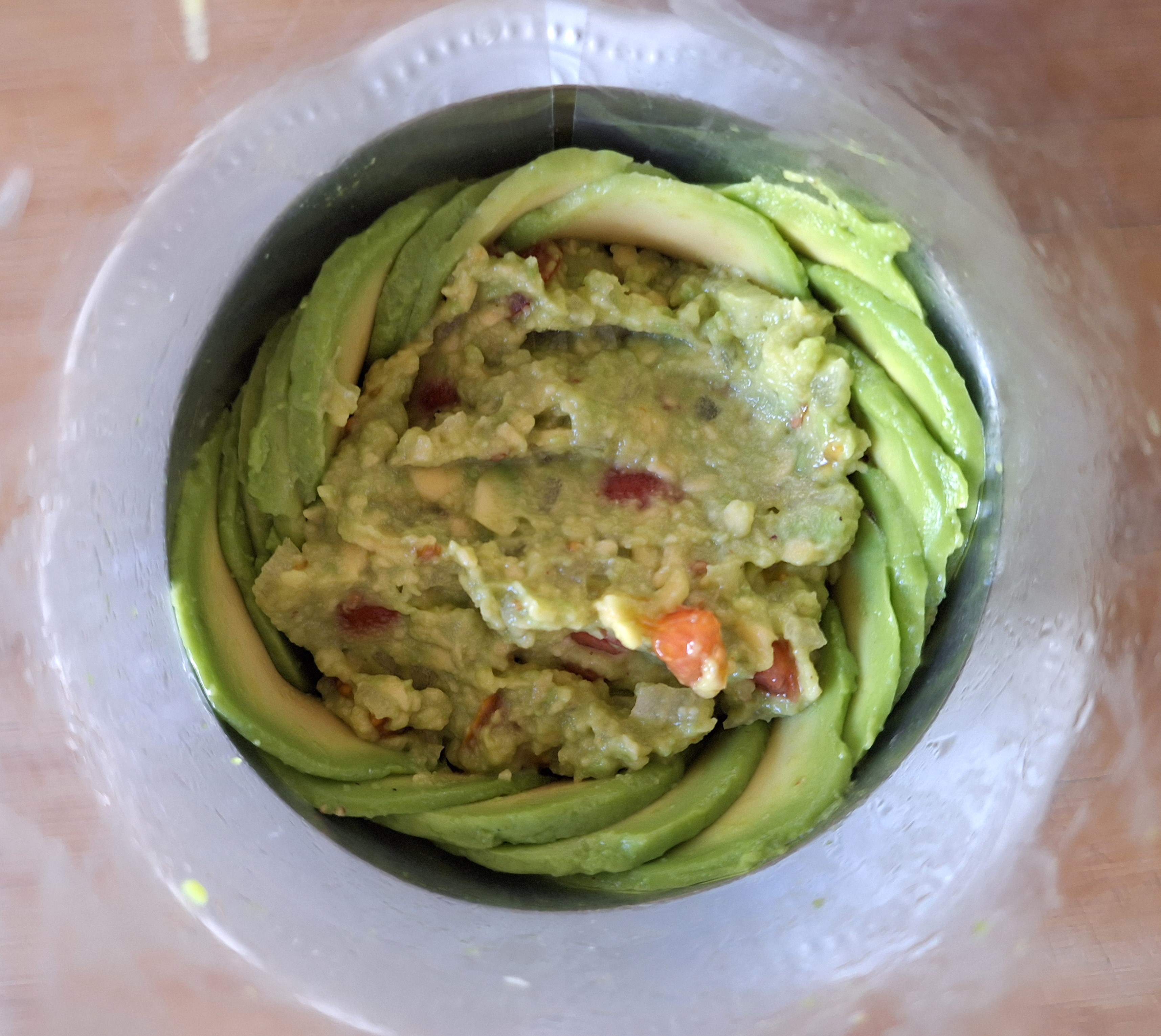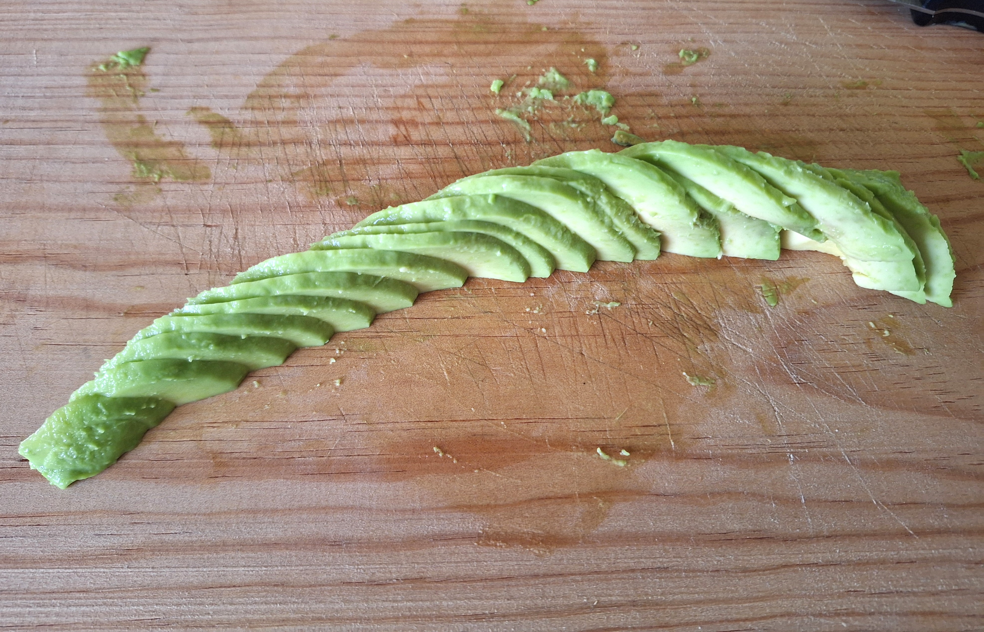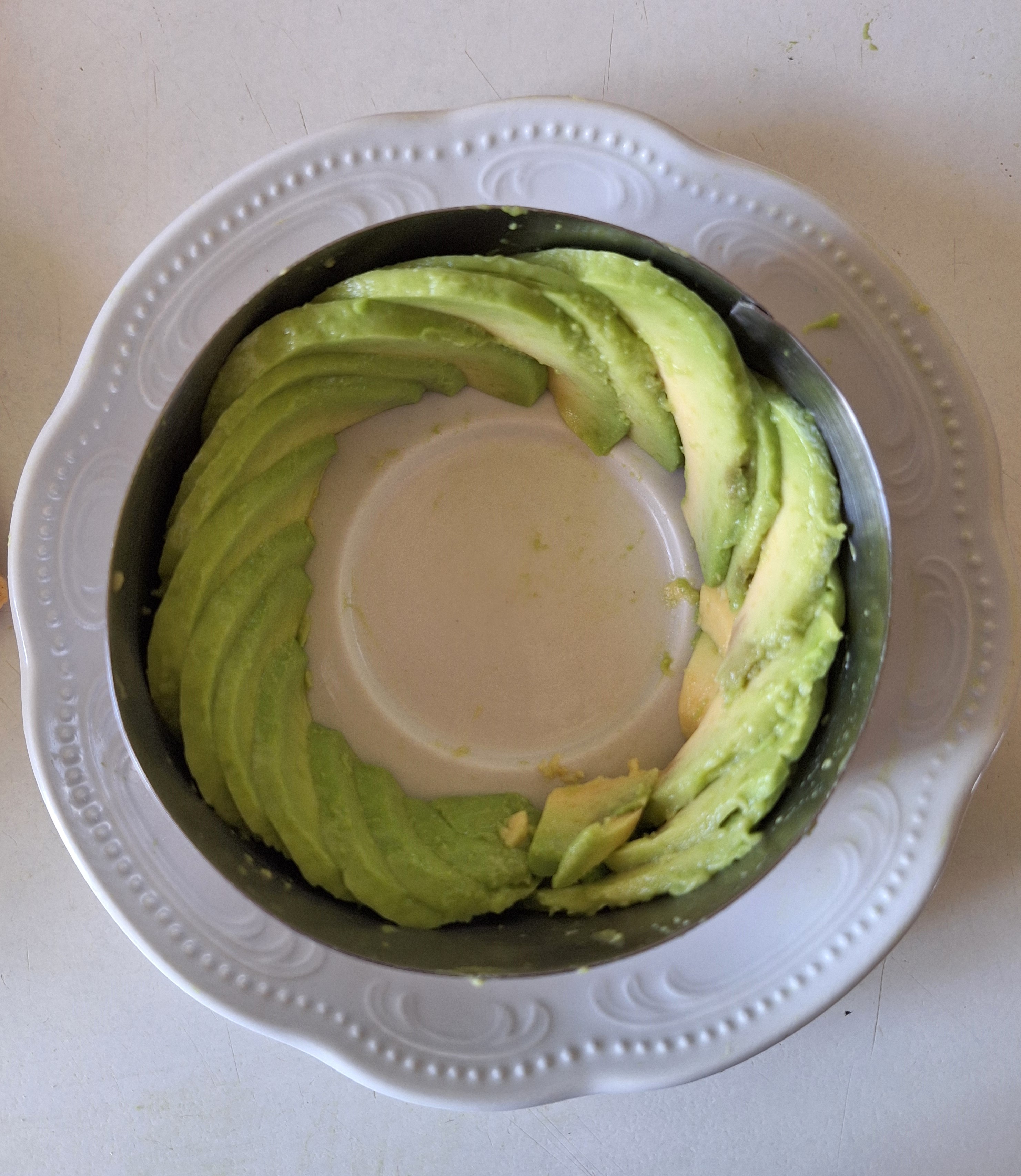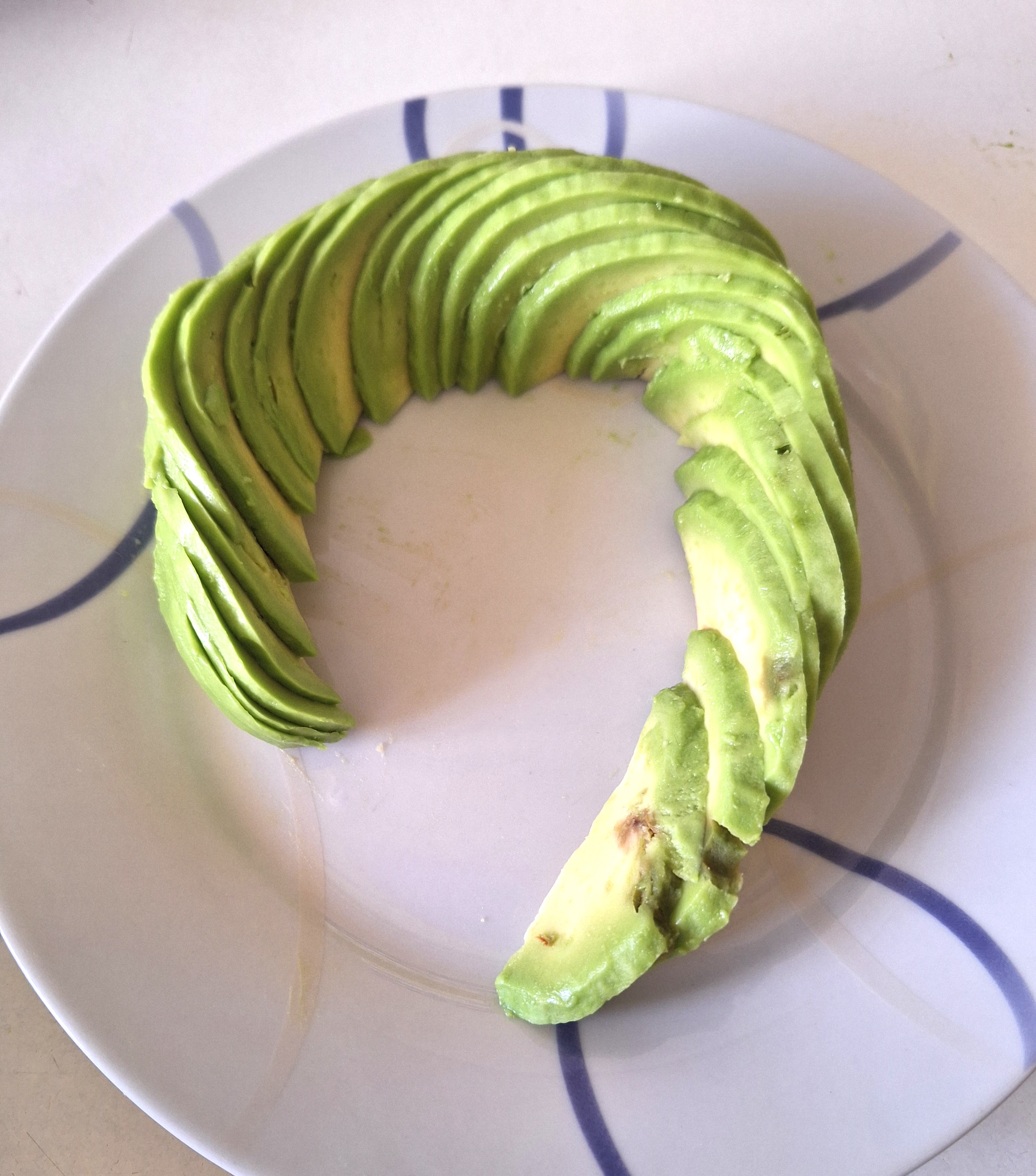Corta el aguacate a la mitad y retira el hueso. Pela una parte y corta con un cuchillo bien afilado en láminas finas como indica la fotografía. Separa con cuidado y da forma de círculo (puedes ayudarte con una lámina de acetato y un aro para emplatar.