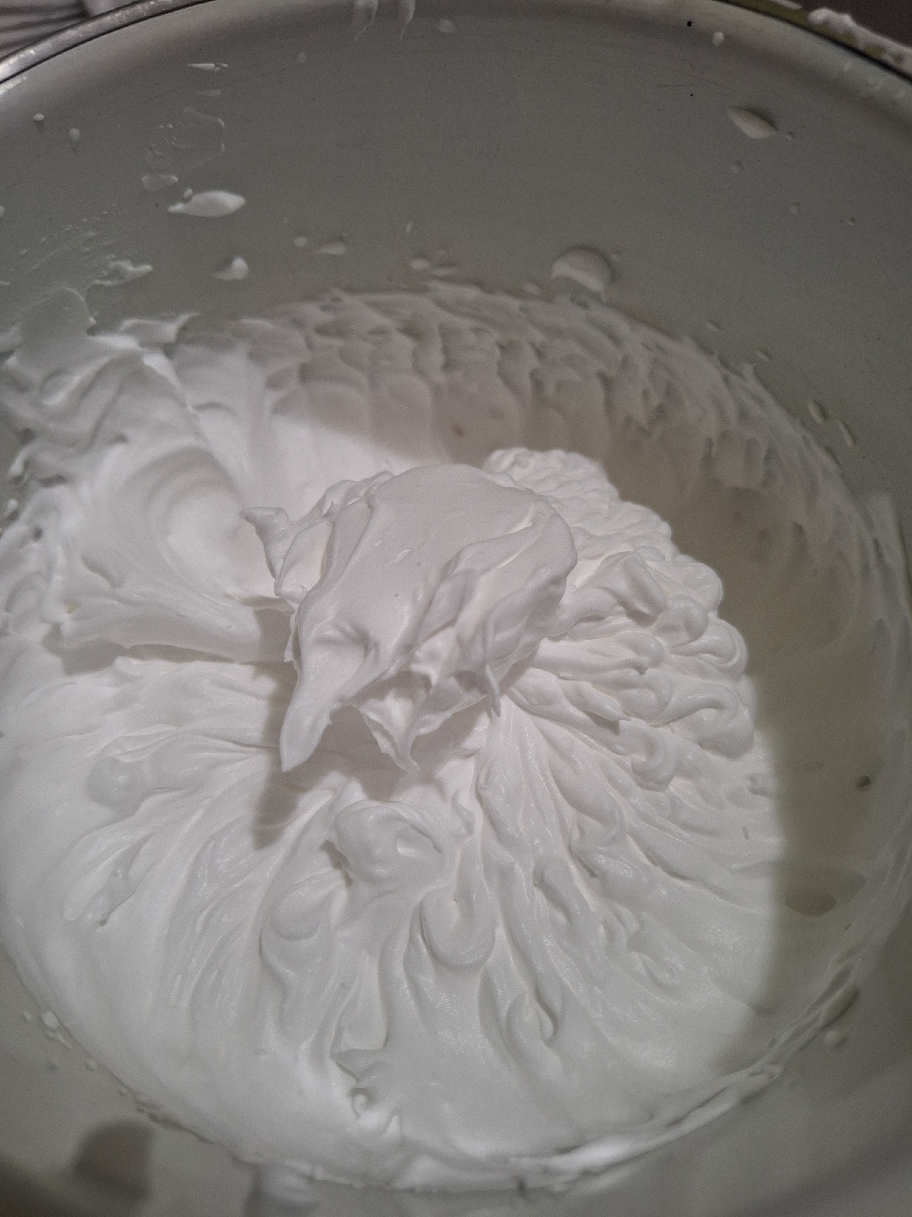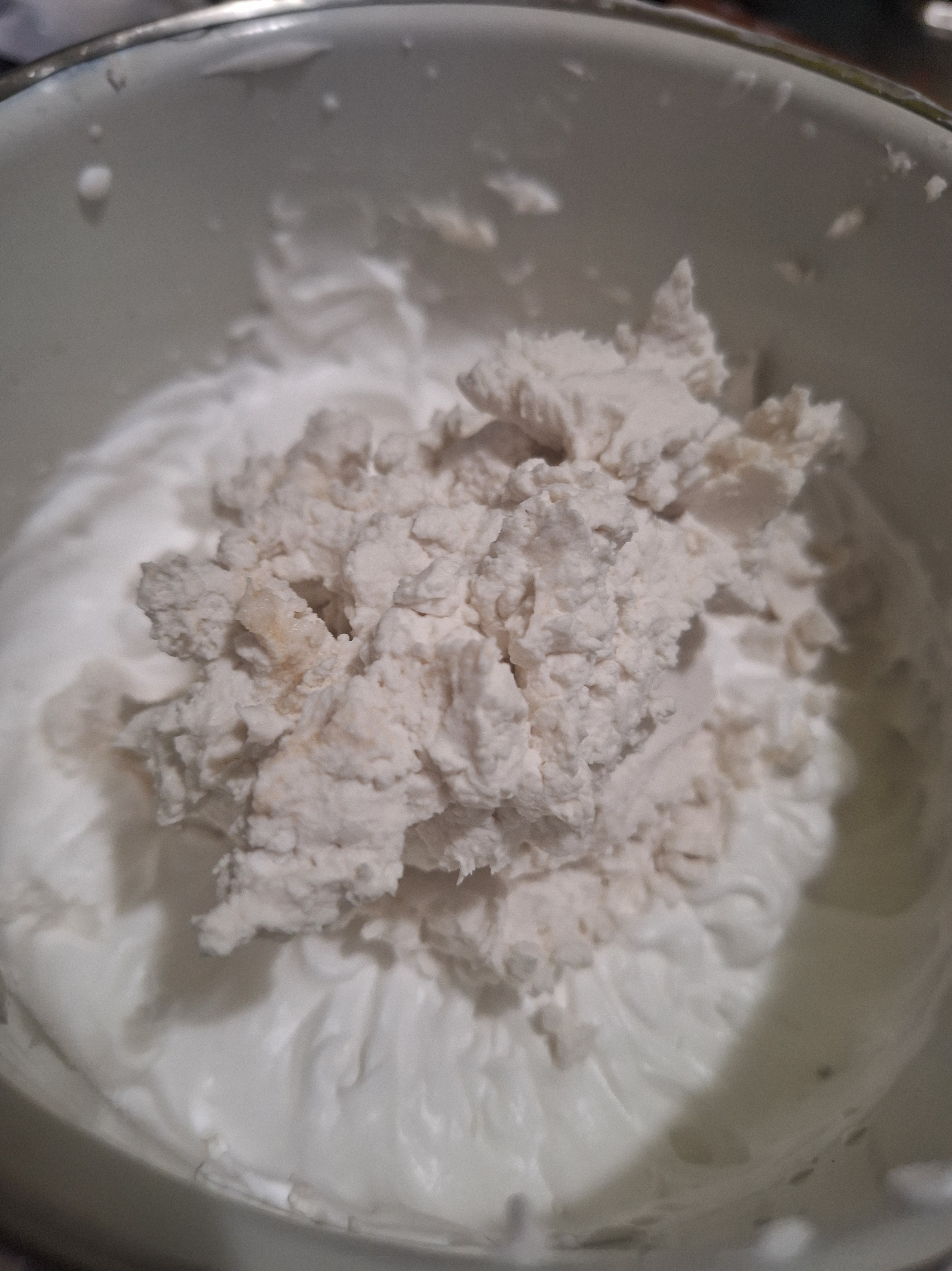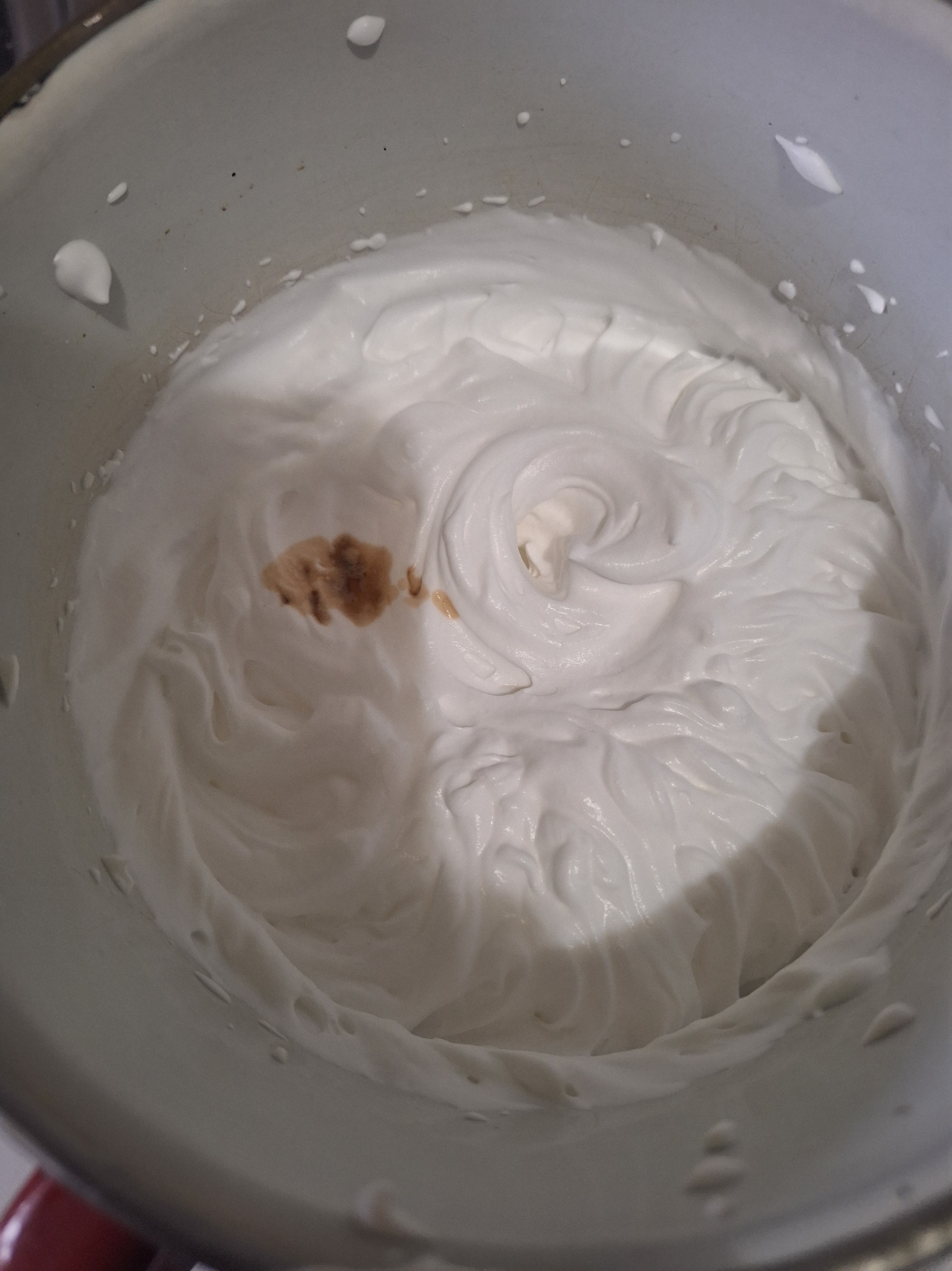 Vierte la nata en el recipiente frío y monta con varillas. Cuando empiece a estar cremosa añade la mitad del eritritol glass y la vainilla y sigue montando hasta que haga picos.