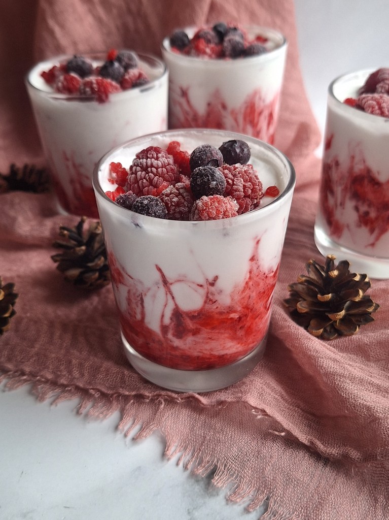 En un vasito ve alternando capas de crema de nata y coco y de frambuesas (ya frías). Con ayuda de un palillo o una cuchara haz dibujos para mezclarlos entre ellos. Decora con frambuesas y arándanos.