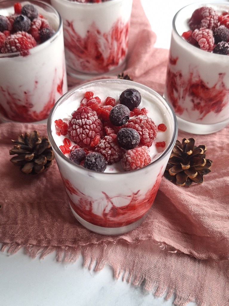 El Fool de arándanos es un postre irlandés elaborado con nata, yogur griego y fruta. Cada cucharada es una explosión cremosa de sabor. Para la versión vegana he utilizado nata vegetal y he sustituido el yogur por crema de coco, que es la parte sólida de las latas de leche de coco.
