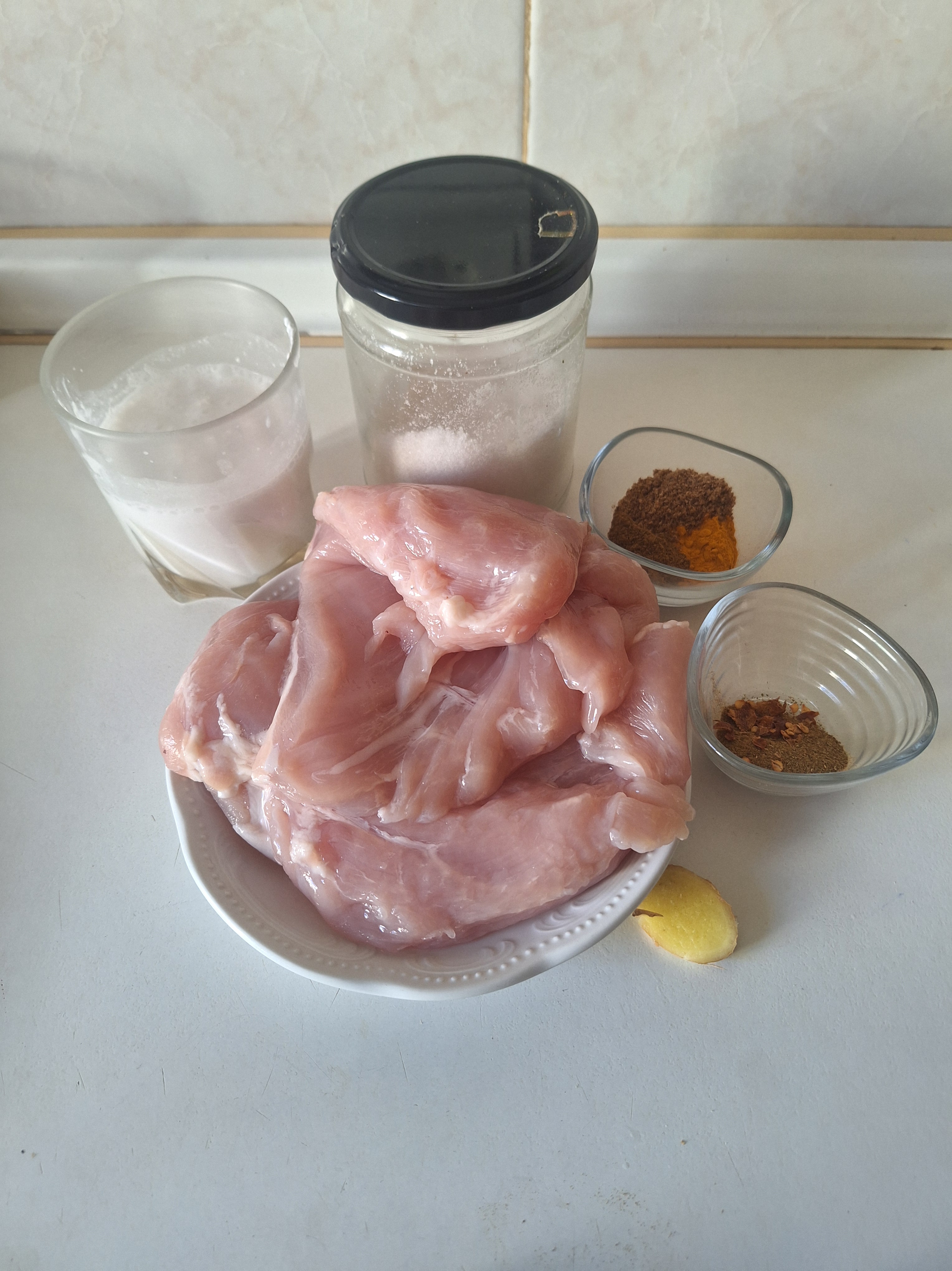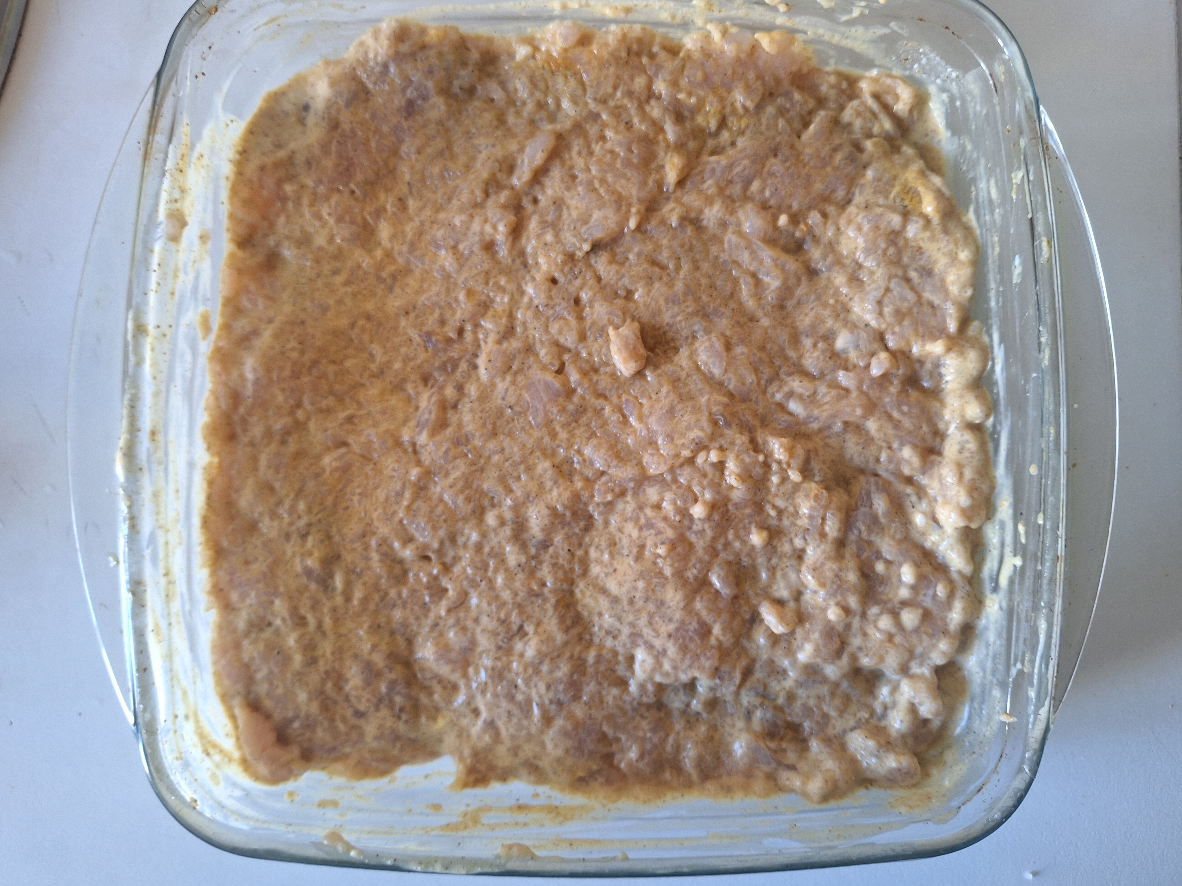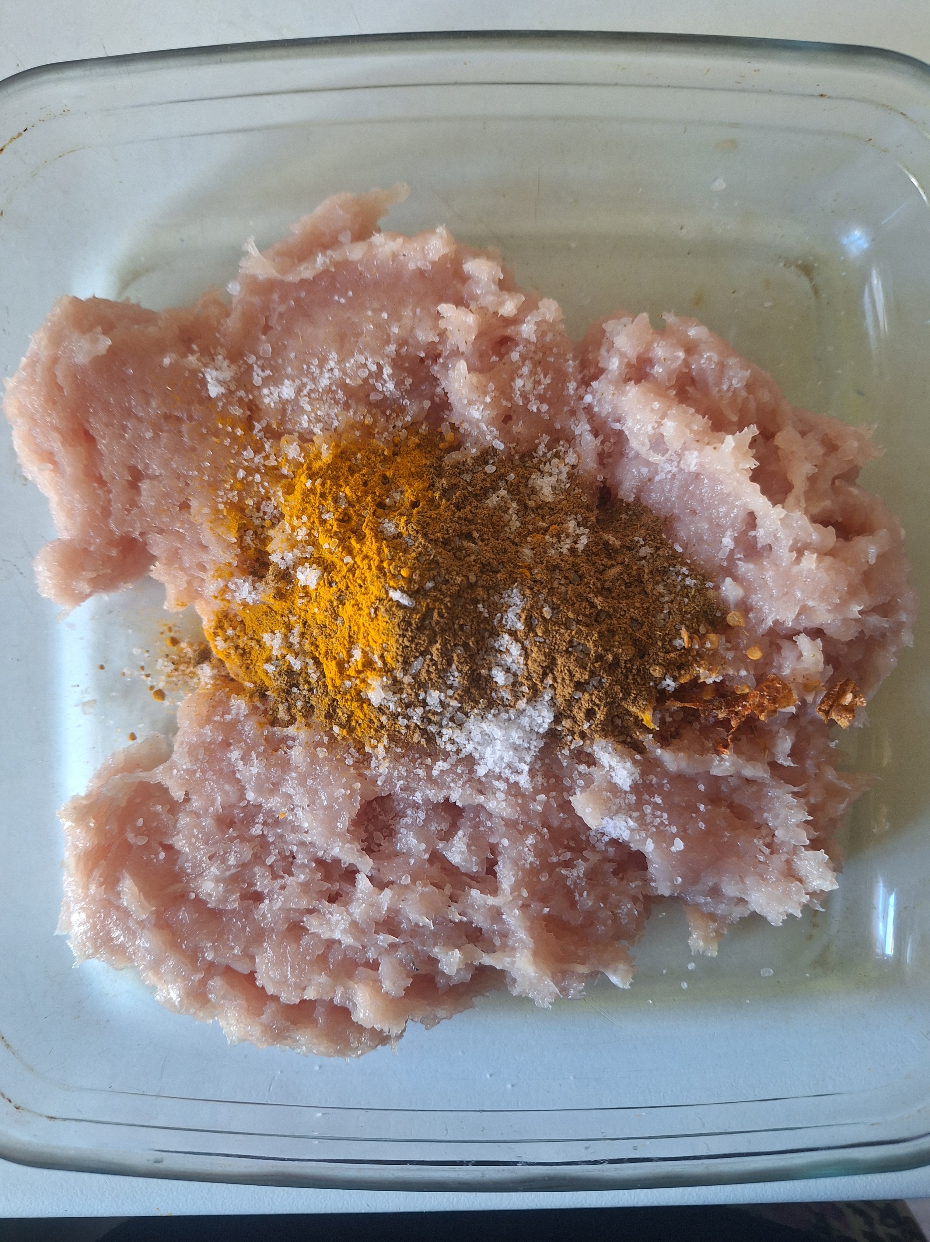 Sazona las pechugas, corta en trozos grandes y tritura en un procesador de alimentos. Vierte en un recipiente grande, añade las especias y la leche de coco y mezcla bien. Cubre con film y macera en el frigo (yo prefiero dejarla toda la noche).