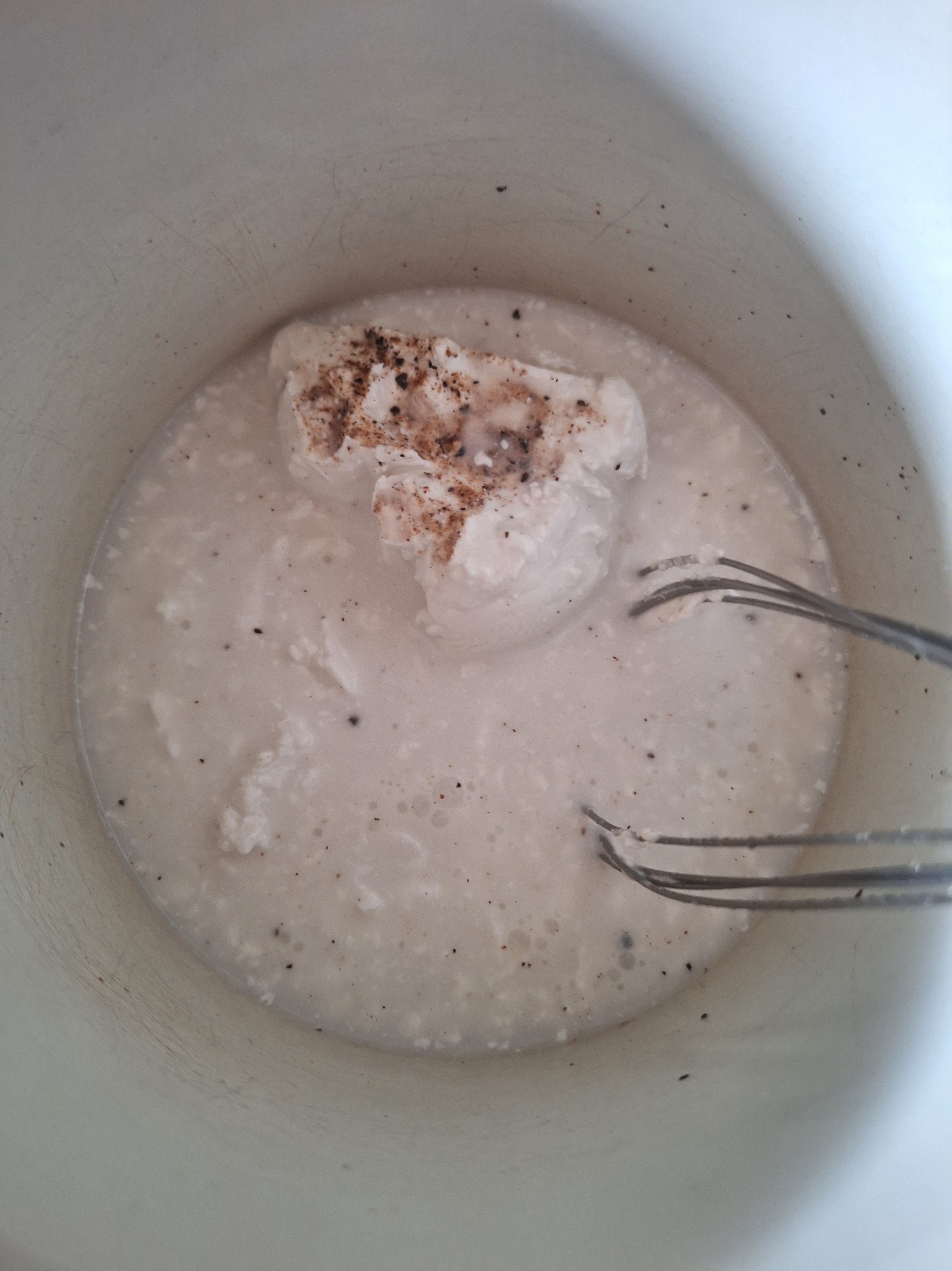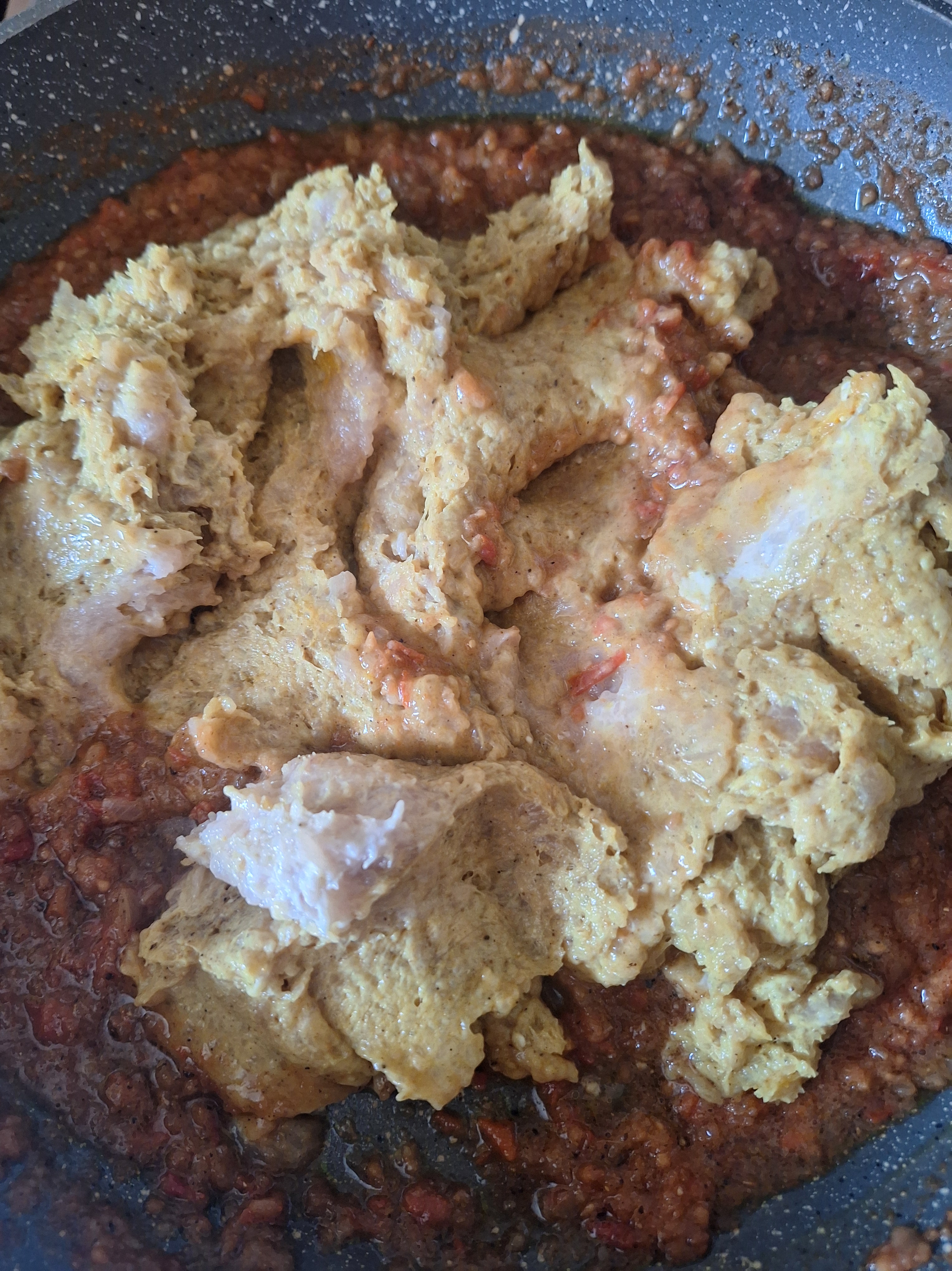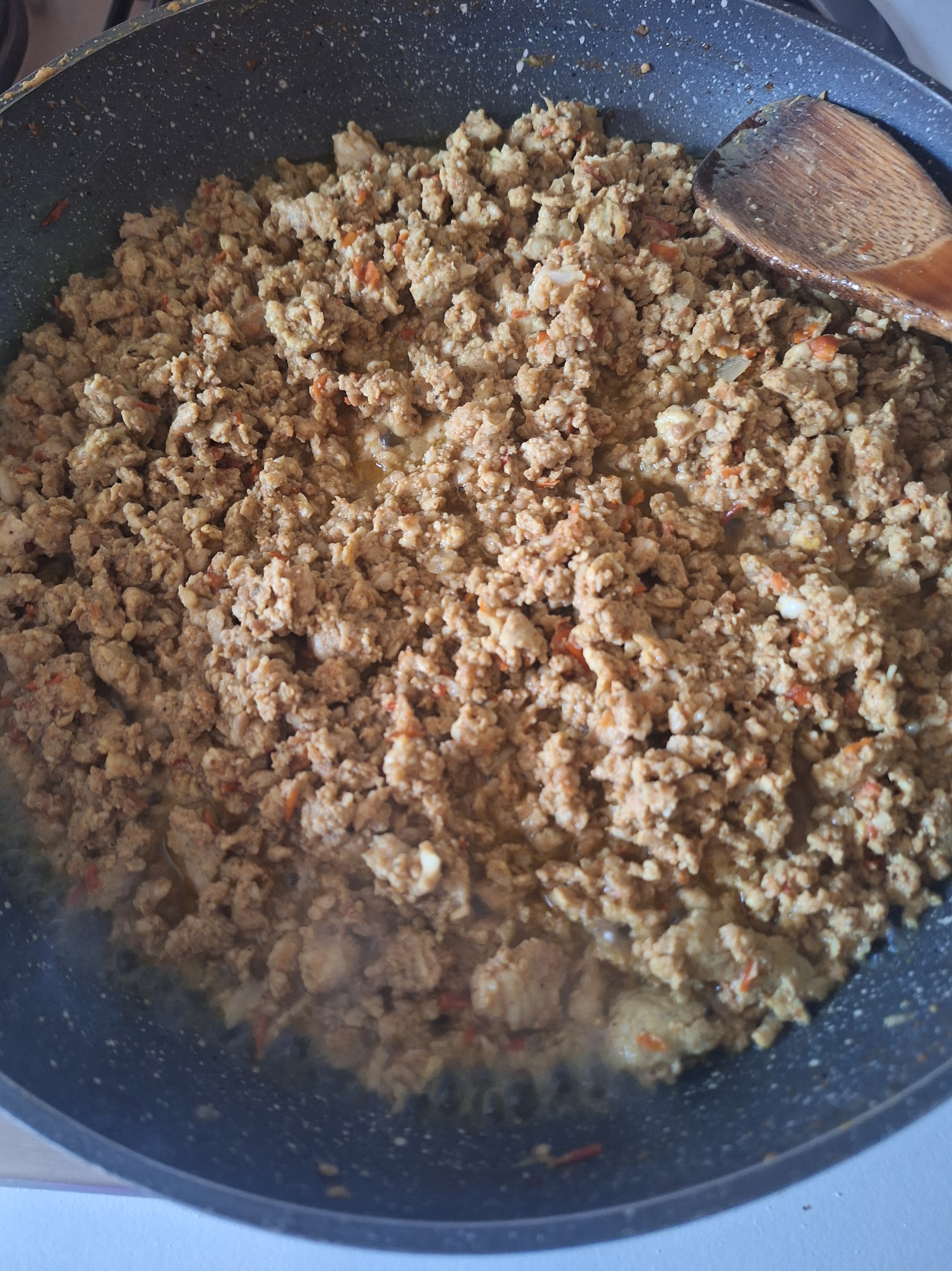 Sazona las pechugas, corta en trozos grandes y tritura en un procesador de alimentos. Vierte en un recipiente grande, añade las especias y la leche de coco y mezcla bien. Cubre con film y macera en el frigo (yo prefiero dejarla toda la noche).