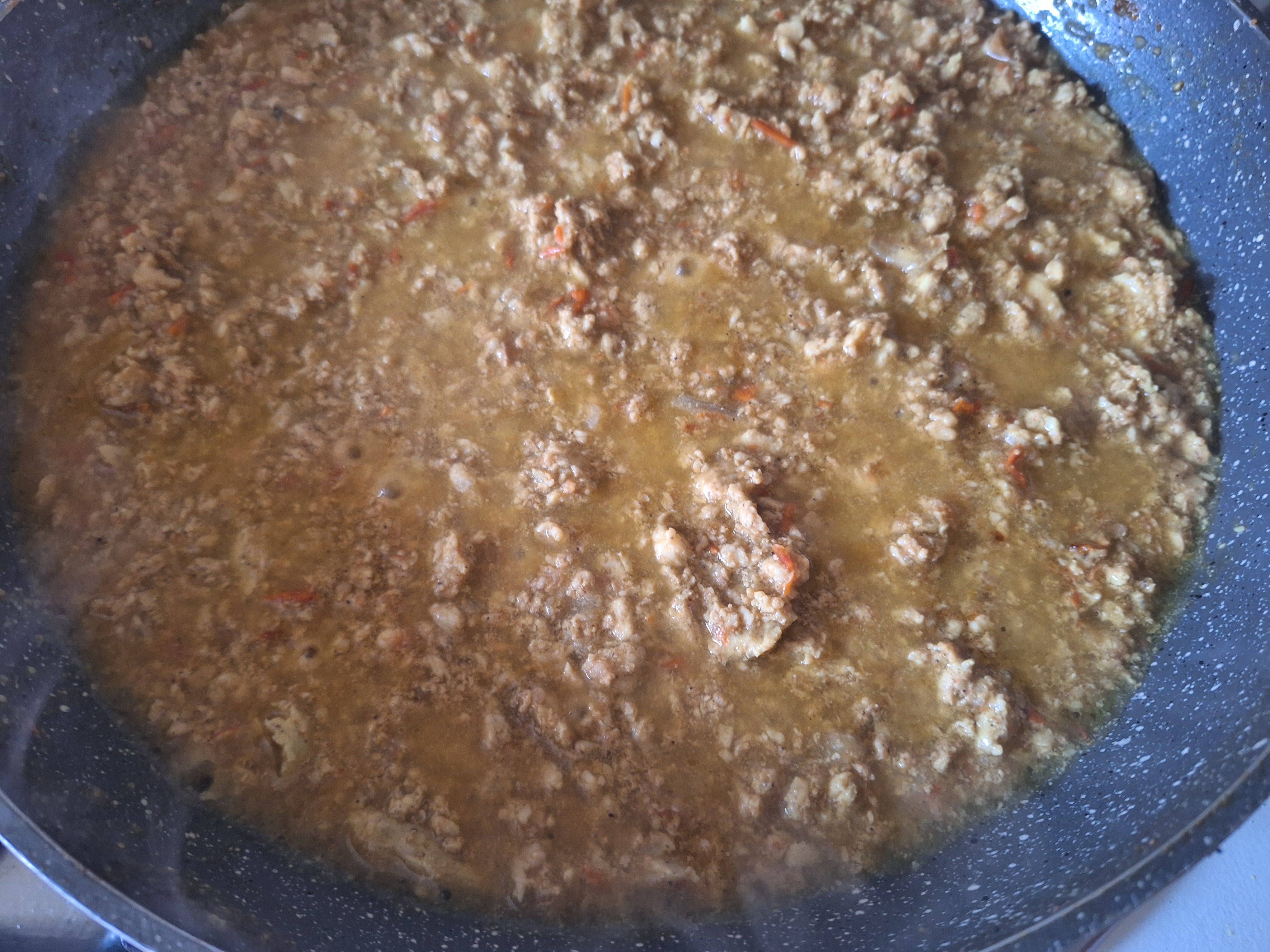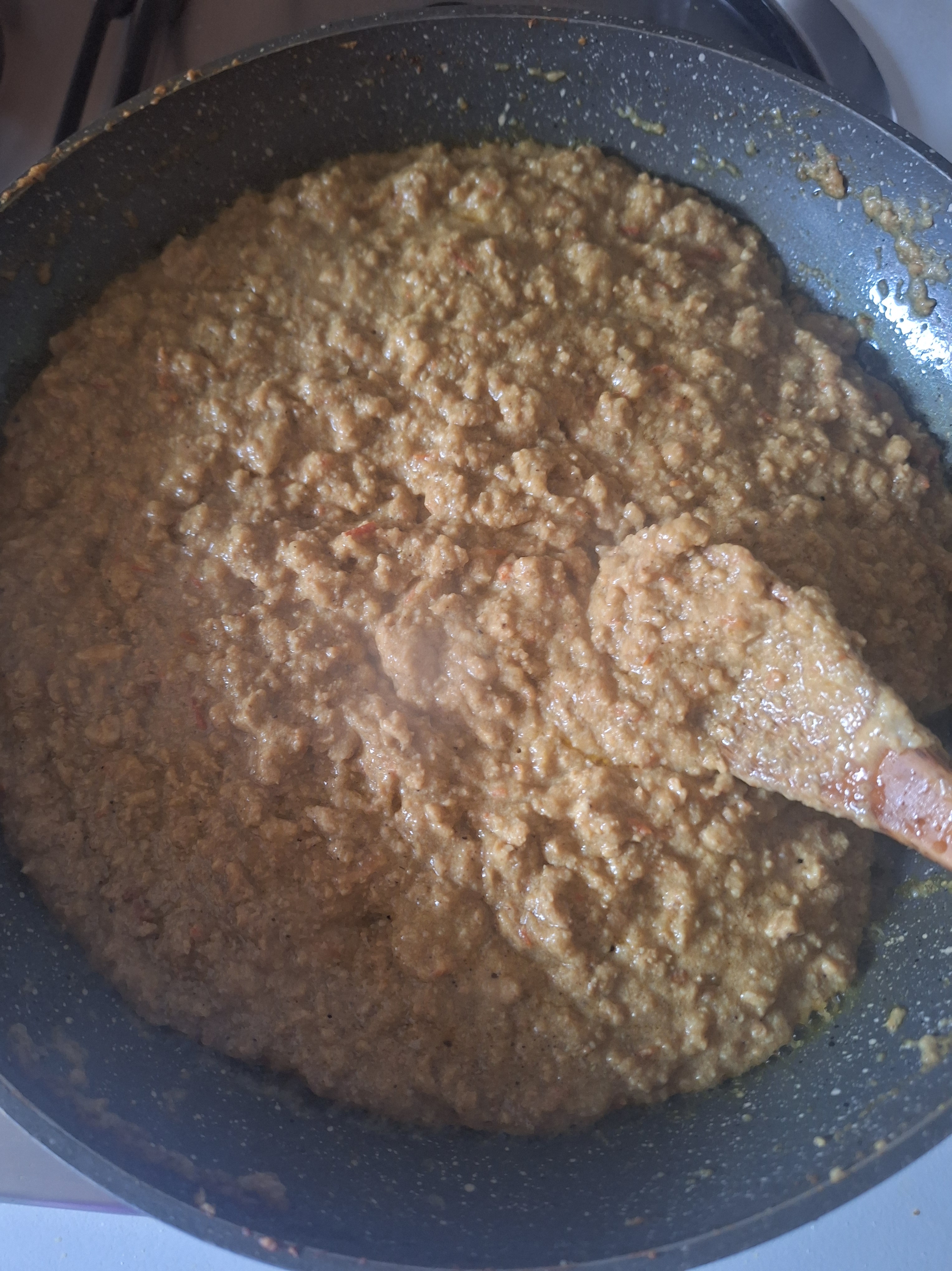 Quise rebajar el sabor picante del relleno con una bechamel de coco y fue un gran acierto. Pero aquí me gustaría daros un consejo: queda estupenda si le vais a añadir queso, porque al gratinarlo se funde y cubre toda la superficie. Sin embargo, yo sólo puse la bechamel porque no puedo tomar lácteos y el resultado no quedó tan chulo. Al final tuve que añadirle por encima más bechamel para que quedara más o menos un resultado cremoso y vistoso.