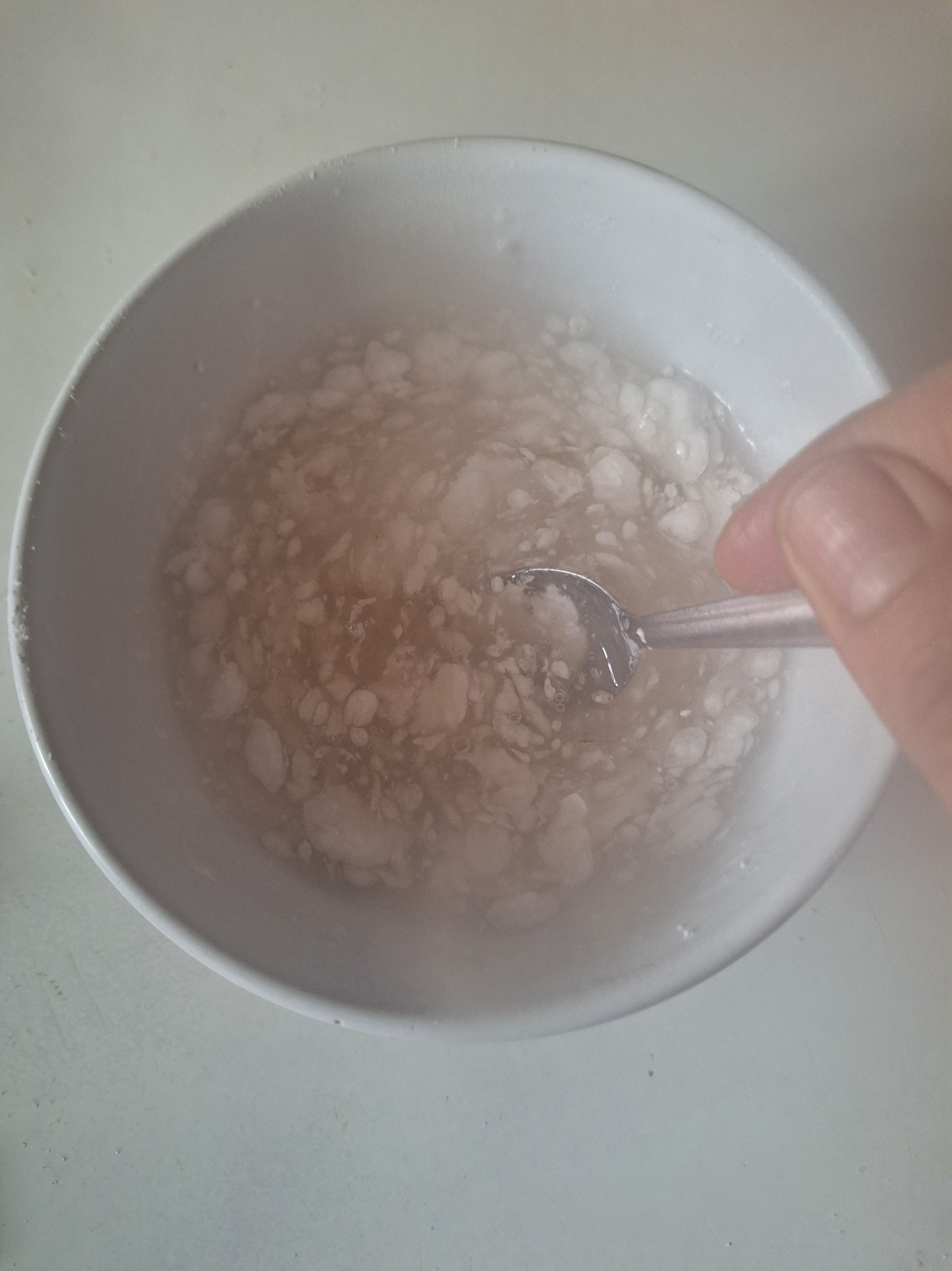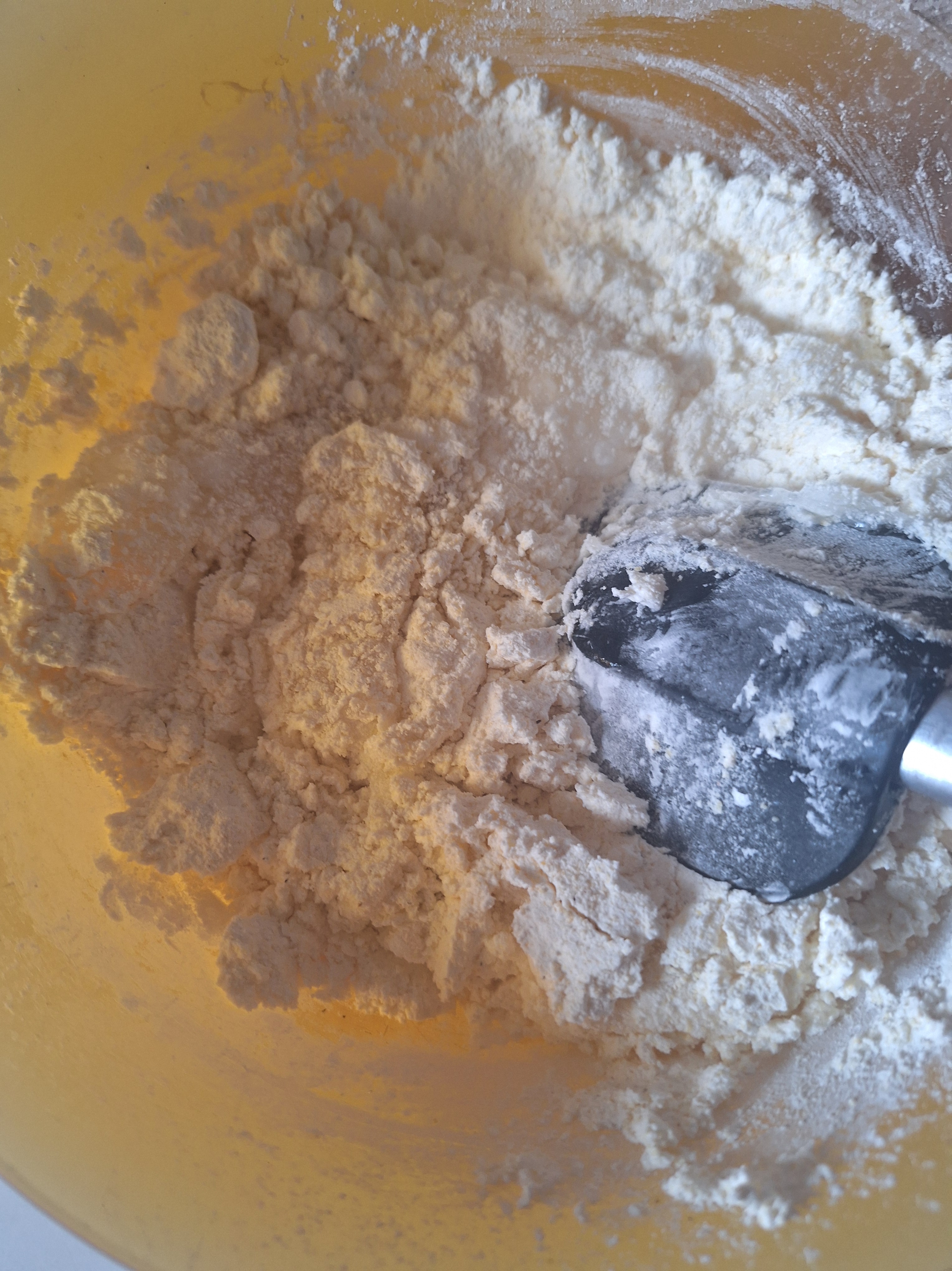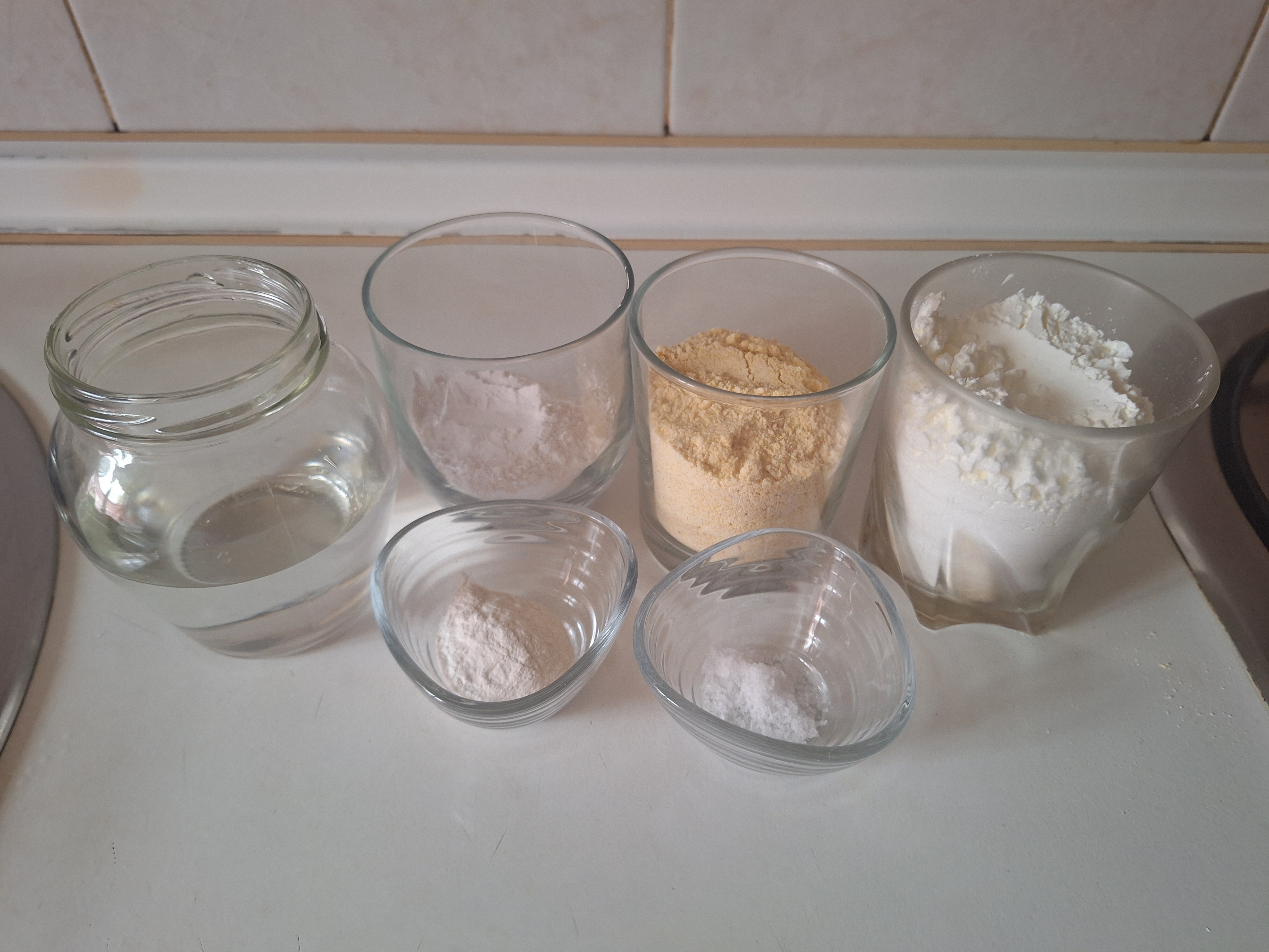 Prepara la pasta: hierve el agua y vierte sobre el almidón de tapioca. Remueve hasta formar un gel. Agrega a los secos tamizados, mezcla con una cuchara de madera.