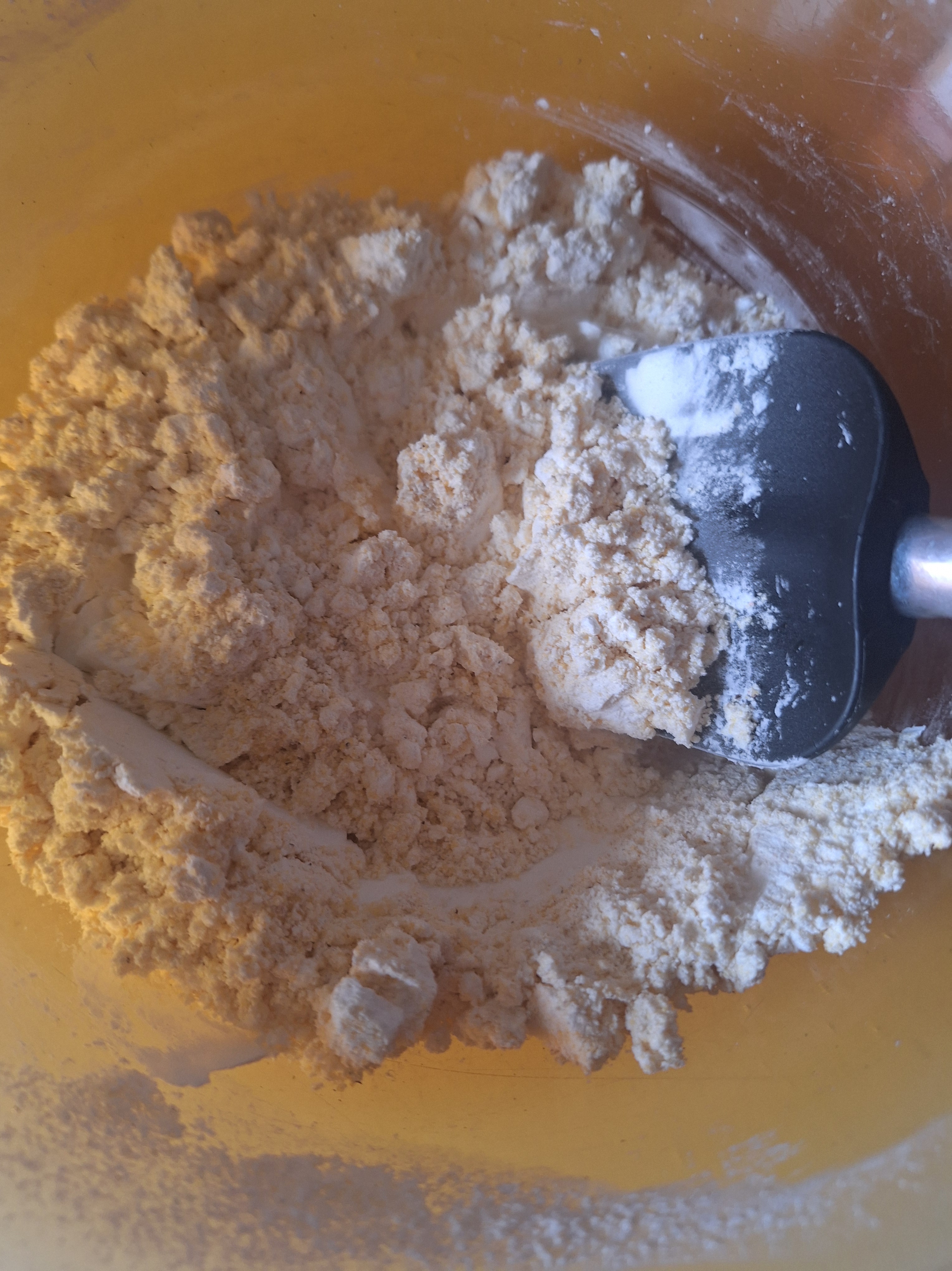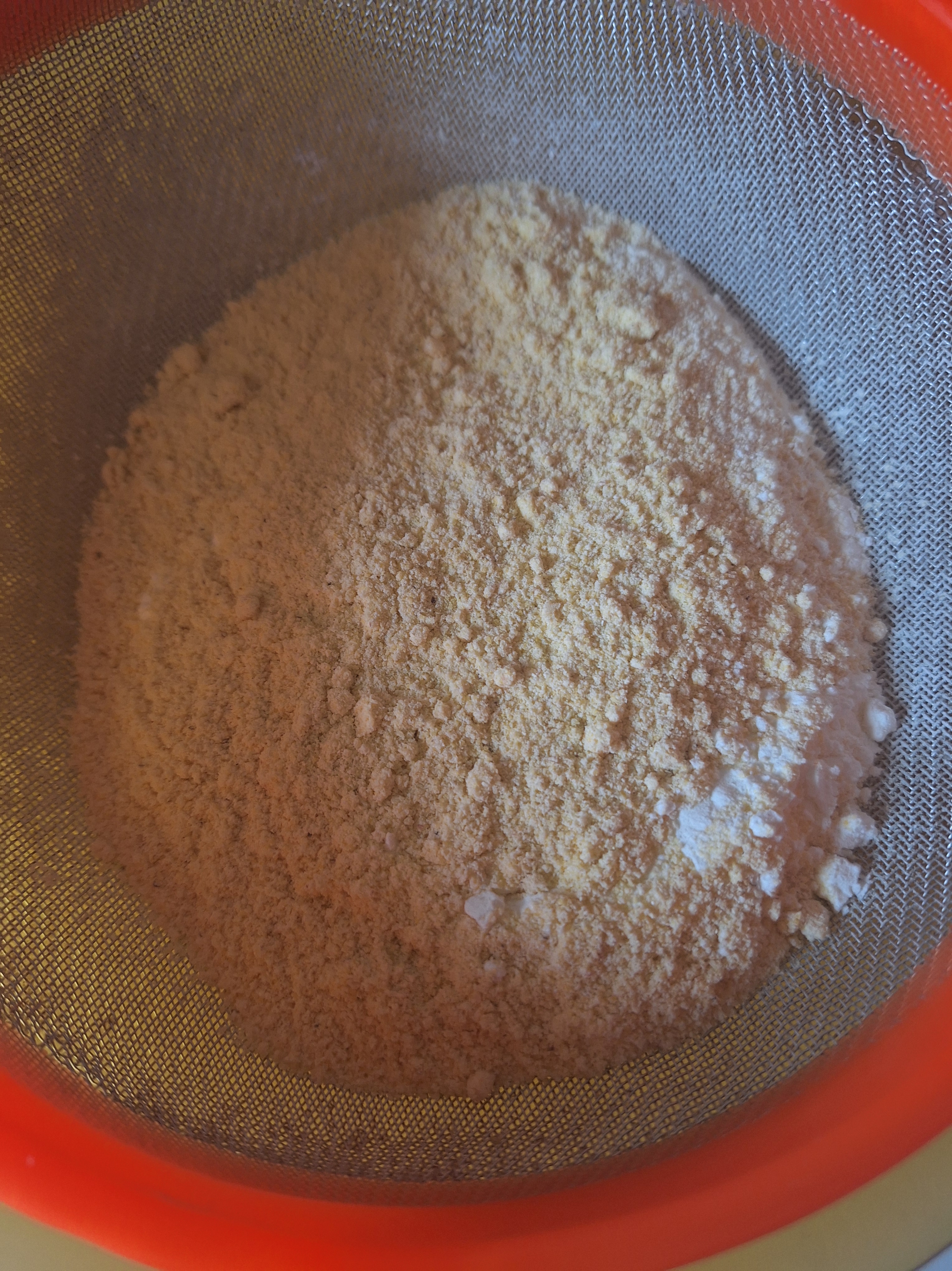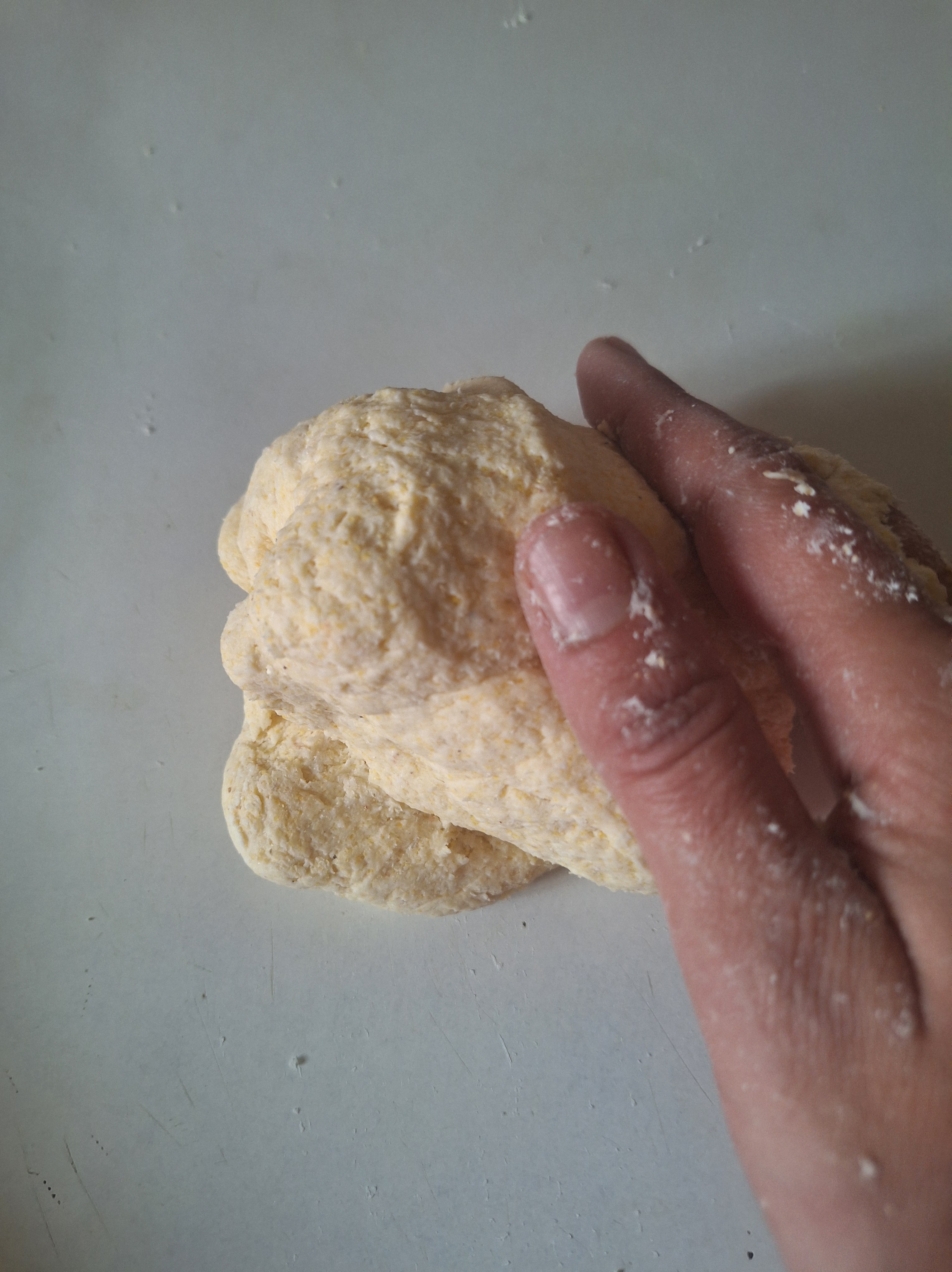 Prepara la pasta: hierve el agua y vierte sobre el almidón de tapioca. Remueve hasta formar un gel. Agrega a los secos tamizados, mezcla con una cuchara de madera.