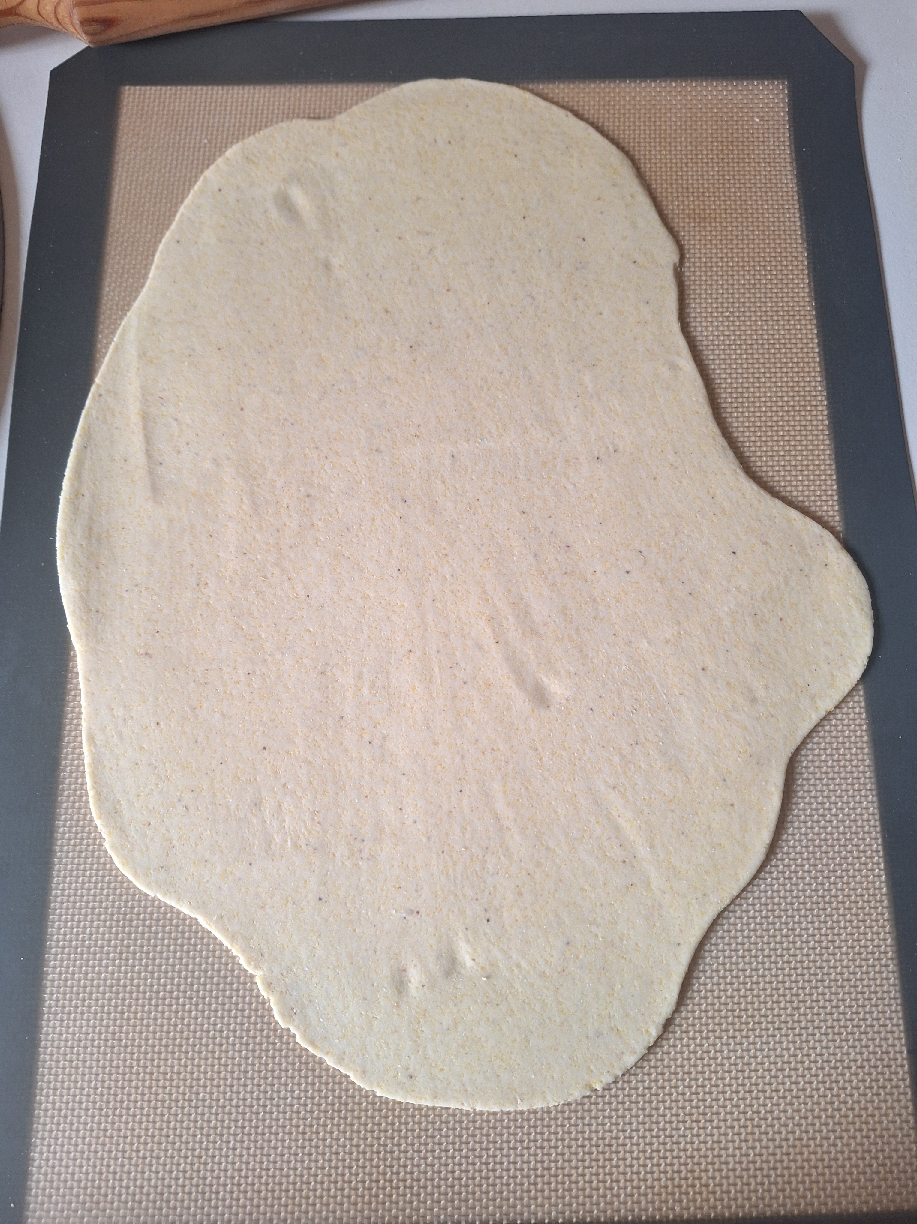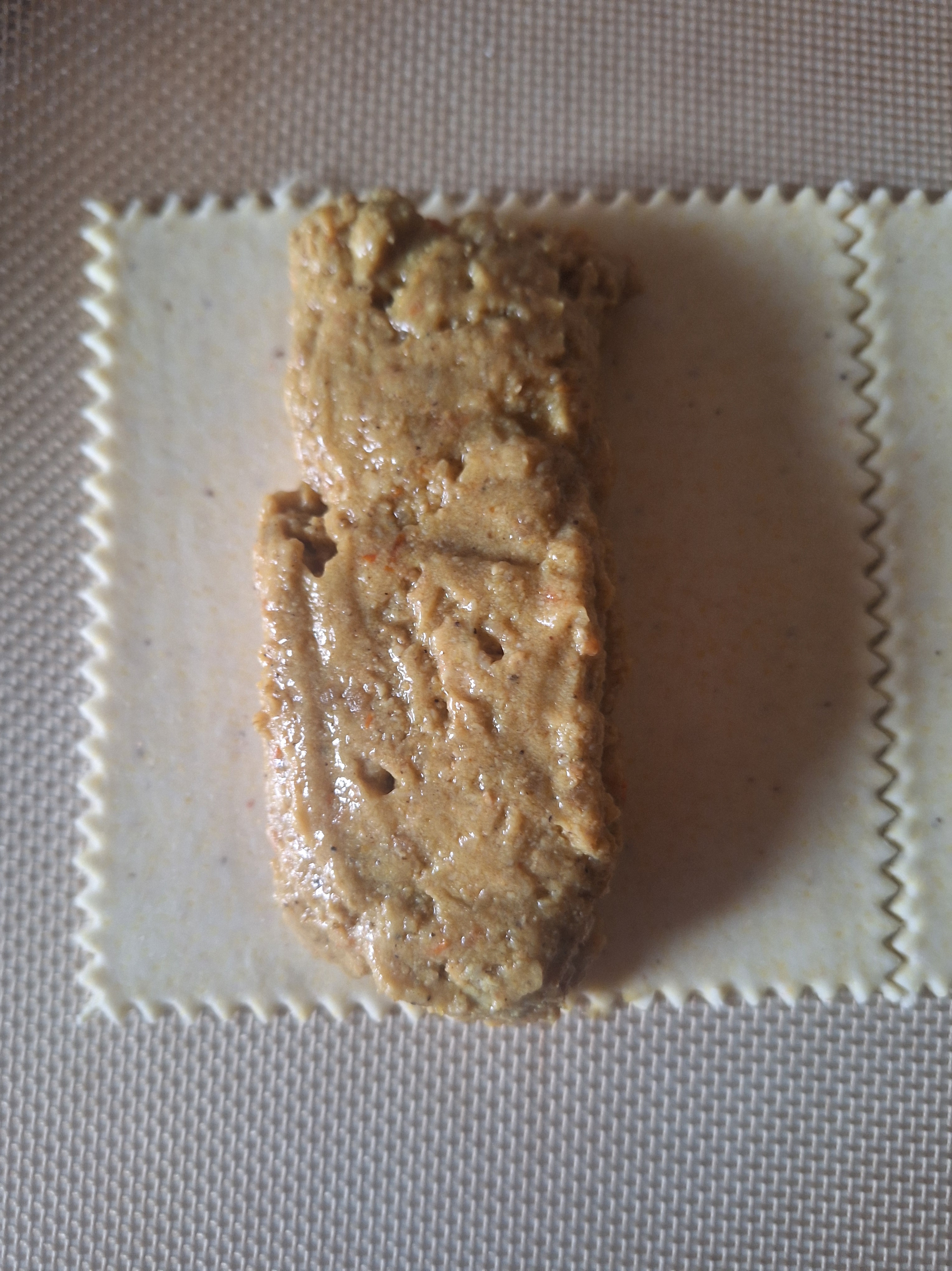 Cuando esté todo integrado, amasa hasta obtener una masa lisa. Divide en dos porciones (envuelve la que no utilices con papel film) y estira (cuanto más finita, mejor), con un rodillo, sobre papel sulfurizado. Si se pega demasiado, espolvorea la superficie con un poco de harina, al igual que el rodillo. Corta en cuadrados y rellena con el pollo, dejando el cierre hacia abajo.