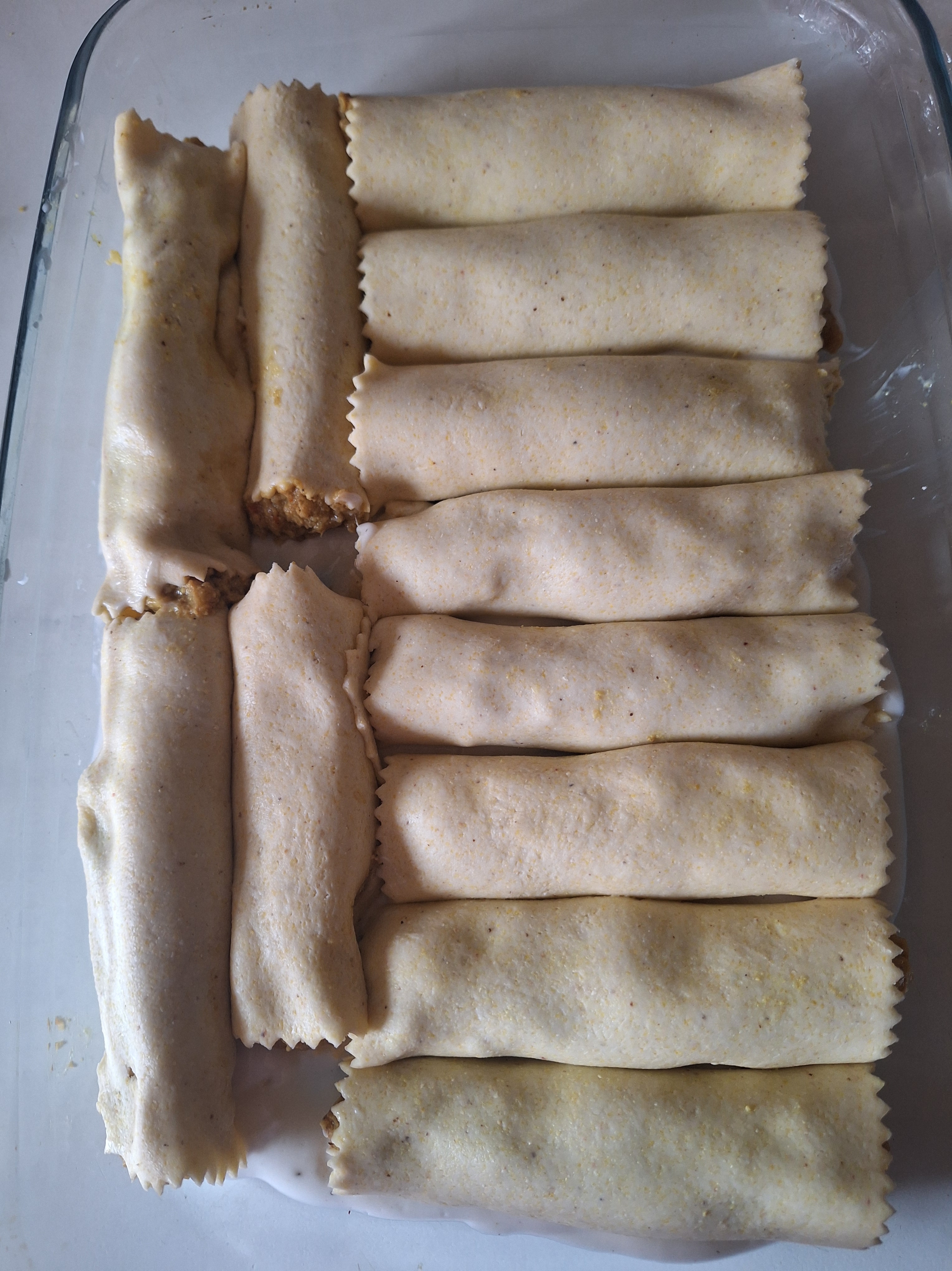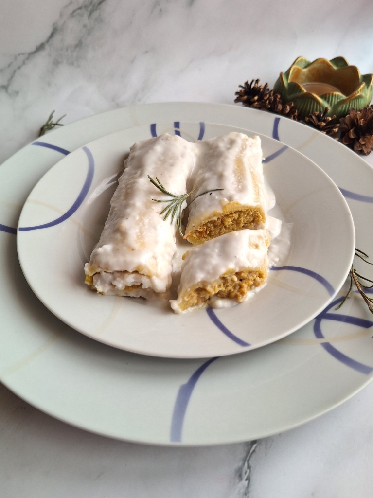 Precalienta el horno a 180ºC. Prepara la bechamel: separa un poco de leche de coco para disolver la maicena (en frío) y pon a calentar el resto. Cuando empiece a hervir agrega la maicena y remueve constantemente hasta que la textura espese. Vierte un poco de la bechamel en un recipiente para horno, coloca los canelones sobre ella y cubre con un poco de bechamel. Hornea a 180ºC hasta que se dore un poco.