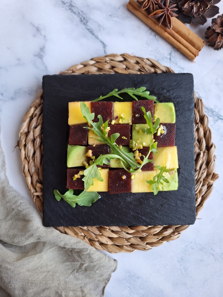 MOSAICO DE AGUACATE, REMOLACHA Y MANGO