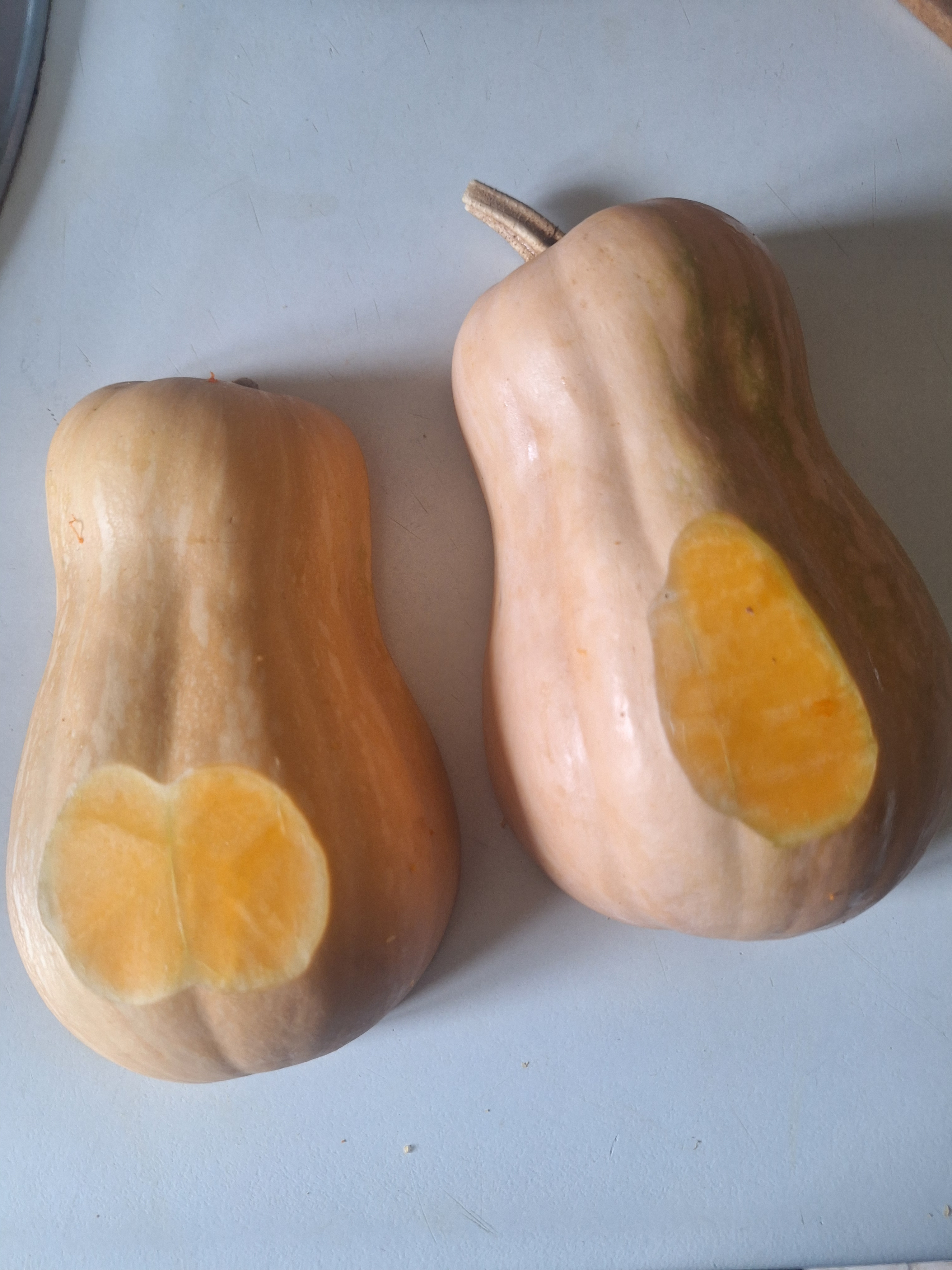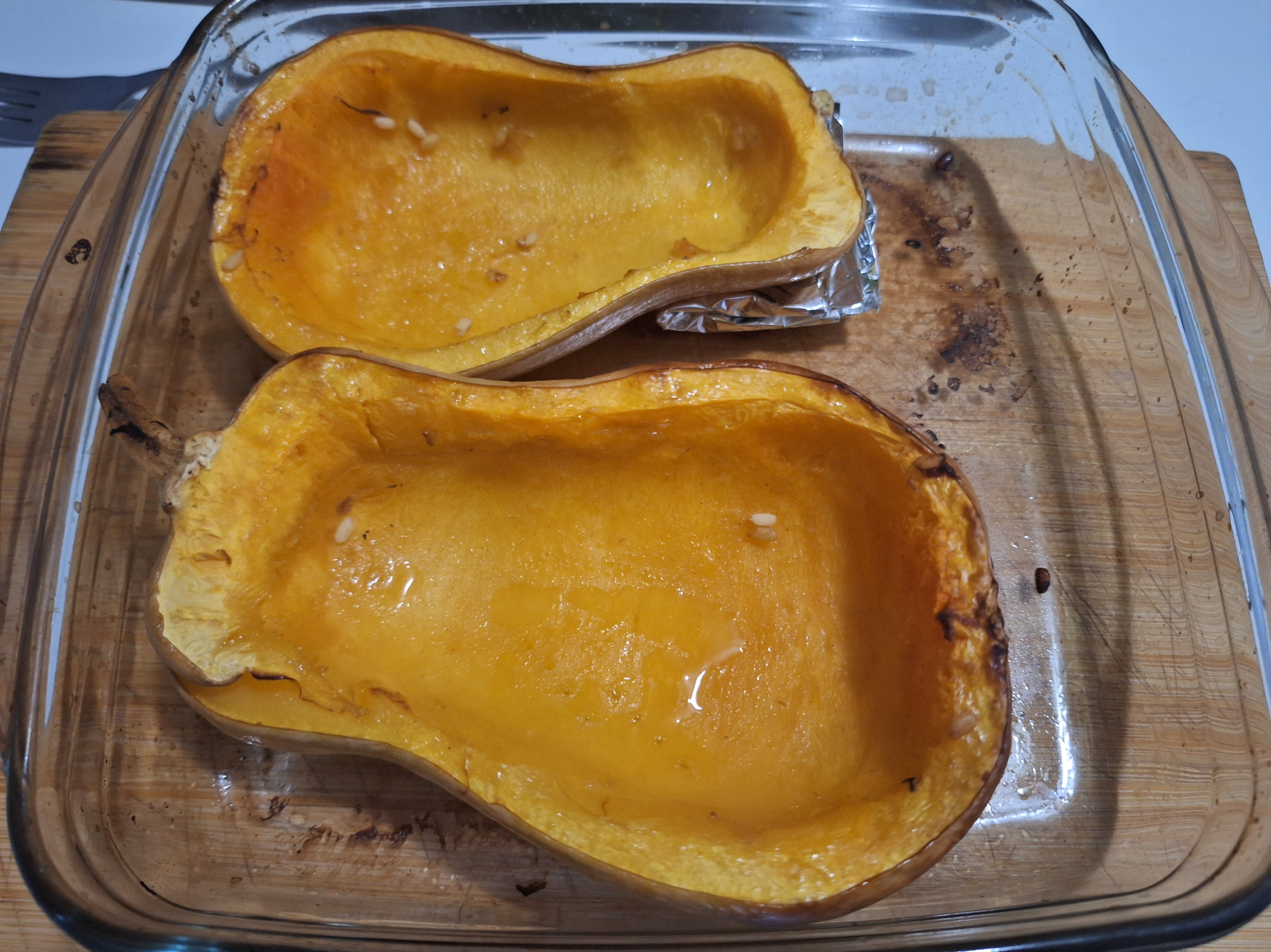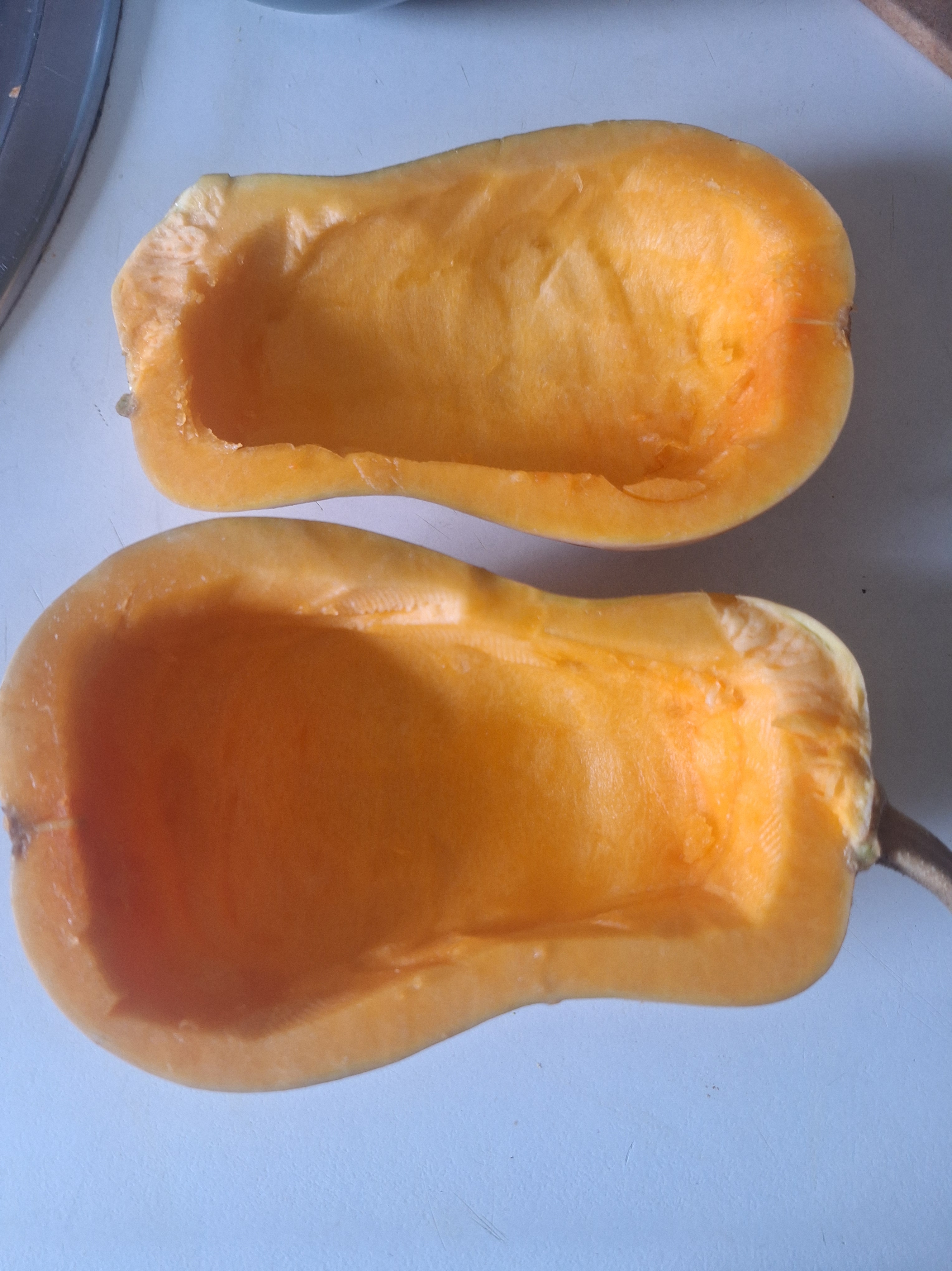 Con cuidado corta la calabaza a la mitad, retira las semillas y saca la pulpa con una cuchara o un sacabodados, dejando un borde de ½ centímetro.