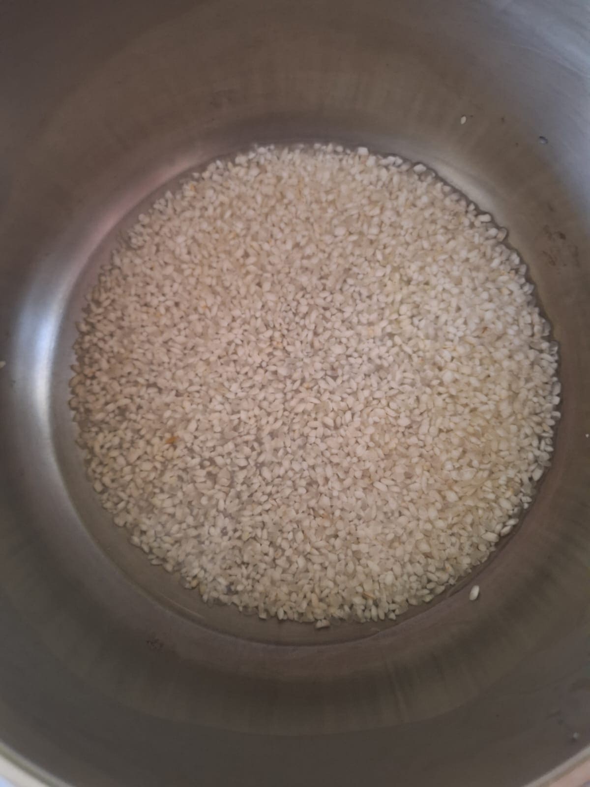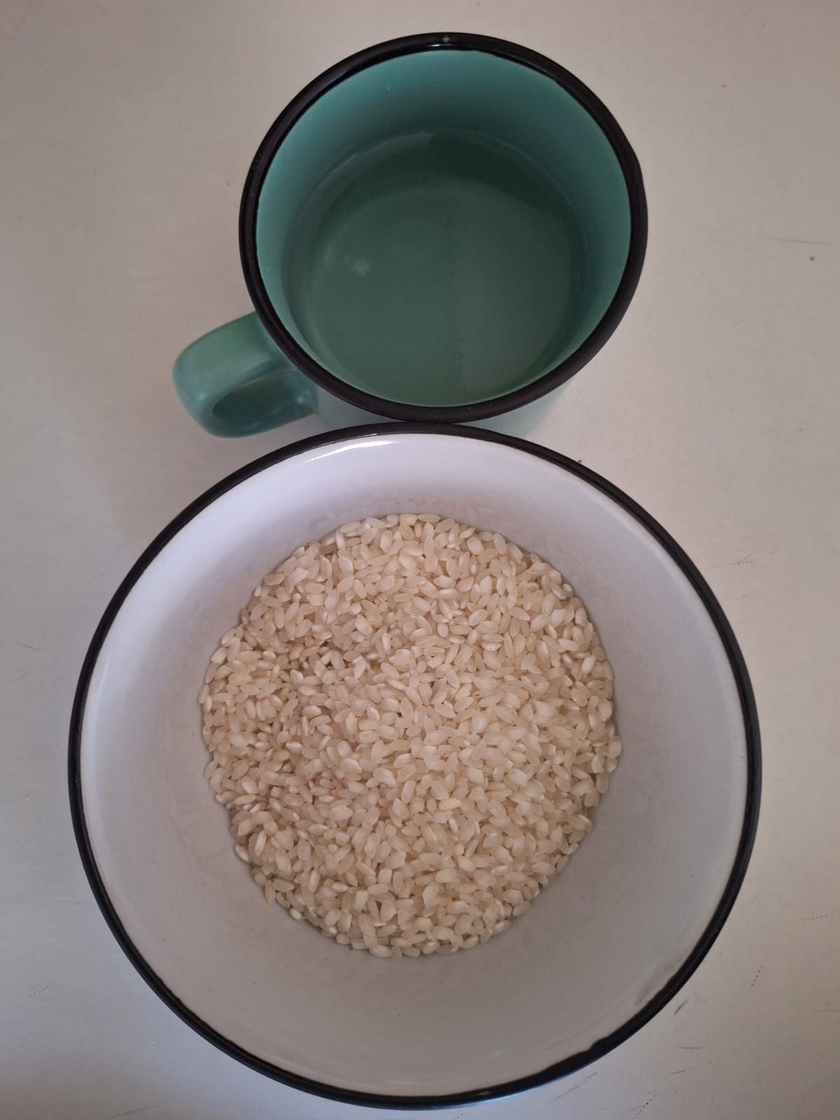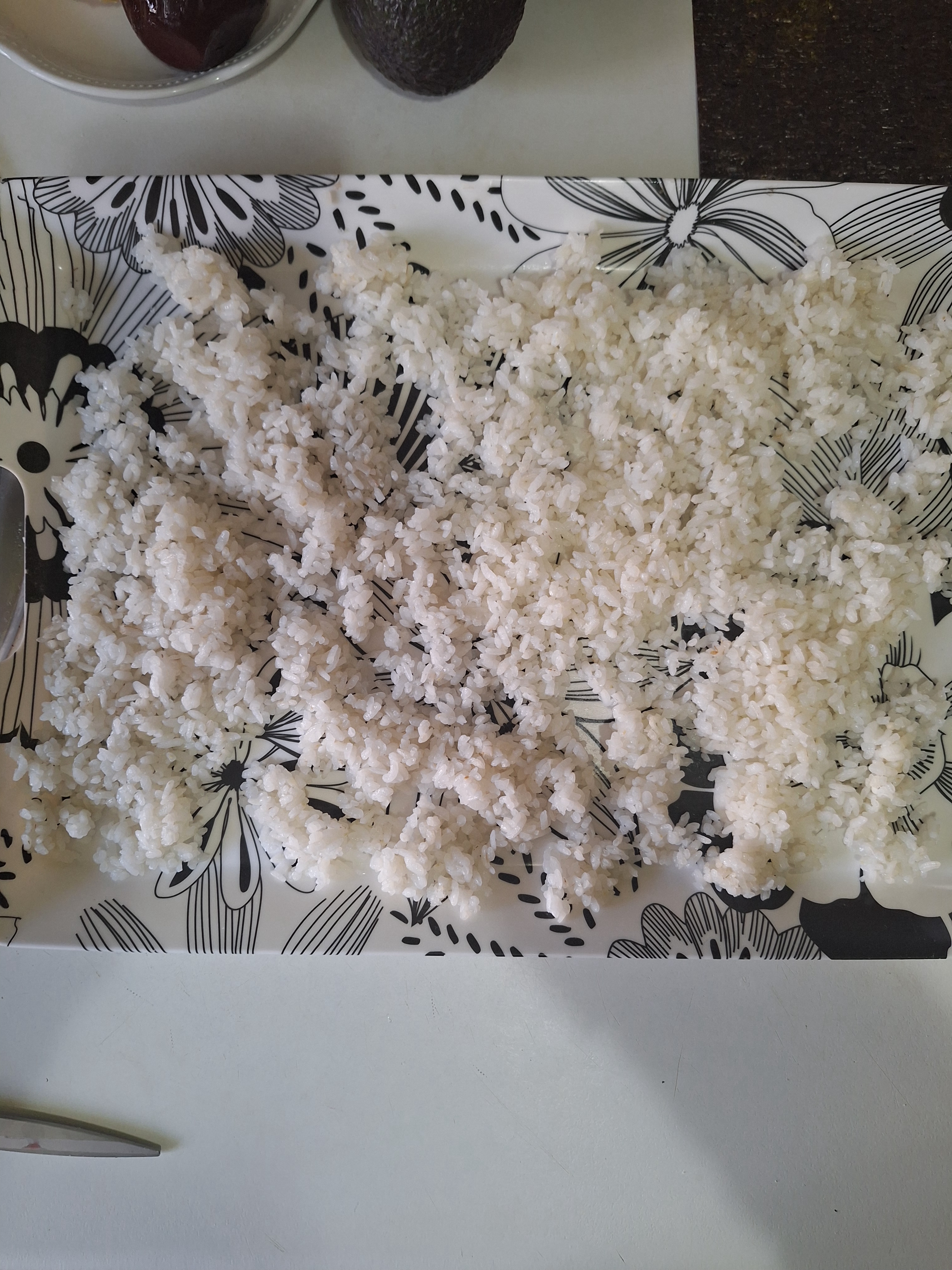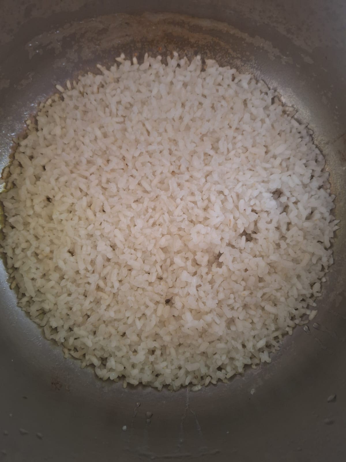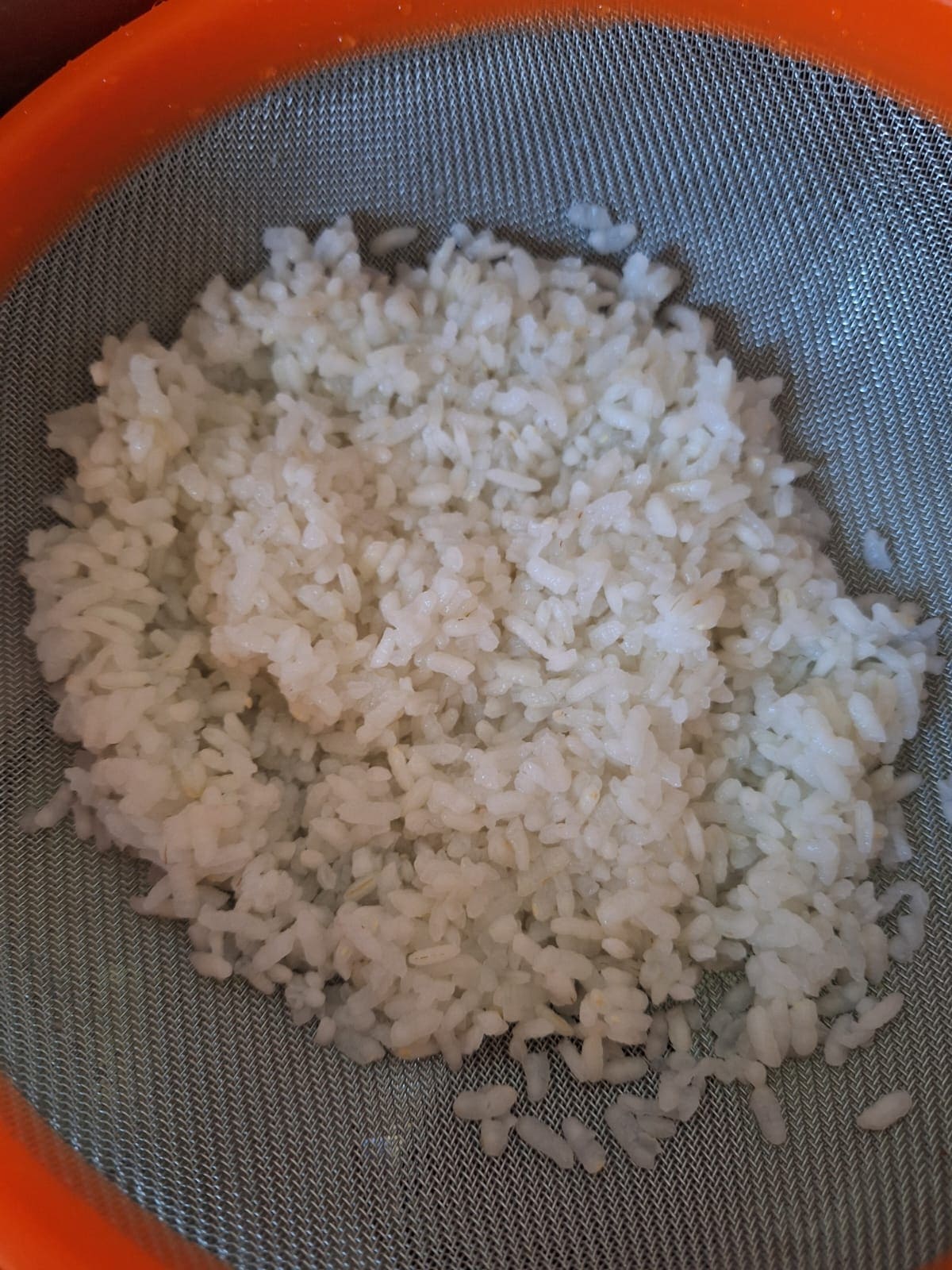 Lava bien el arroz hasta que el agua salga clara. Pon a calentar con doble volumen de agua. Cuando empiece a hervir reduce el fuego, cubre con tapadera y cocina 10 minutos. Apaga el fuego y reposa otros 10 minutos tapado. Extiende sobre una bandeja.