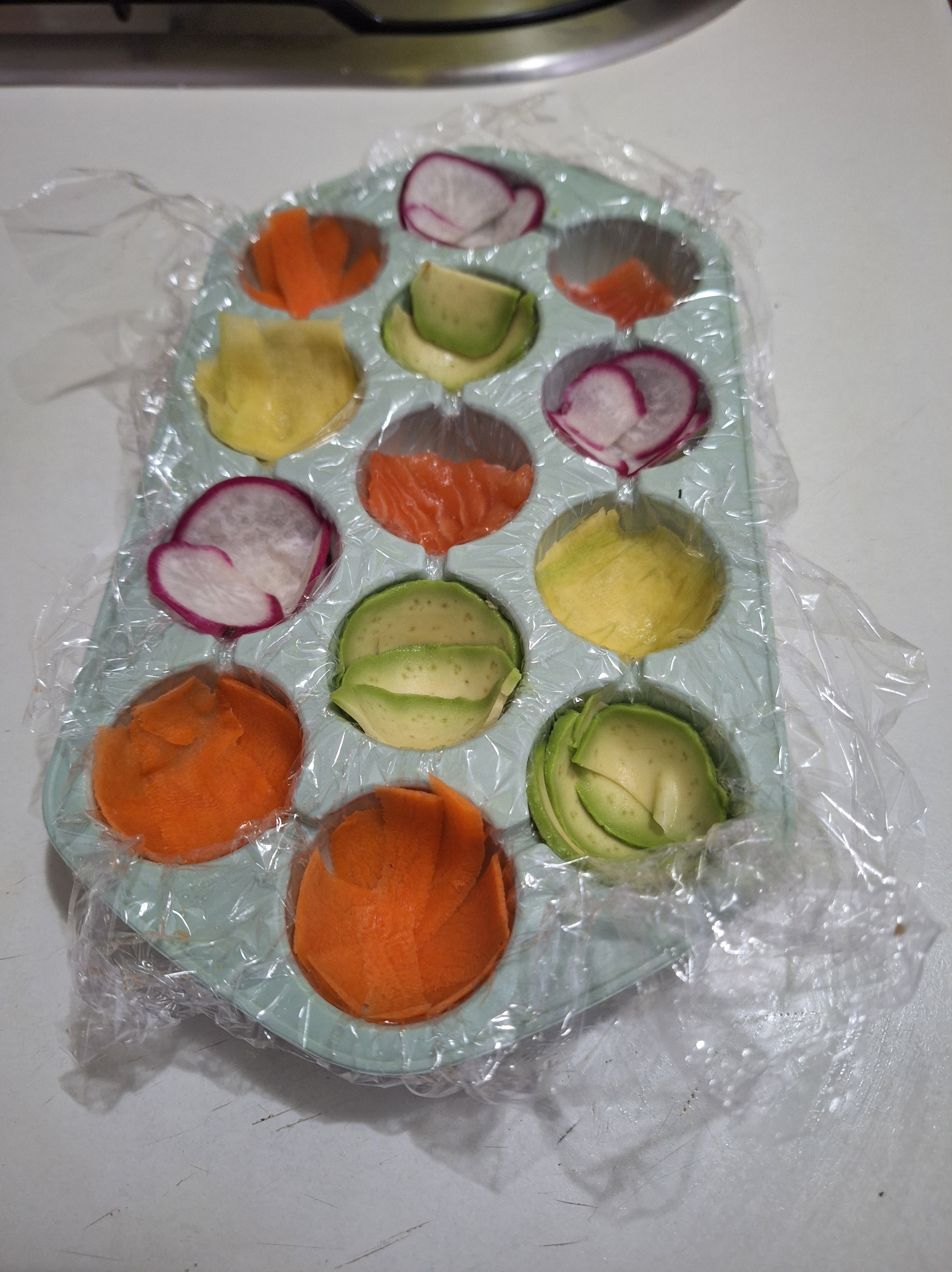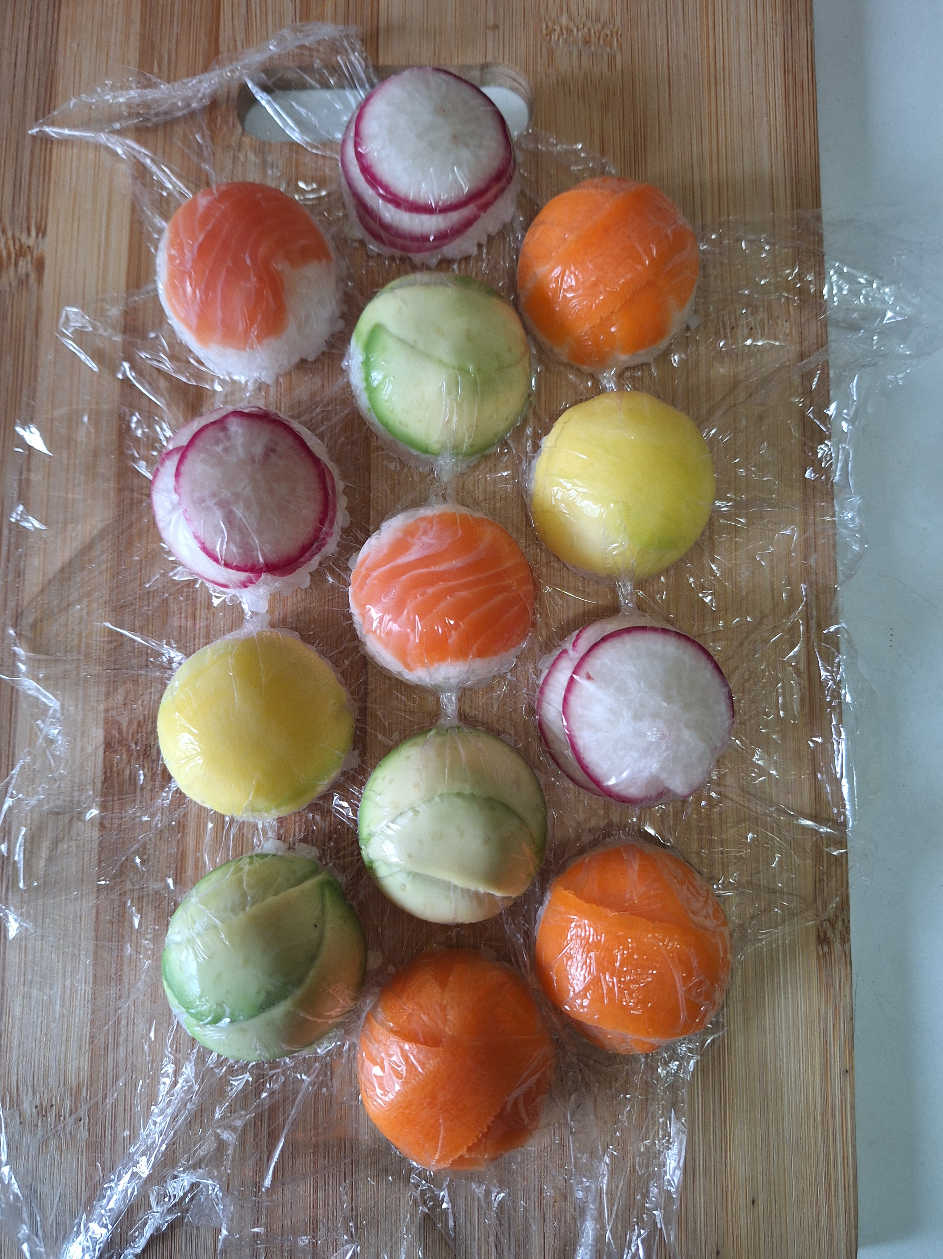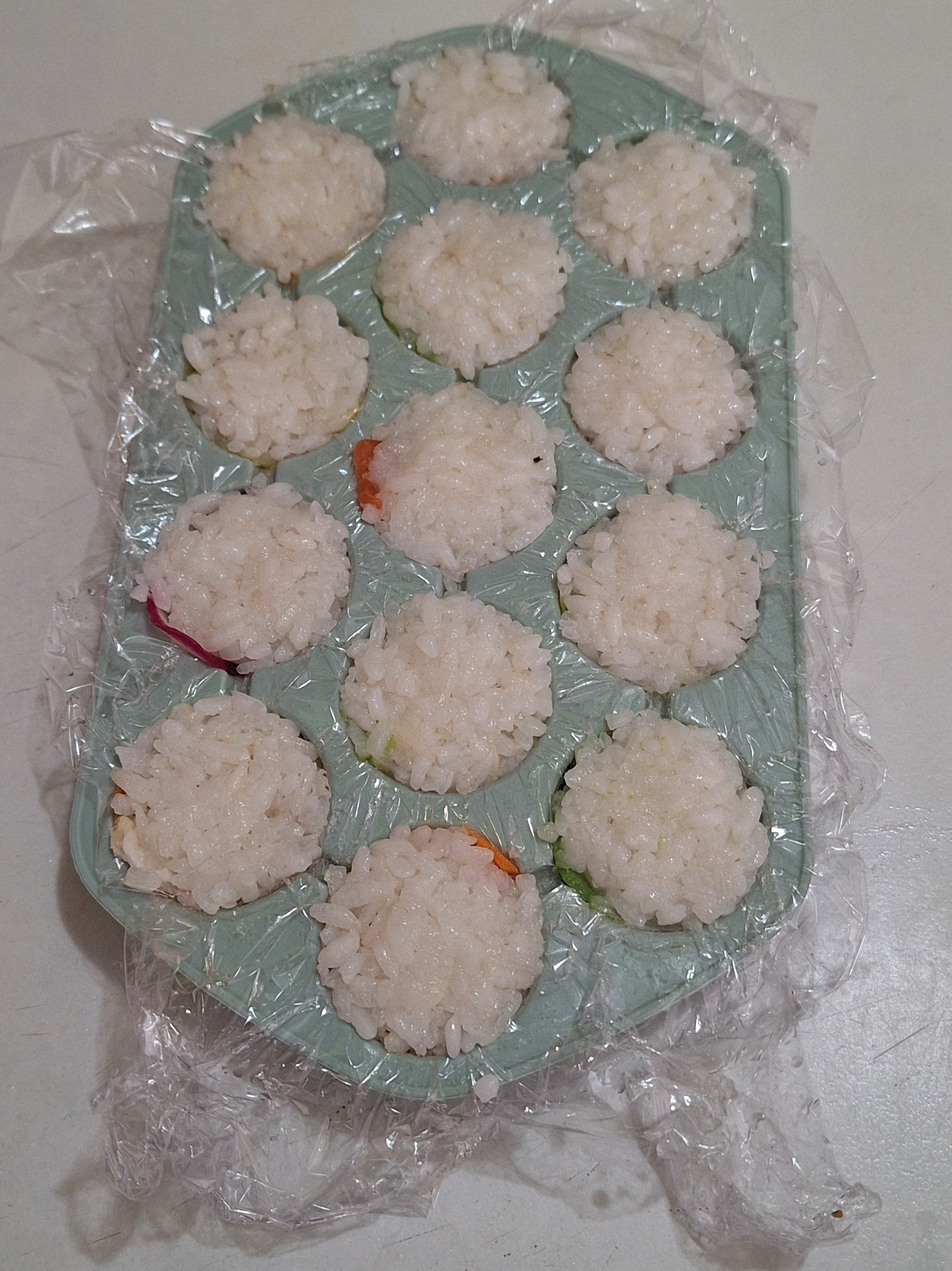 Corta los toppings finamente. Cubre una cubitera con film y coloca en el fondo los toppings. Rellena con arroz y presiona para compactar. Deja enfriar y desmolda.