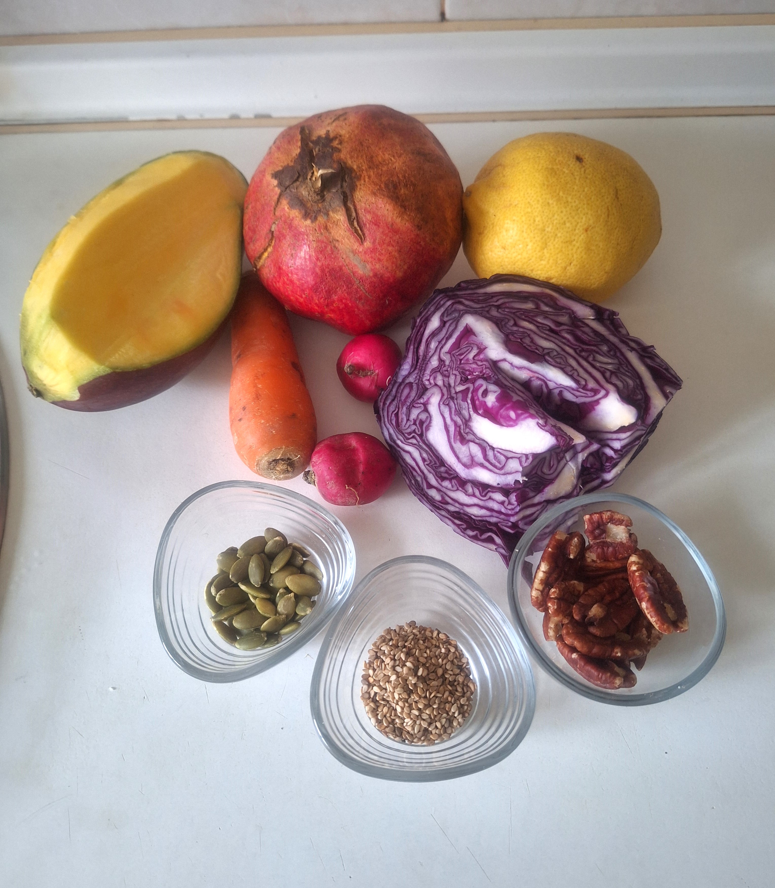 Pela la zanahoria y el mango y corta en tiras finas (yo utilicé un rallador). Pela y retira las semillas de granada. Lava los rabanitos y corta en rodajas muy finas.