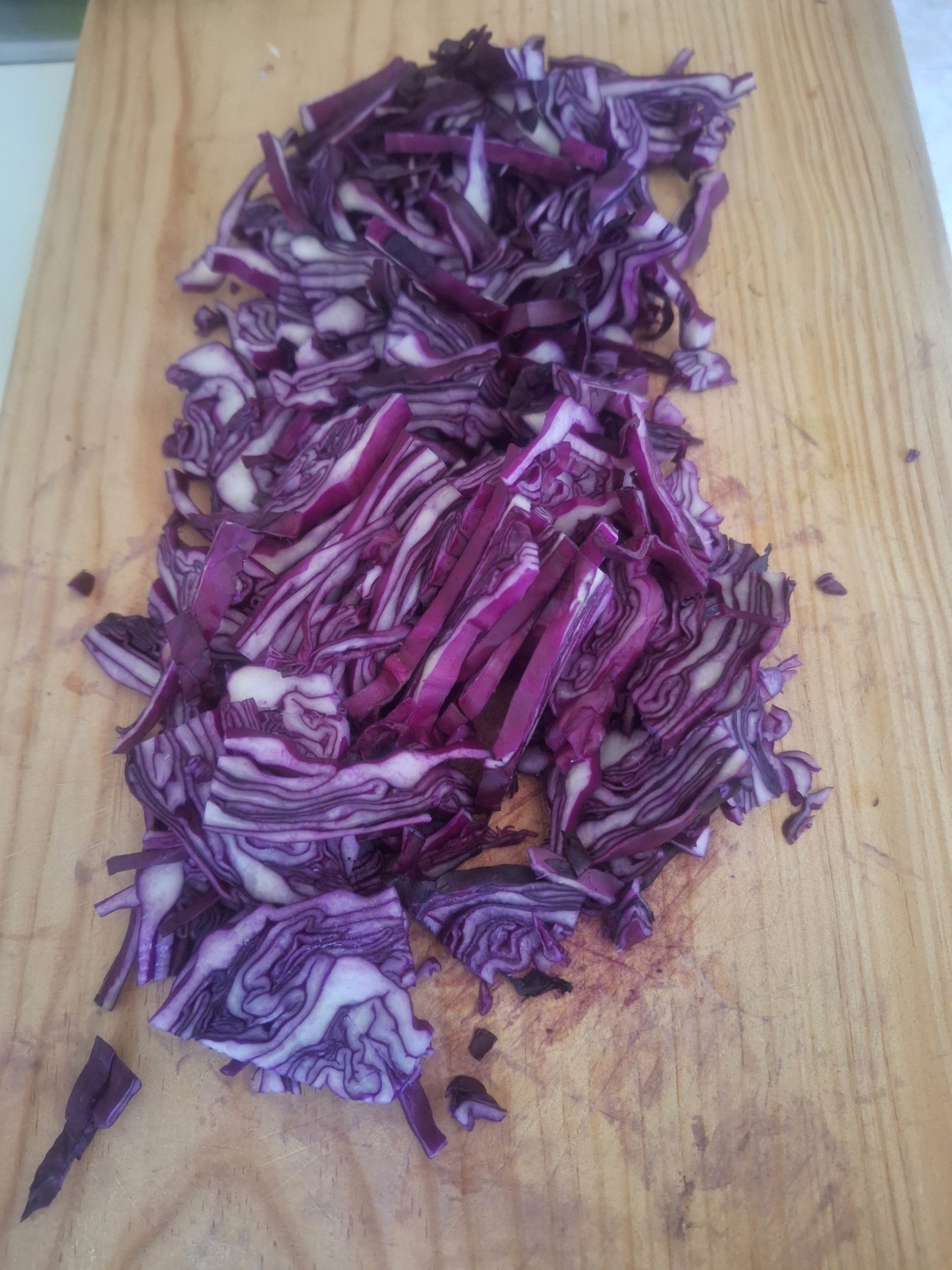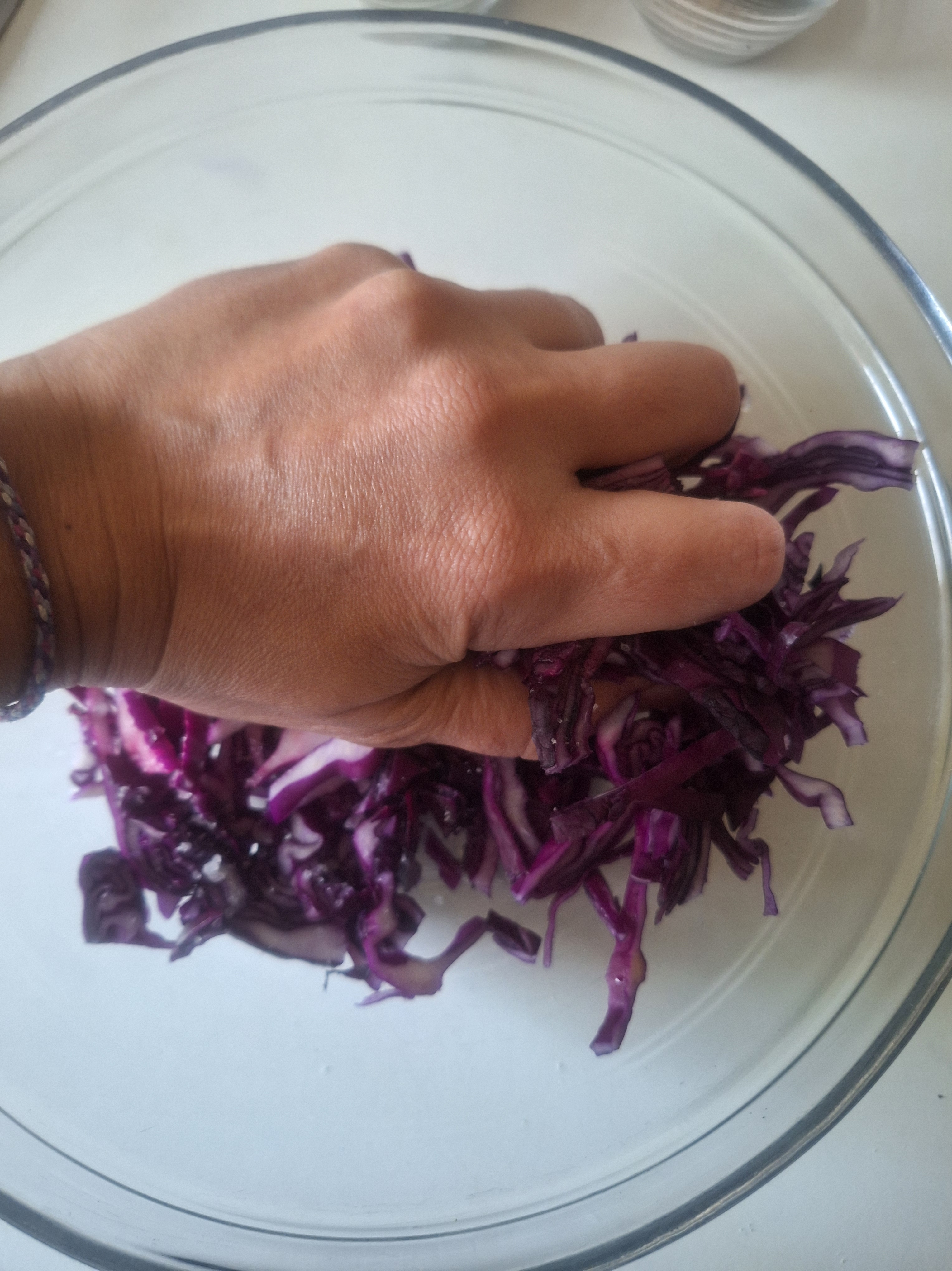 Retira las hojas externas de la lombarda y quita la parte central más dura. Corta el resto en tiras finas. Sazona, añade zumo de medio limón y masajea con las manos (para que suelte el agua y adquiera una textura más maleable). Reposa unos 10 minutos.