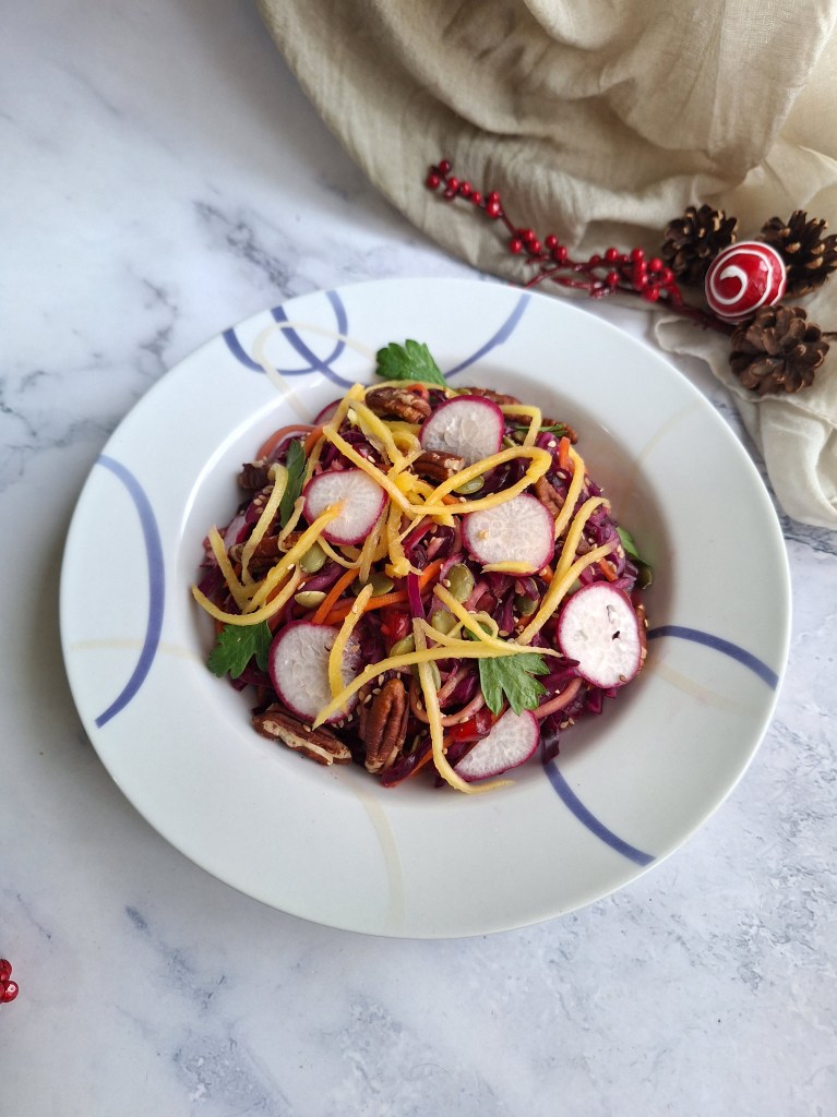 Si hay algo que no puede faltar en una mesa navideña es una ensalada. Y si hay una hortaliza asociada a estas fechas es la lombarda (y también la escarola). Me encanta la lombarda en crudo, con su color tan vivo y vibrante. Me encanta su textura crujiente y fresca y lo bien que combina con los sabores dulces. Y si no me creéis, os animo a darle una oportunidad a esta receta. Os aseguro que si la probáis, se puede convertir en una de vuestras ensaladas favoritas. ¿Qué apostamos?