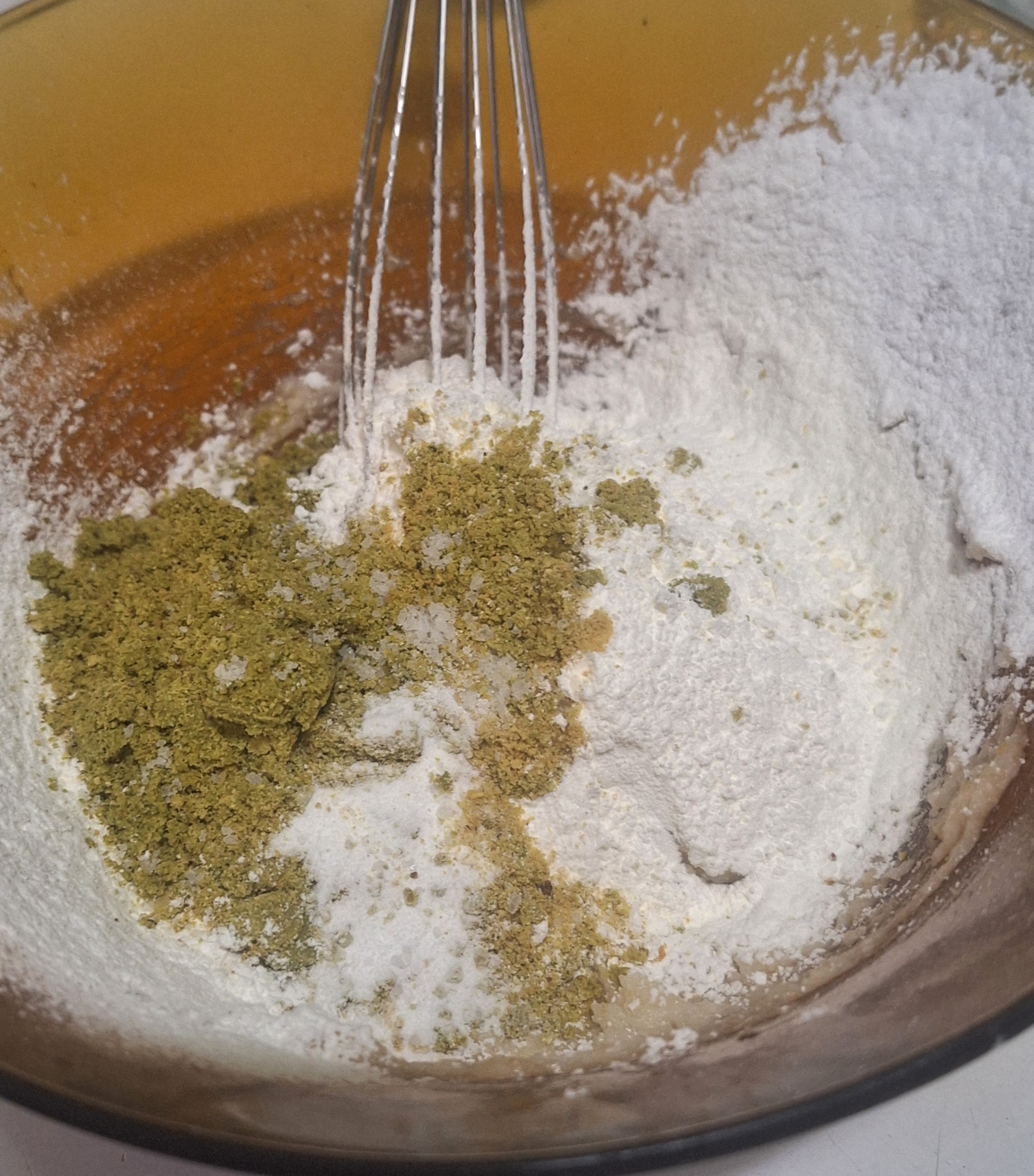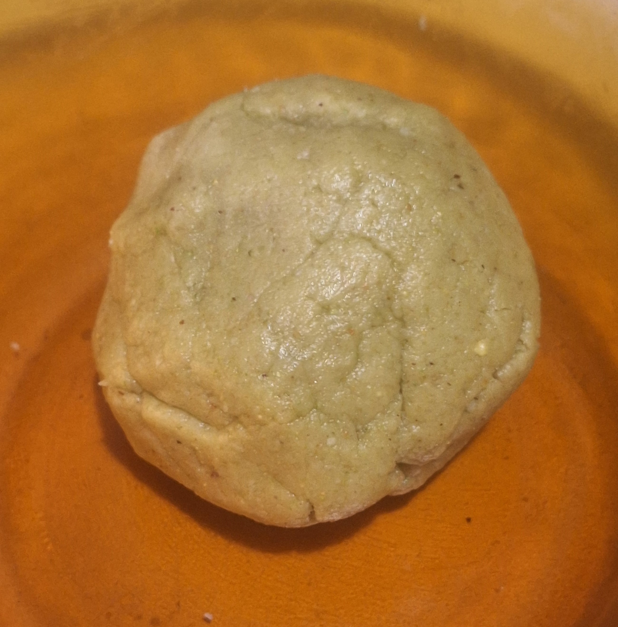 Mezcla la mantequilla de coco con el eritritol. Añade el huevo de lino y la esencia de vainilla e integra. Agrega el almidón de maíz y los pistachos tamizados, el polvo de hornear y la pizca de sal. Mezcla con las manos y haz una bola. Deja reposar en la nevera 30 minutos.