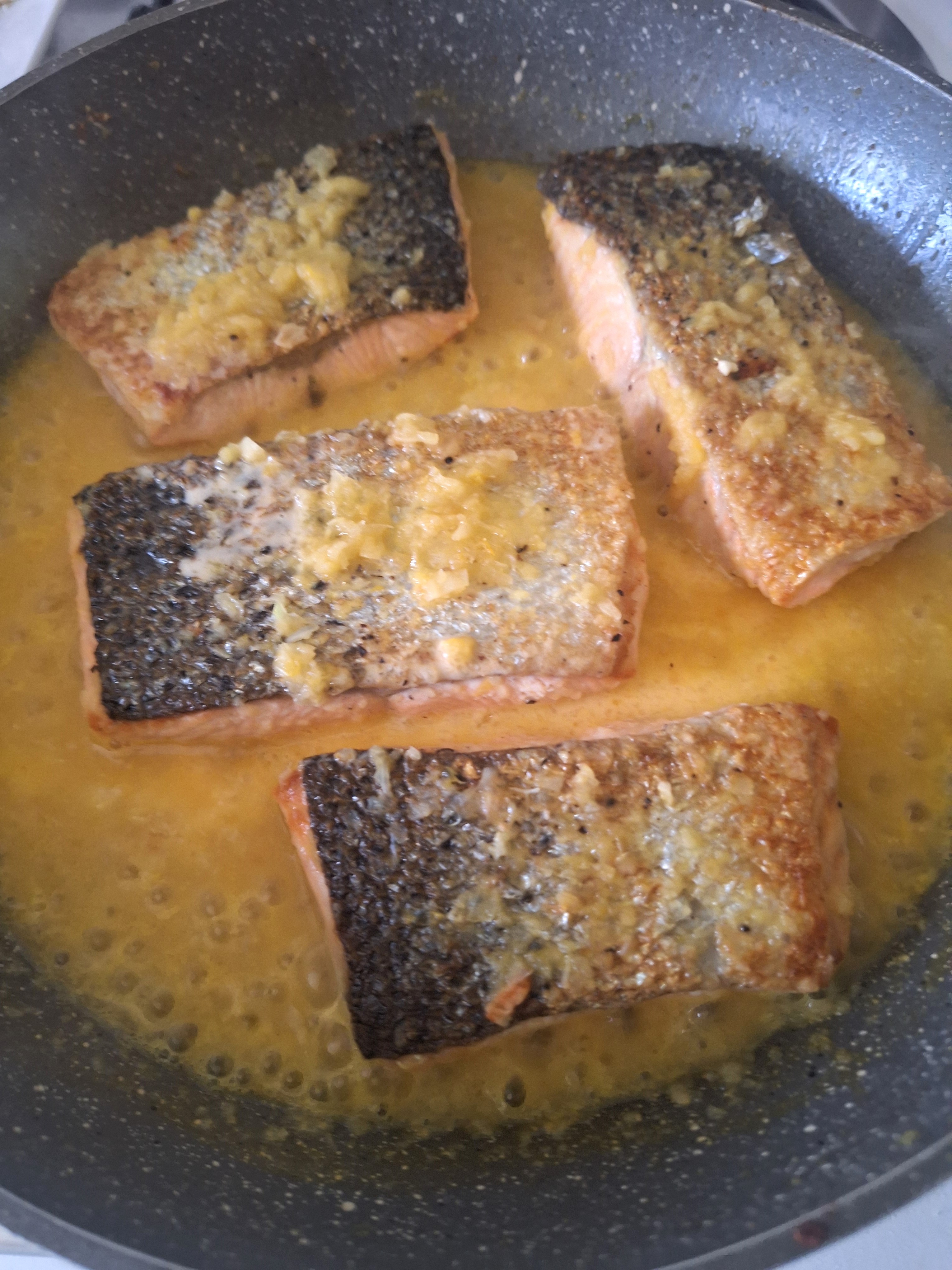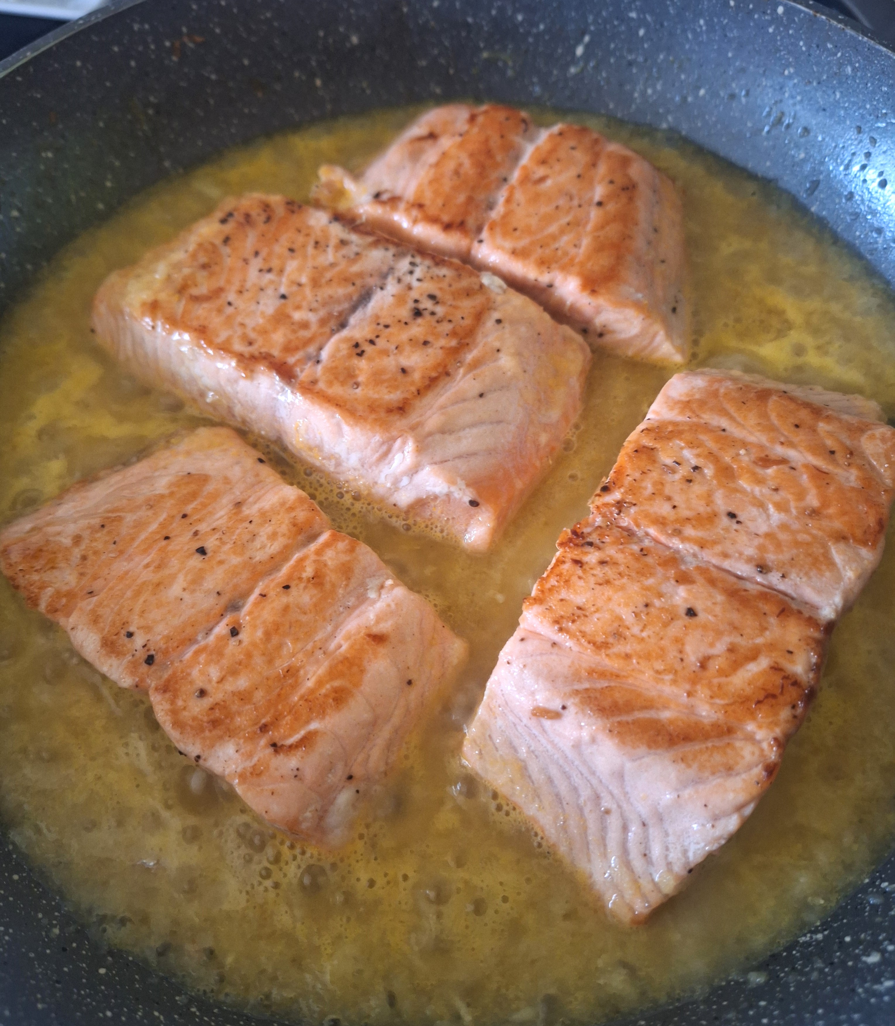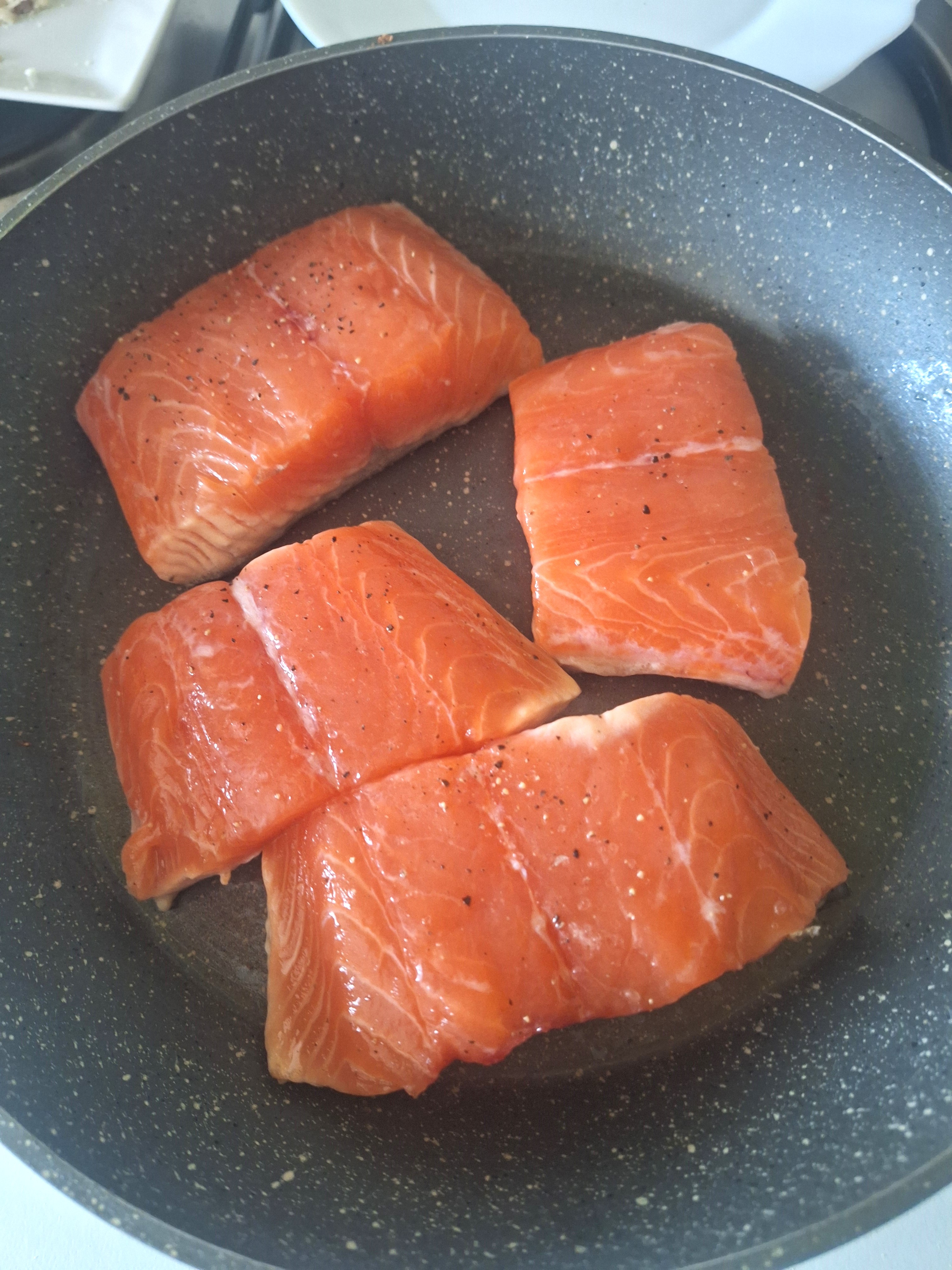 En un poco de aceite dora los lomos de salmón a fuego medio. Retira y reserva.