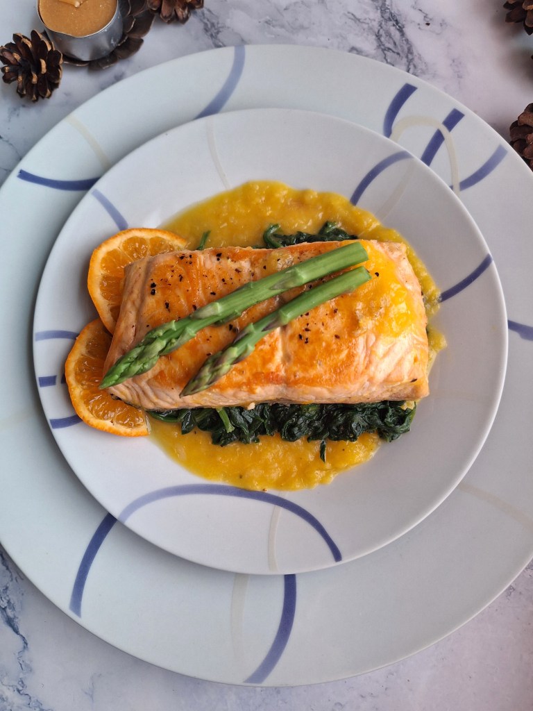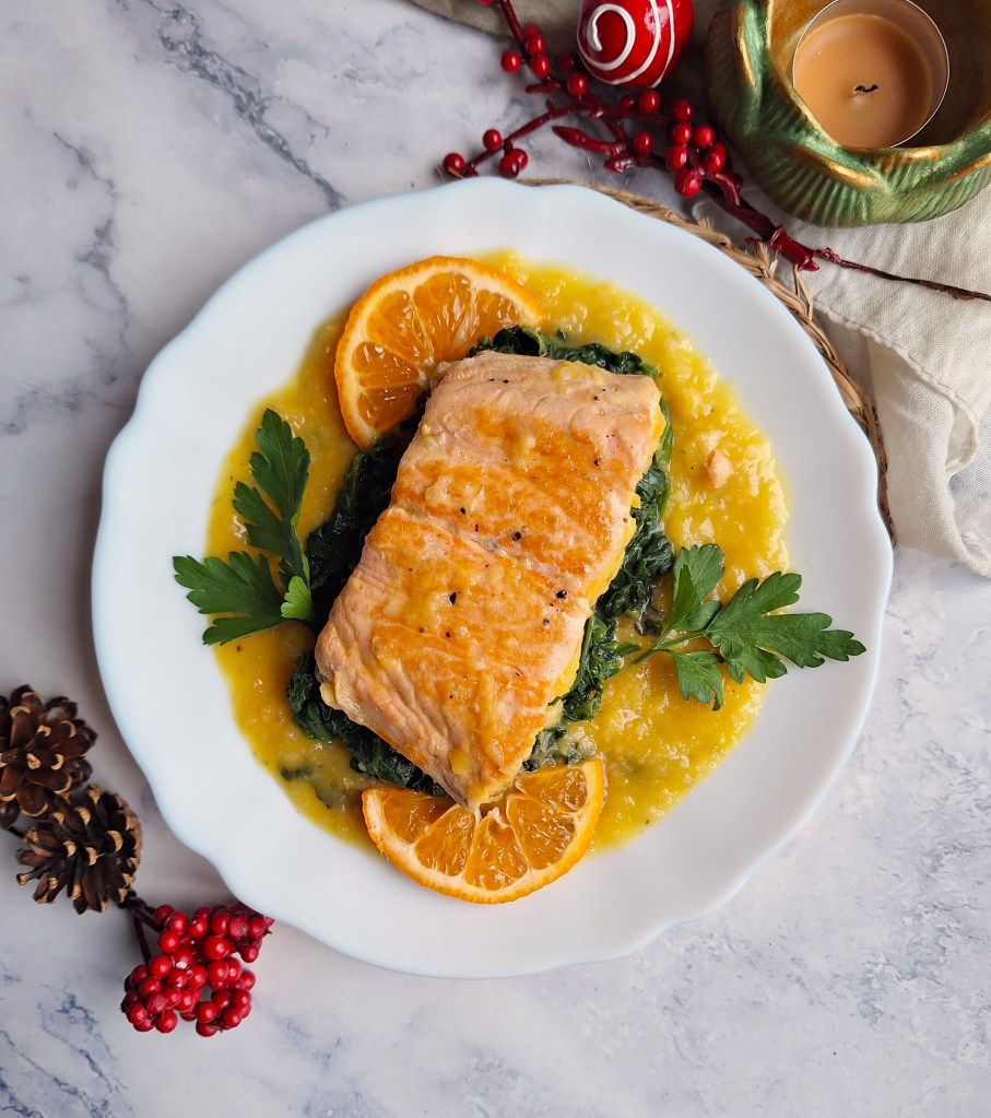 Hoy os traigo una receta de pescado, la segunda idea de plato principal de este especial. Creo que en la mayoría de las casas hay un menú de este tipo y, para mí, el mejor acompañamiento son los cítricos. Así que comparto un salmón con salsa de mandarina súper sencillo y que queda delicioso. Es un plato que no requiere demasiado tiempo y, si lo hacéis con antelación, tendrá un sabor más intenso. He acompañado con una base de espinacas para darle un toque de color al plato y también un aporte de vitaminas, así que queda una receta muy completa. Espero que os guste.