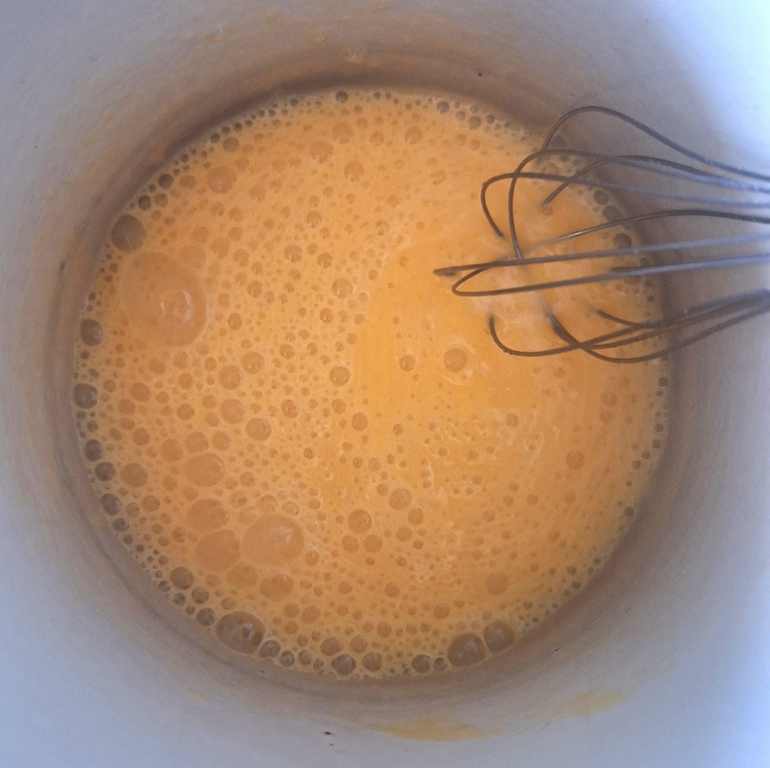 Bate los huevos con unas varillas hasta que empiecen a espumar. Añade el eritritol de tres veces y continúa batiendo hasta que triplique su volumen y haya adquirido un color blanquecino pálido.
