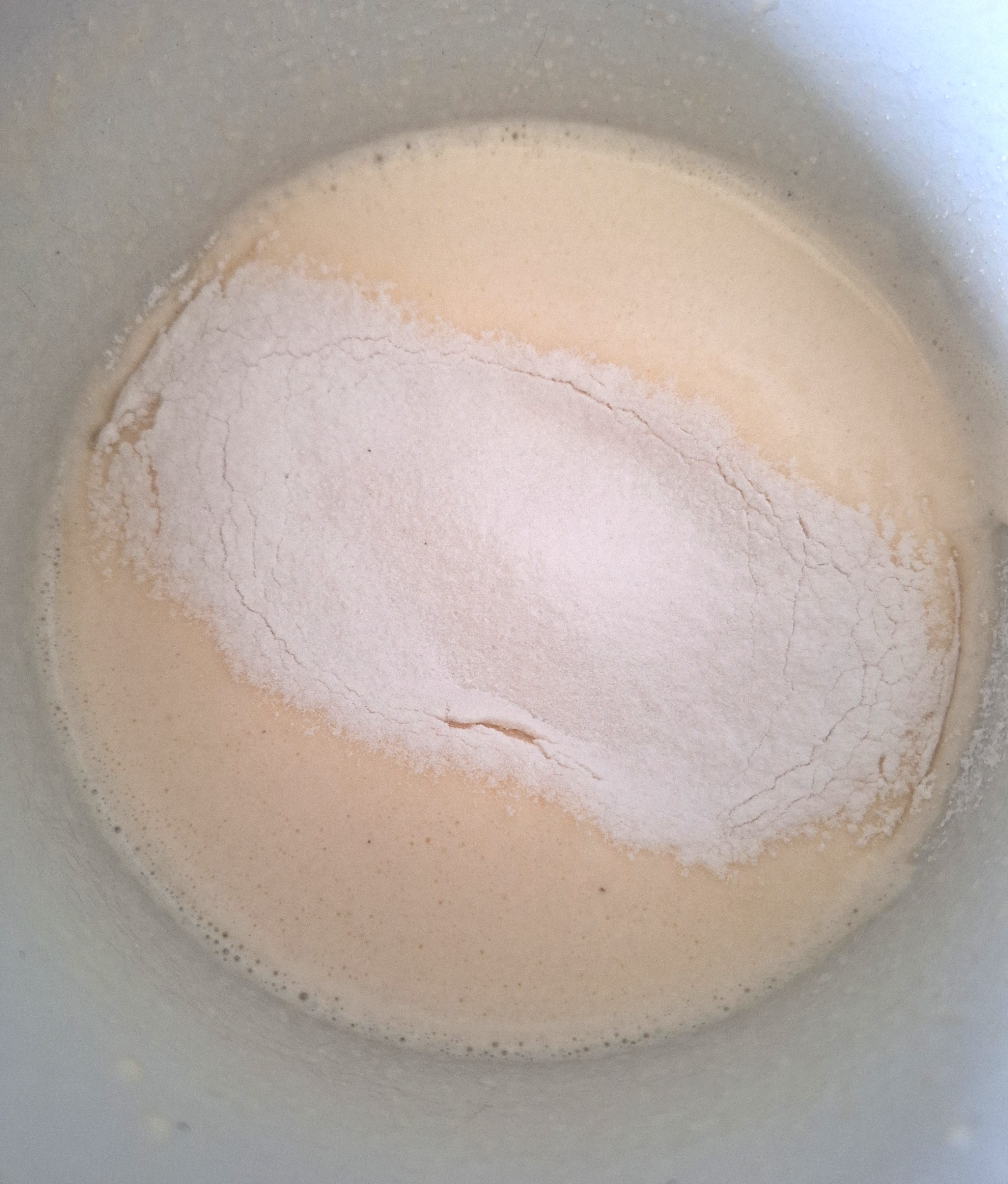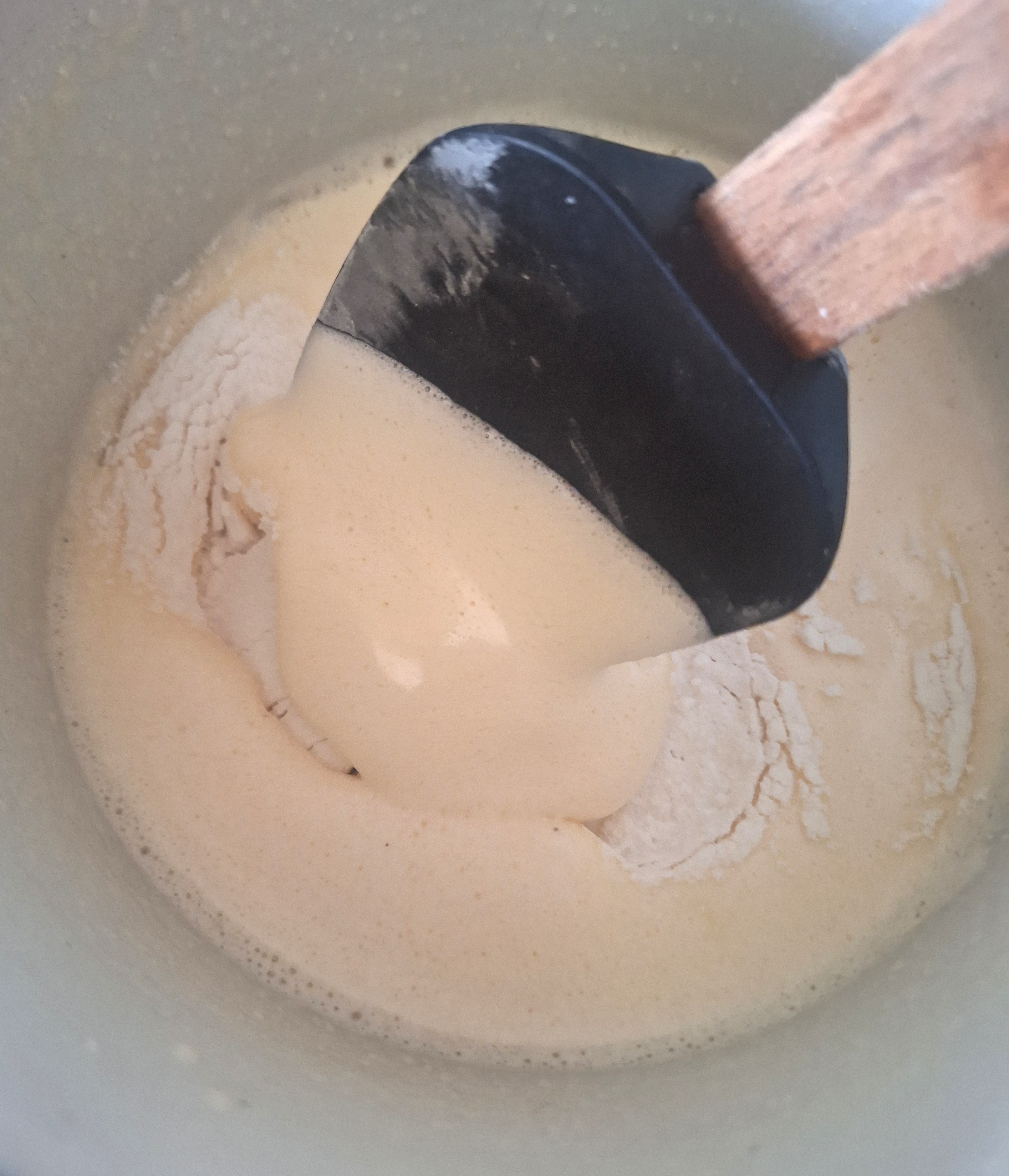 Añade las harinas tamizadas de 3 o 4 veces (yo vuelvo a tamizar en este paso) e integra con una lengua y movimientos envolventes. No añadas más harina hasta que se hayan deshecho todos los grumos.