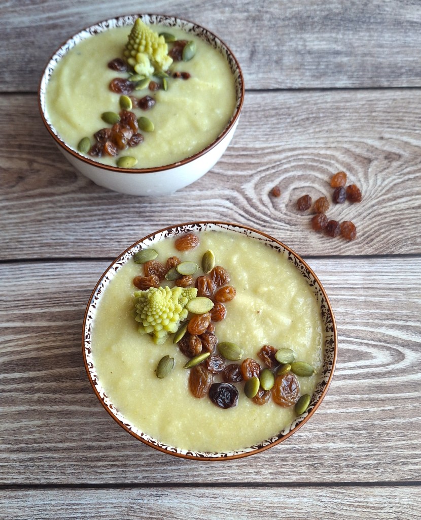 Nunca había hecho una crema de romanesco, pero he de decir que me ha sorprendido su sabor, quizá porque al llevar patata, éste se suaviza. La textura es muy cremosa y los toppings le dan un toque diferente y muy rico. El dulce de las pasas combina perfectamente con el romanesco y las semillas de calabaza aportan un puntito crujiente que me gusta mucho.