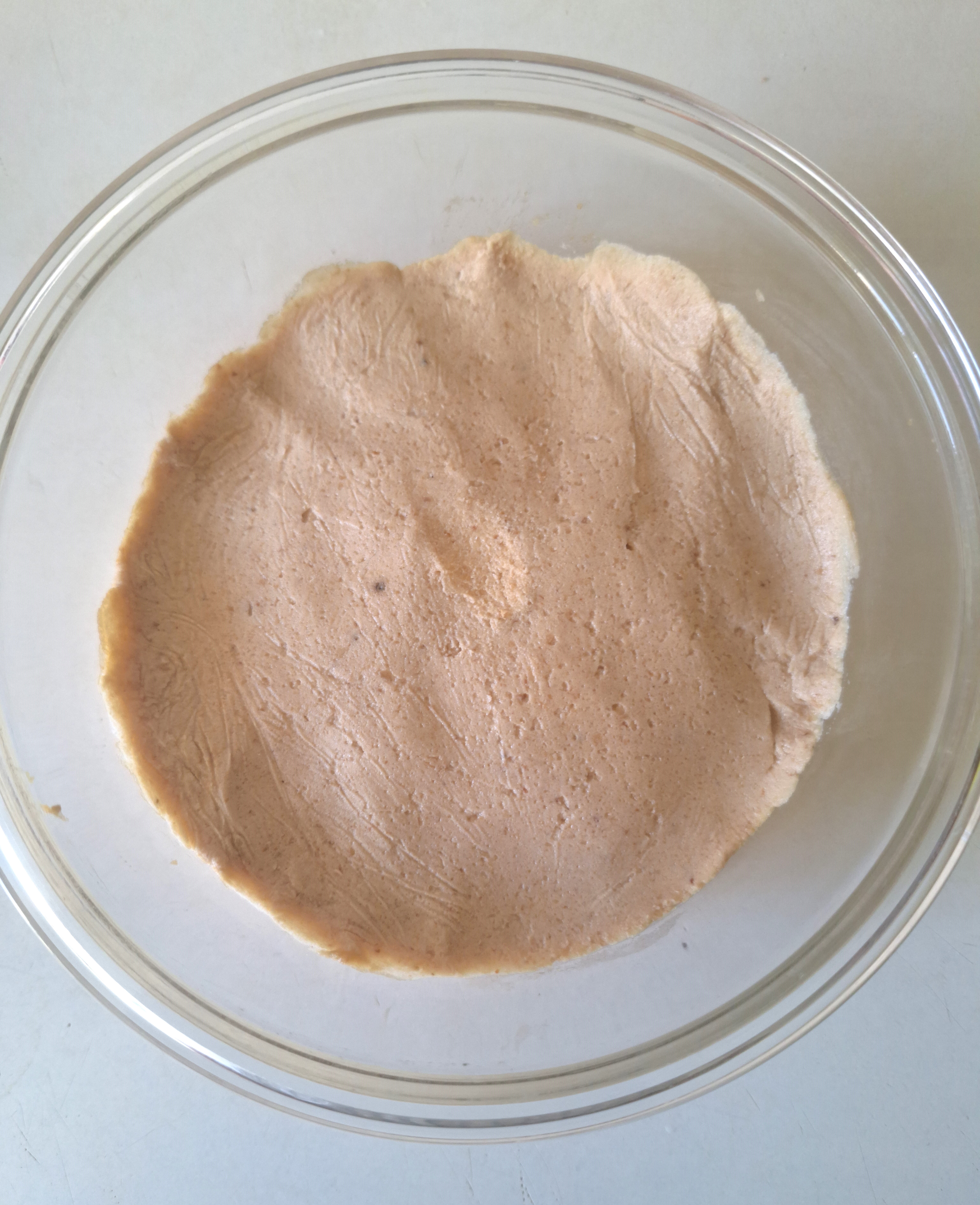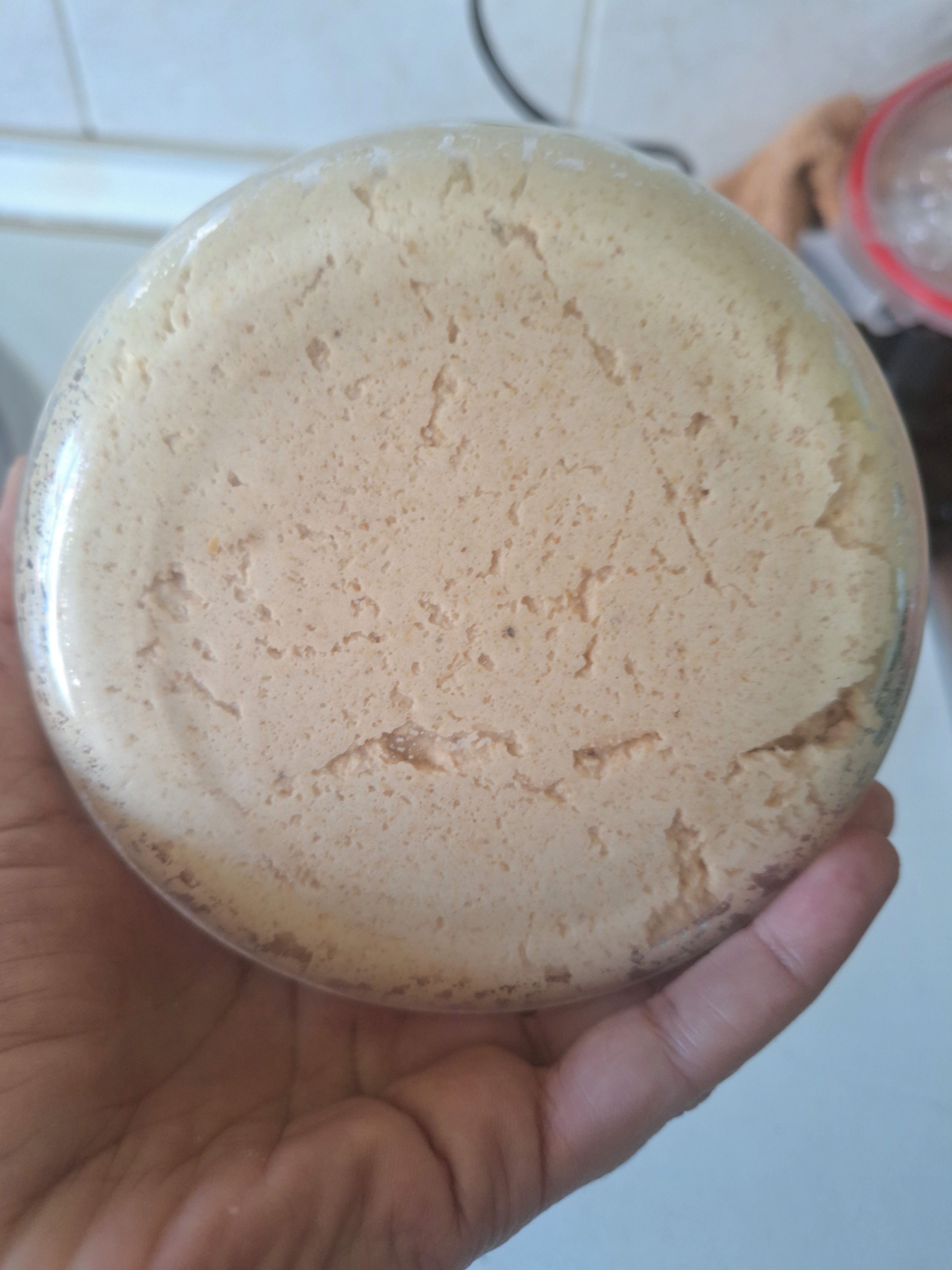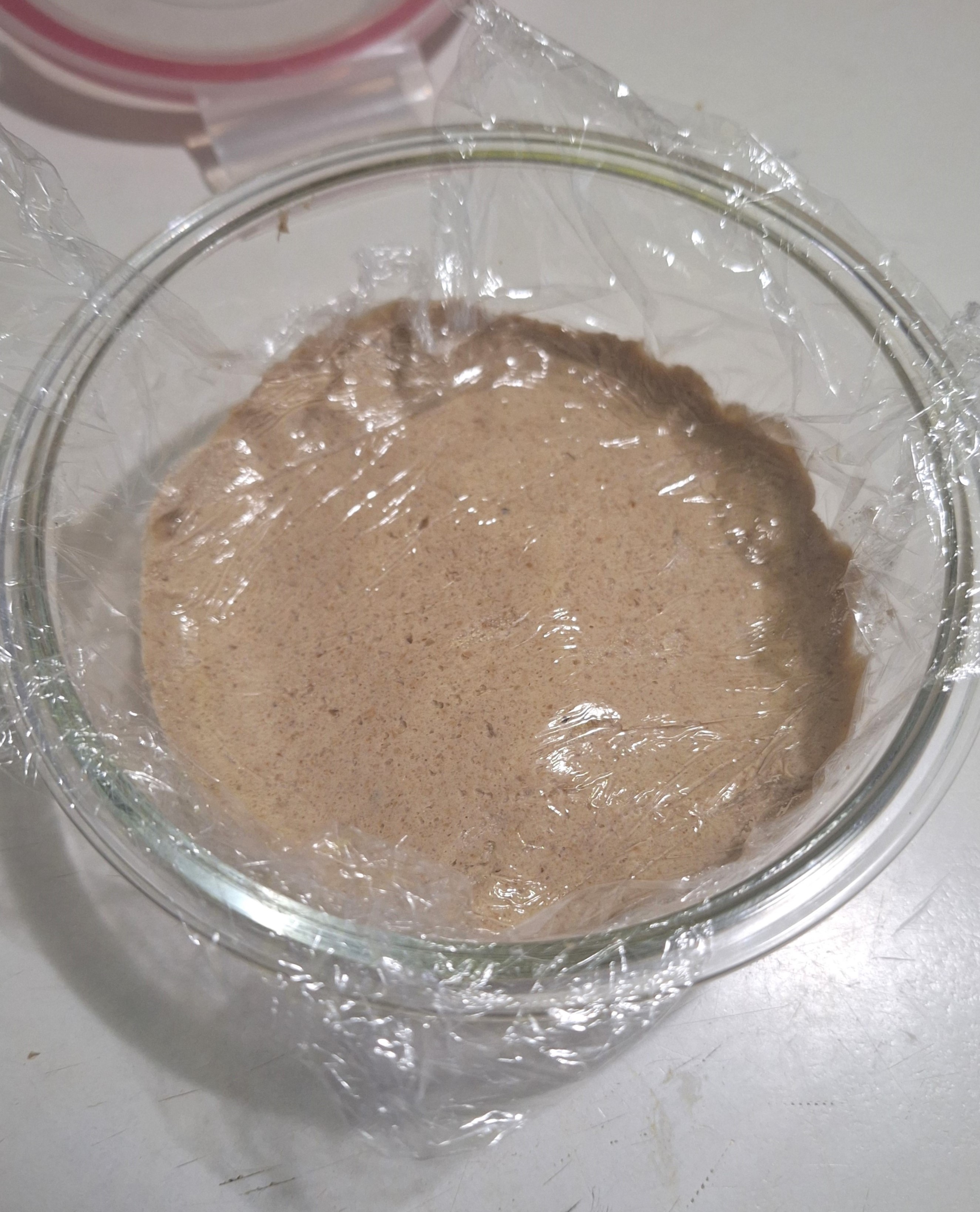 Vierte en un recipiente de cristal, cubre con film (pegando la superficie para que no entre aire) y una tapa, sin terminar de cerrar. Guarda en lugar cálido (un armario) durante 24-48 horas, hasta que la masa fermente (lo sabrás por las burbujitas y el aspecto esponjoso).