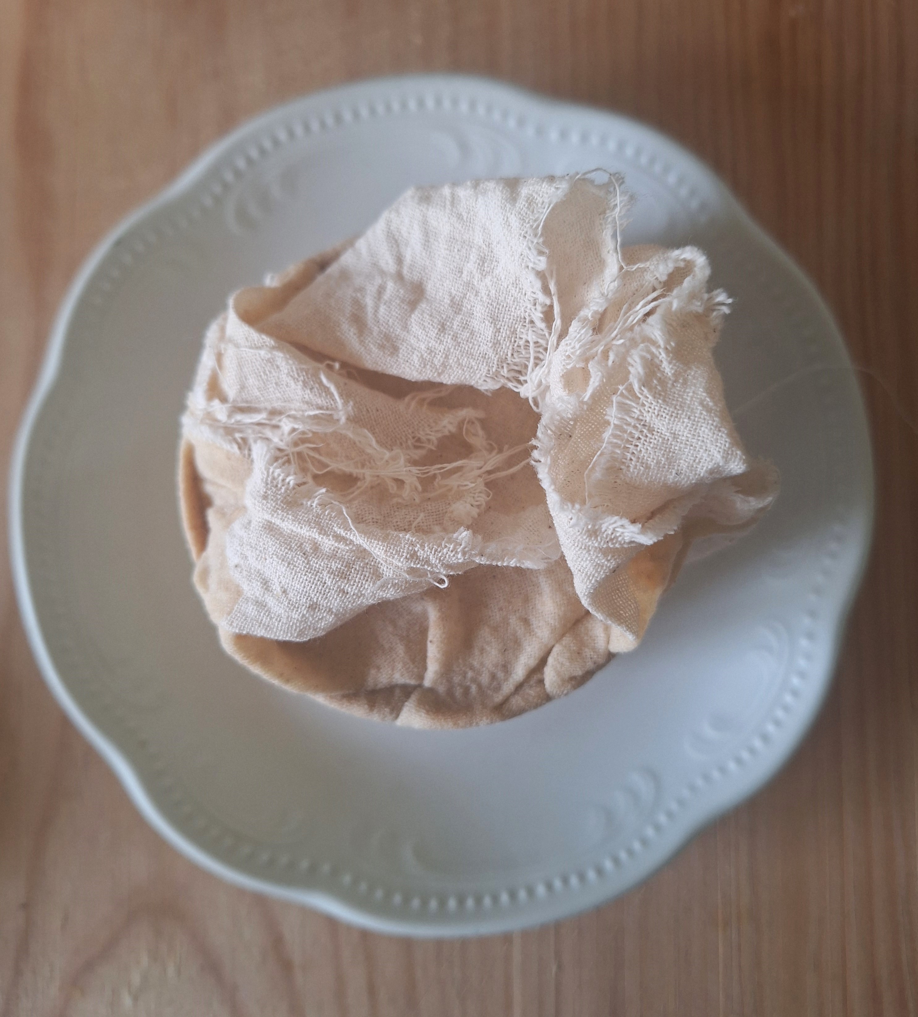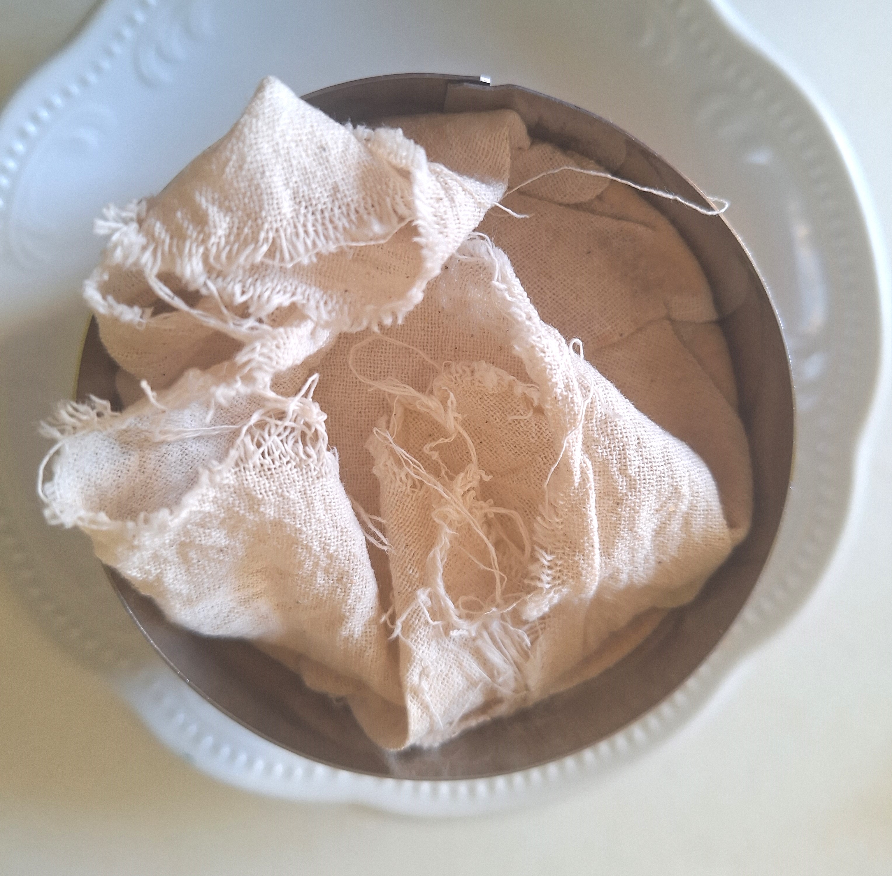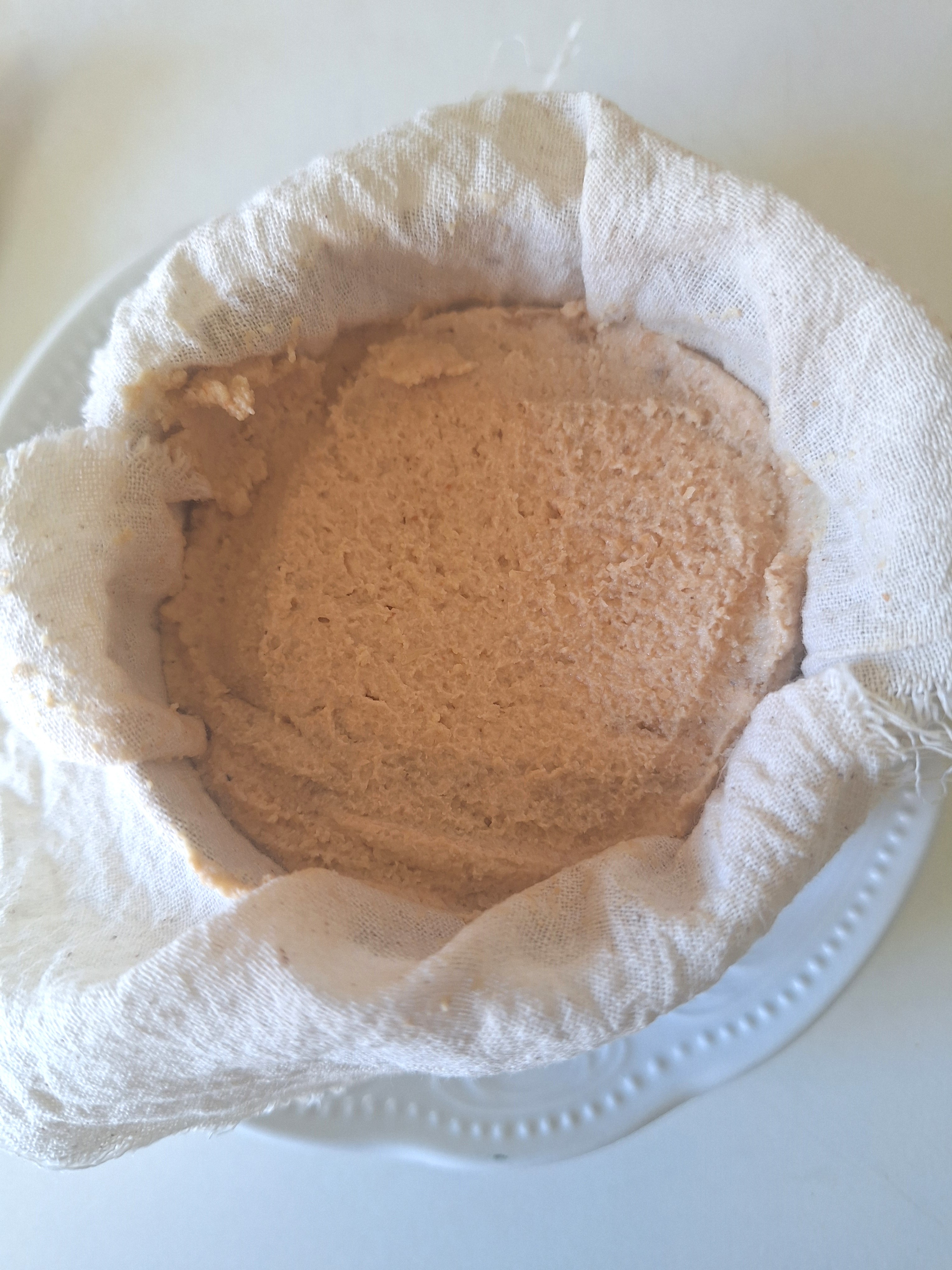 Sobre un plato coloca un aro de emplatar y cubre por dentro con tela de algodón. Vierte la masa, compacta y cubre con la tela. Lleva al frigorífico por 24 horas y coloca sobre una rejilla (puedes colocar la rejilla sobre otro recipiente para que recoja el líquido que suelte).