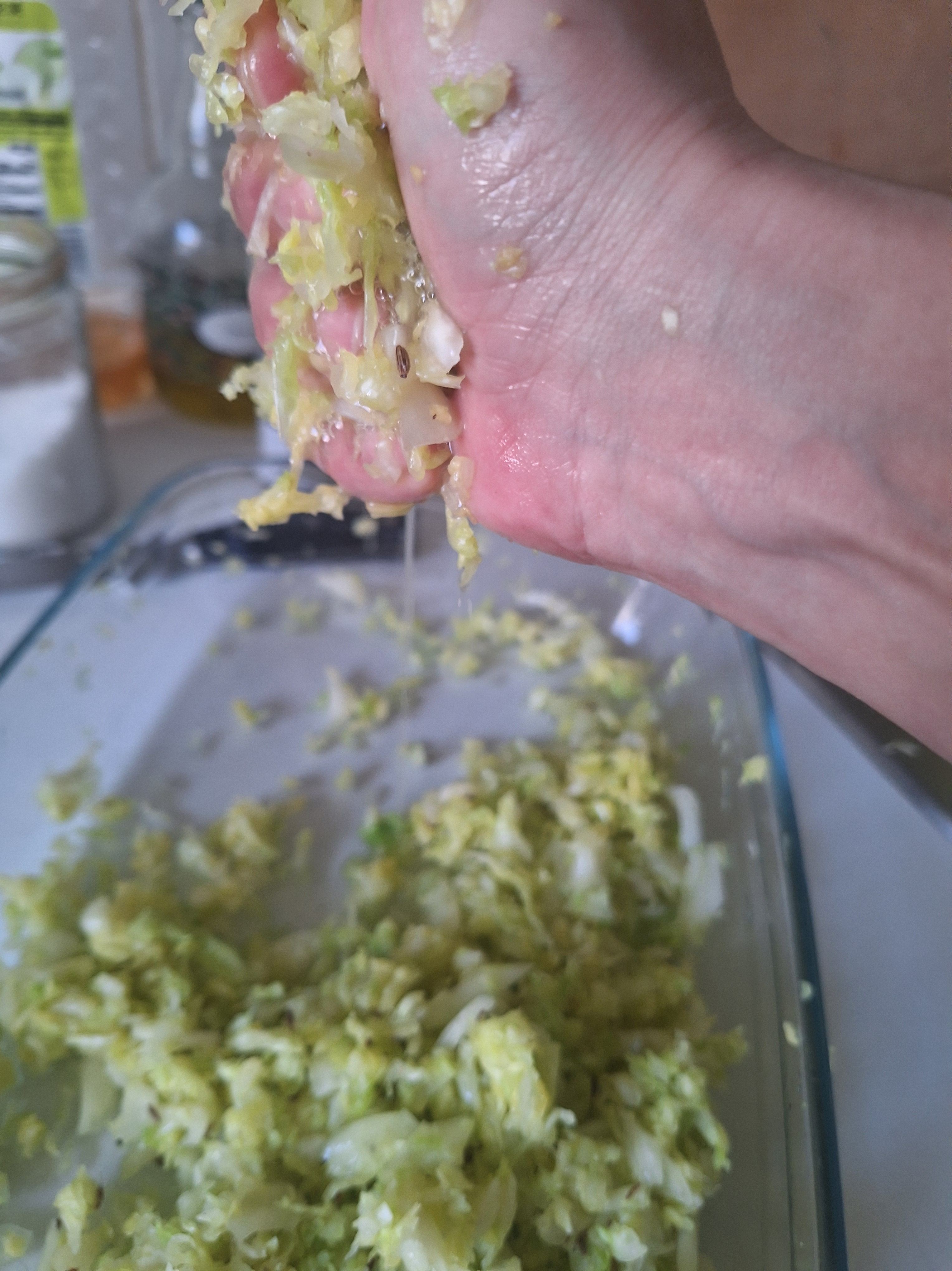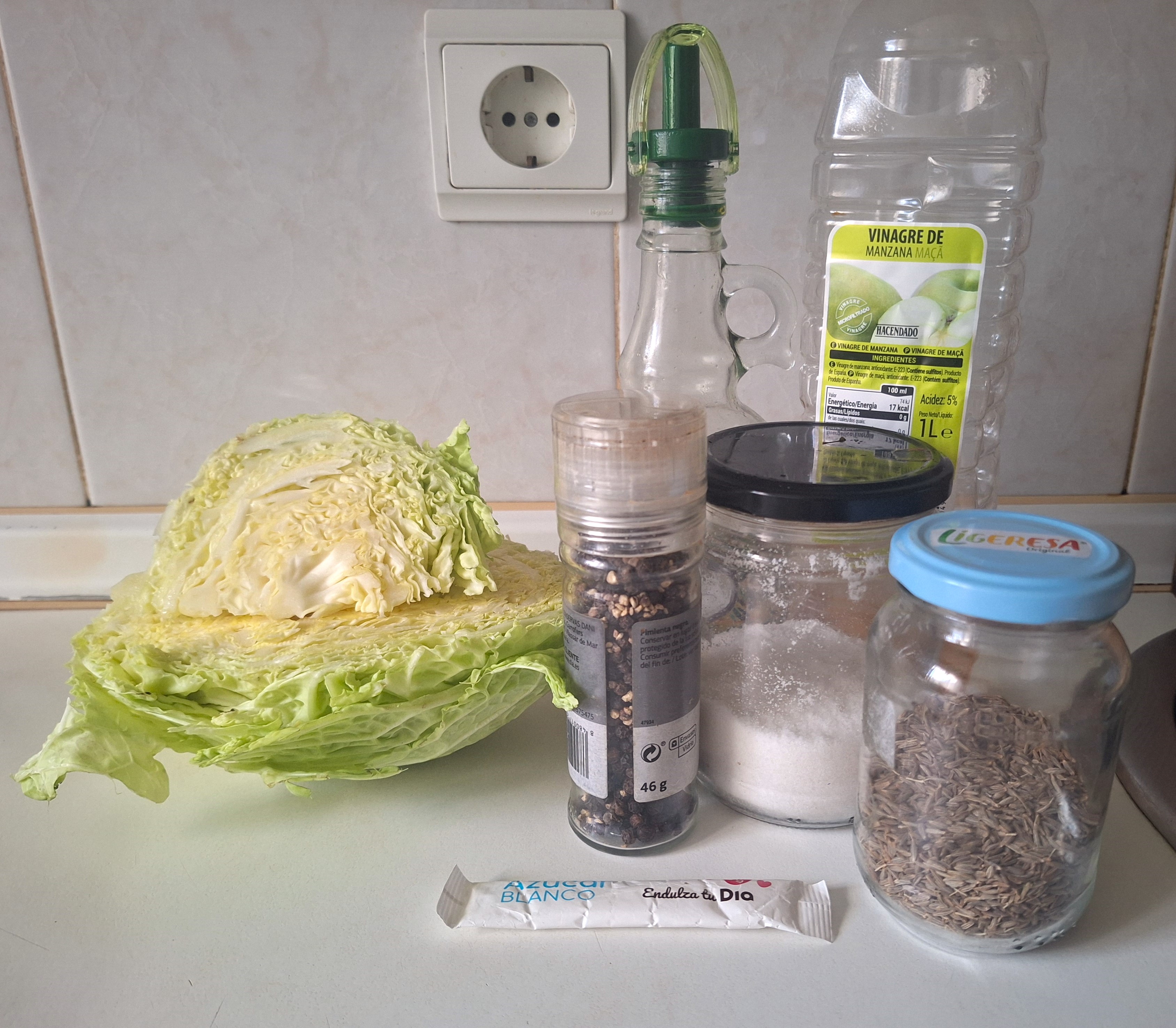 Retira las hojas externas del repollo, corta a la mitad y después en juliana fina. Coloca en una ensaladera y añade la sal y la pimienta. Estruja con las manos para que suelte el agua (hazlo con fuerza porque de lo contrario quedará un color grisáceo-marrón). Añade el comino en grano y el azúcar y sigue estrujando. Por último, el vinagre. Prueba y ajusta los ingredientes. Una vez tengas todo mezclado añade el aceite.