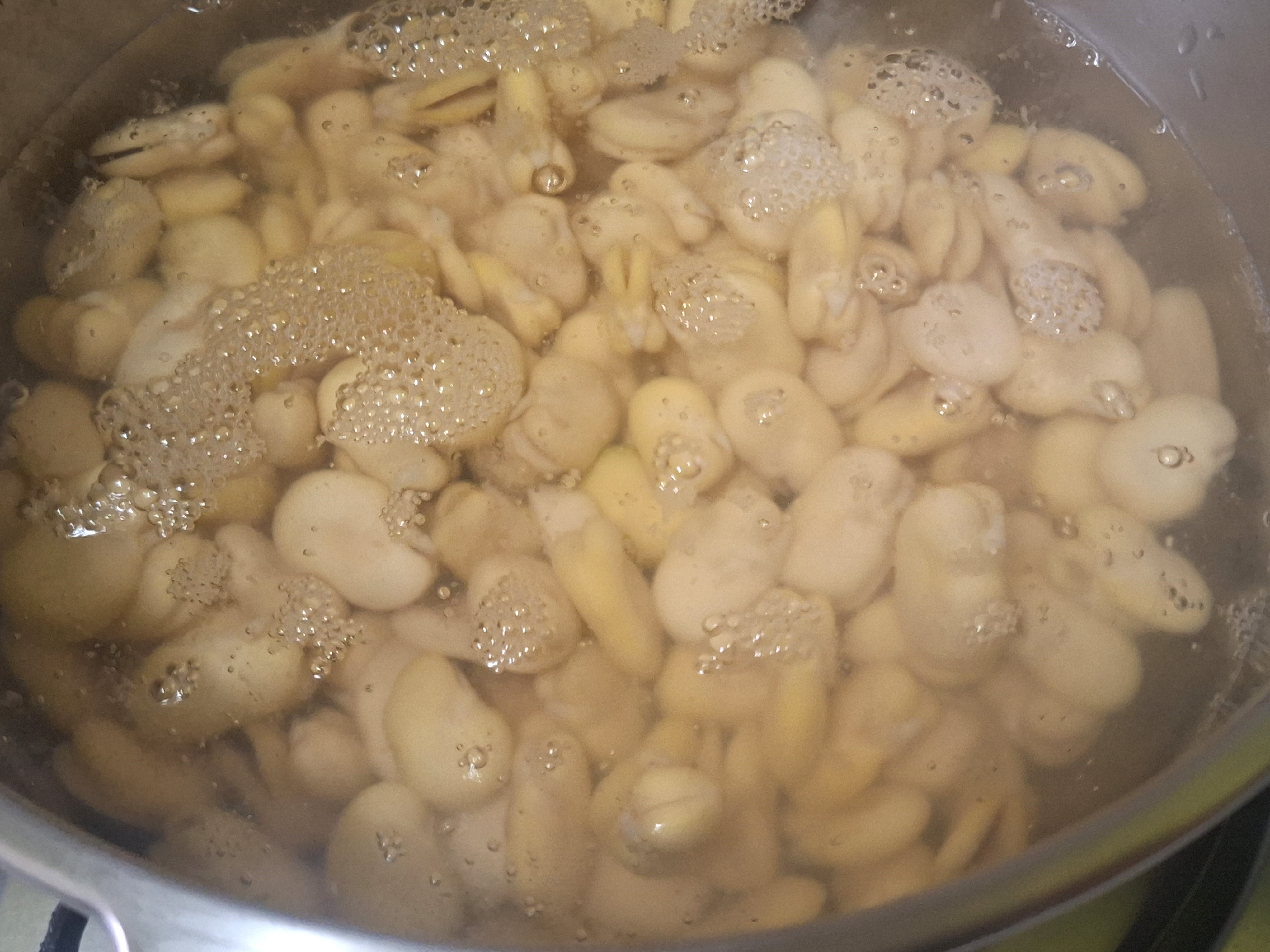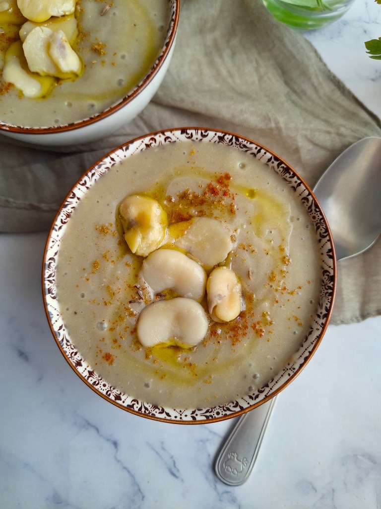 Pon las habas en remojo durante 24 horas. Escurre y retira la piel (lleva un ratito, pero queda una crema más suave y se tritura mejor).