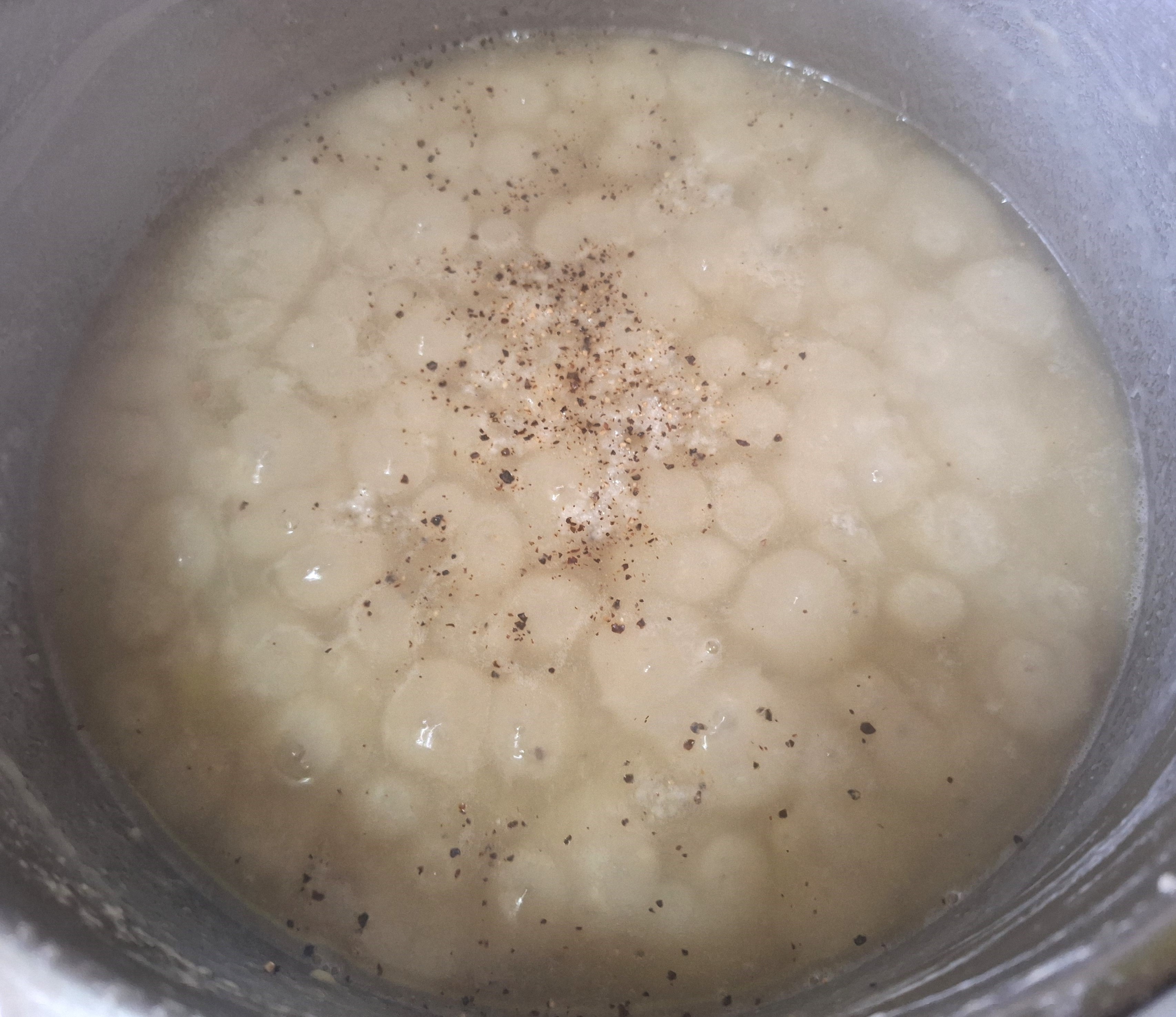 Pon un litro de agua a hervir en una olla grande y añade las habas y el ajo machado (en mi caso se ha omitido). Baja a fuego medio, sazona y cocina unos 45 minutos, espumando de vez en cuando. Recuerda sacar algunas habas enteras (antes de que se deshagan) para decorar. Tritura con la batidora, rectifica de sal y ajusta la textura a tu gusto.
